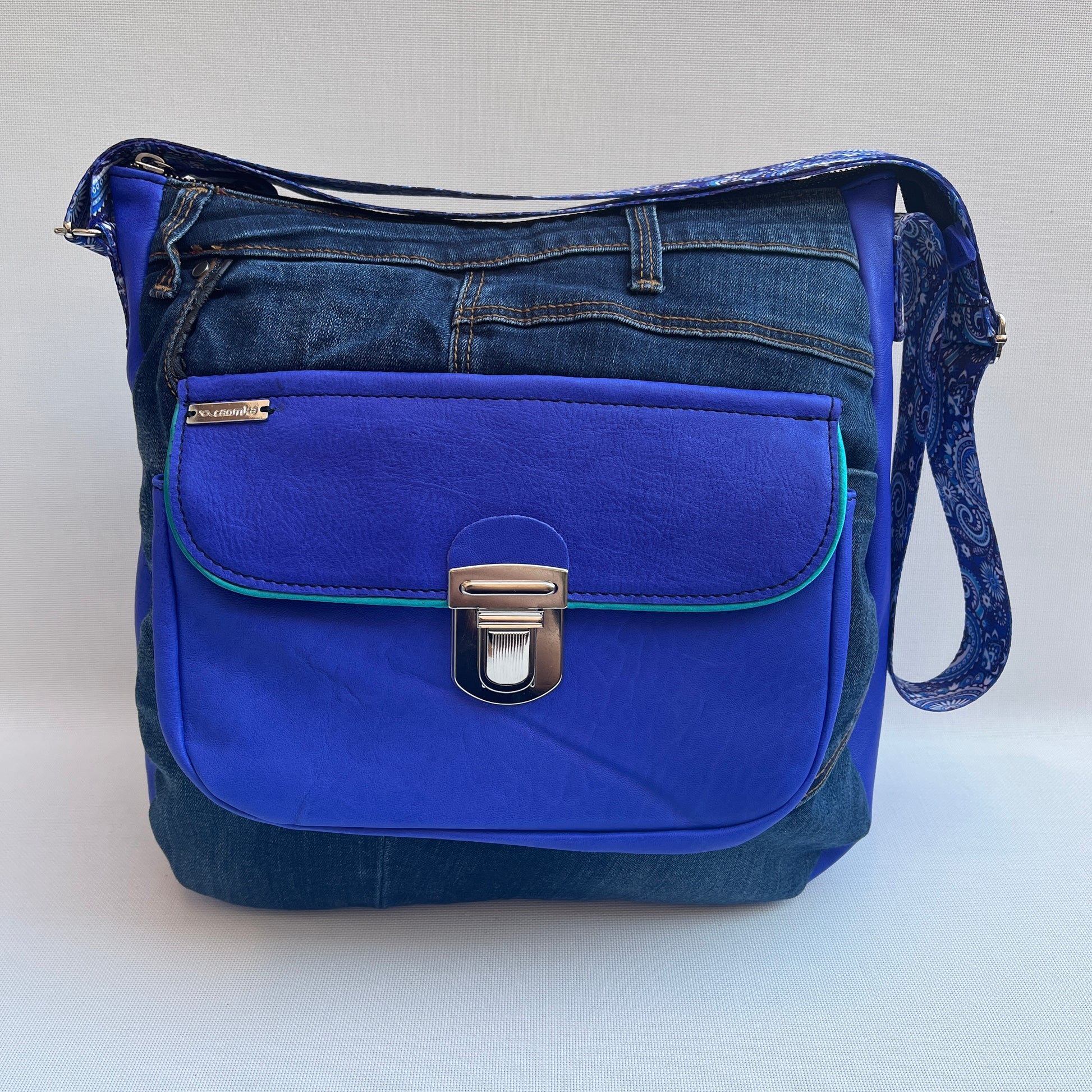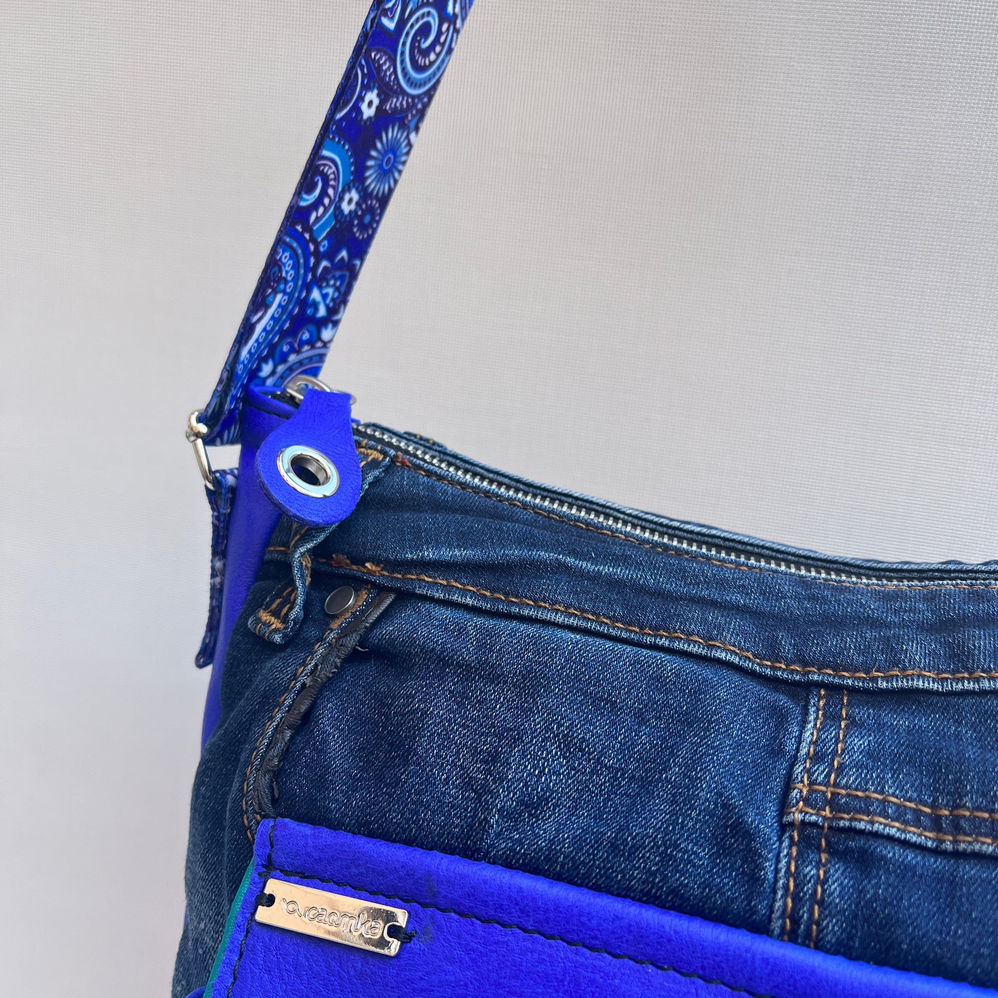 Caomka Tragetasche aus BioCuir® Naturleder und Stoff aus wiederverwendeten Jeans.