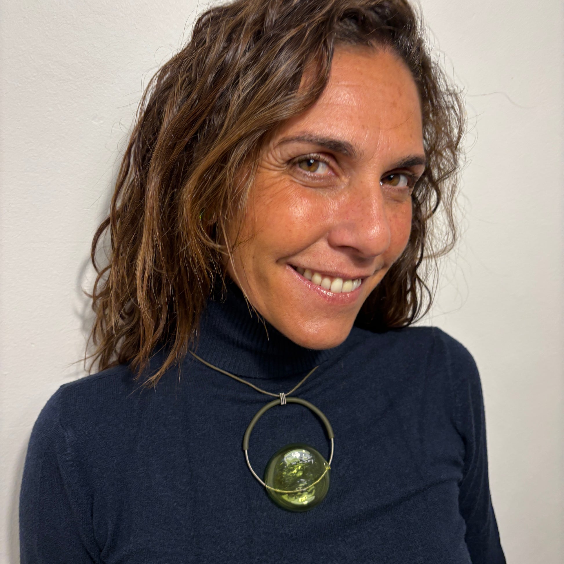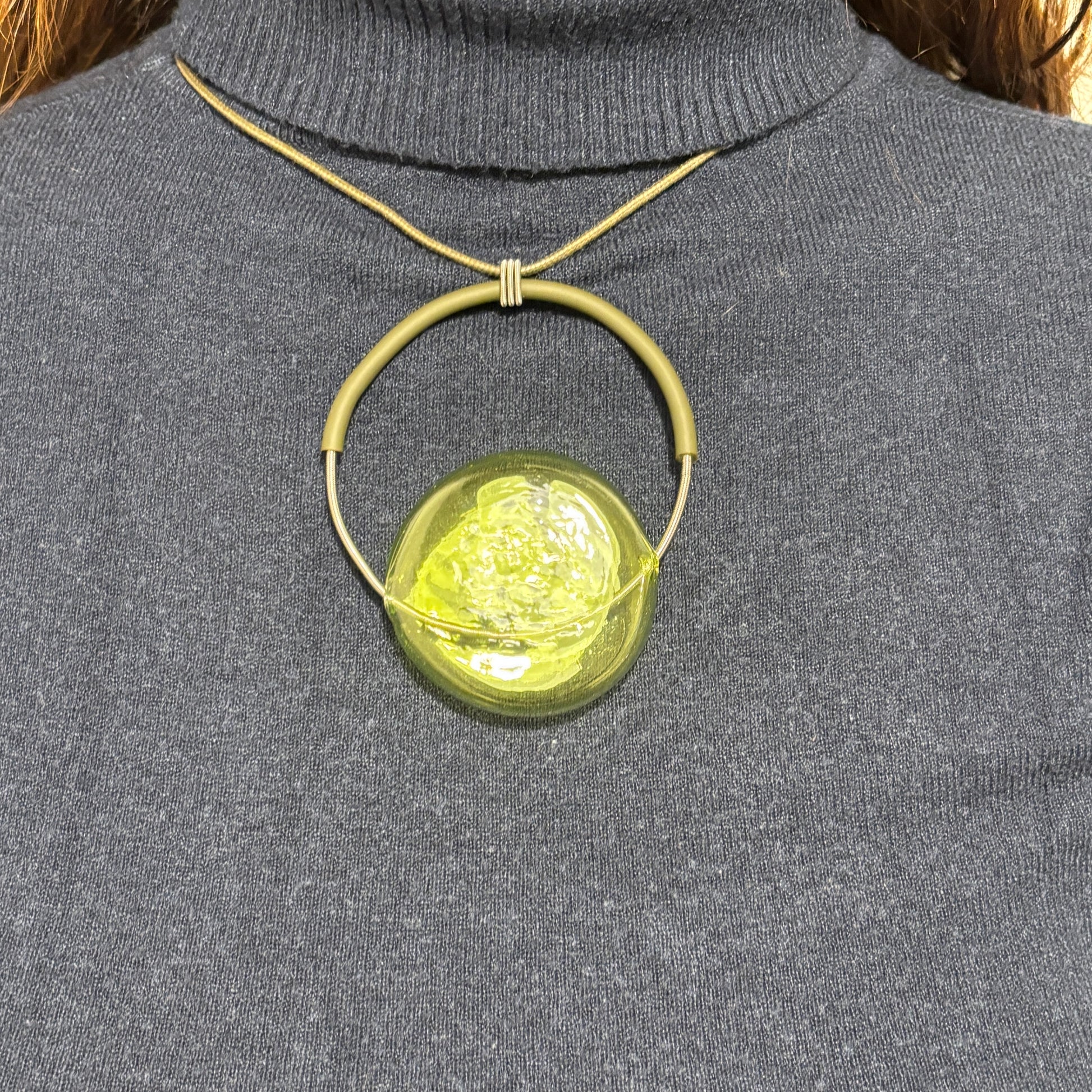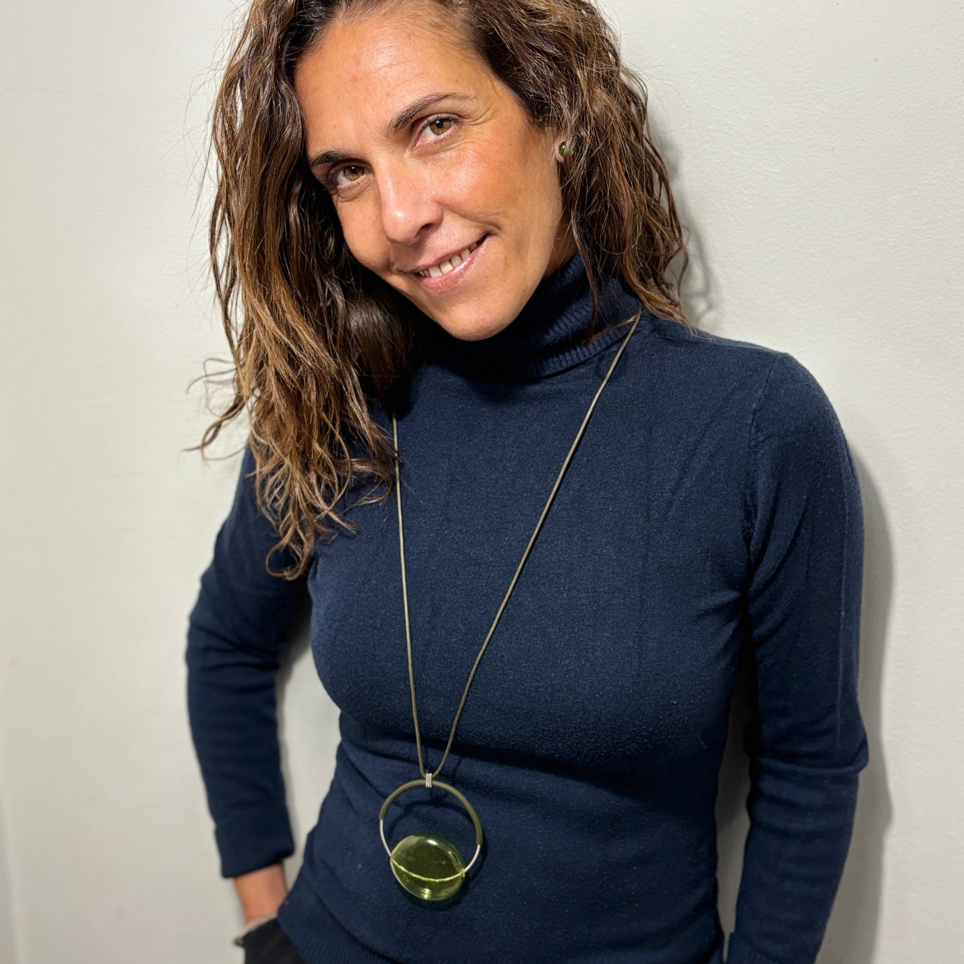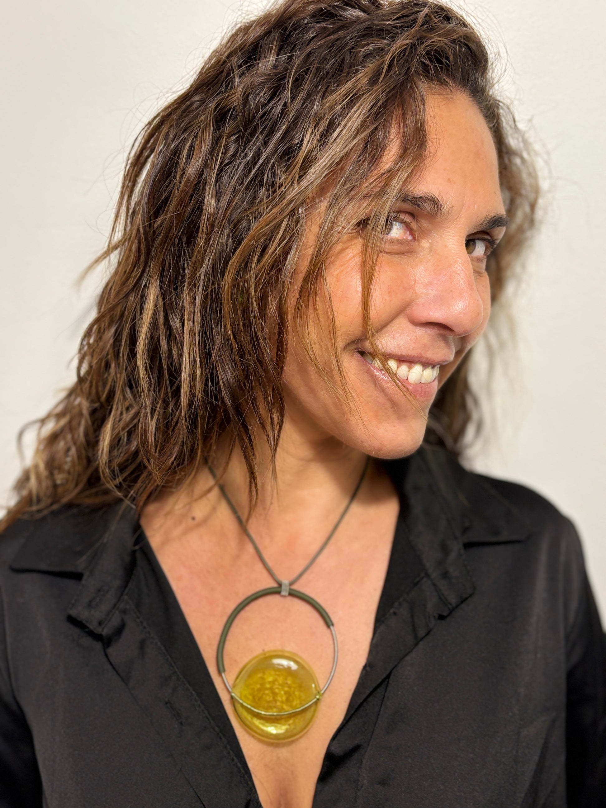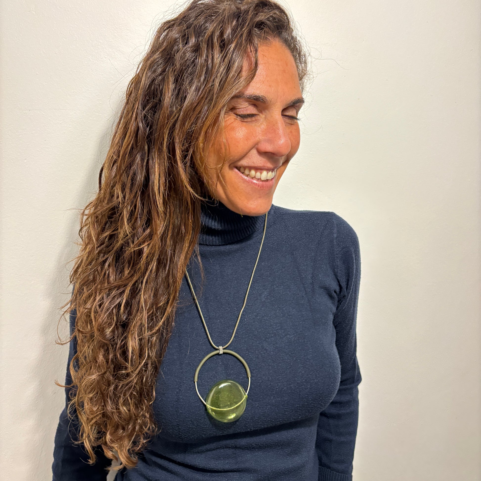 El collar destaca por su estructura circular en acero y PVC, que sostiene una perla de vidrio de Murano trabajada a soplete, totalmente transparente. Su gran singularidad es que puede ajustarse a cualquier altura, permitiendo llevarlo más corto o más largo según el momento, el escote o el gesto que quieras marcar.