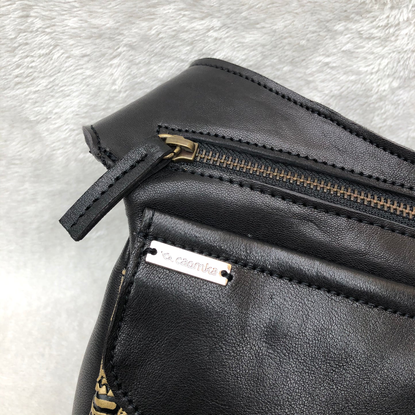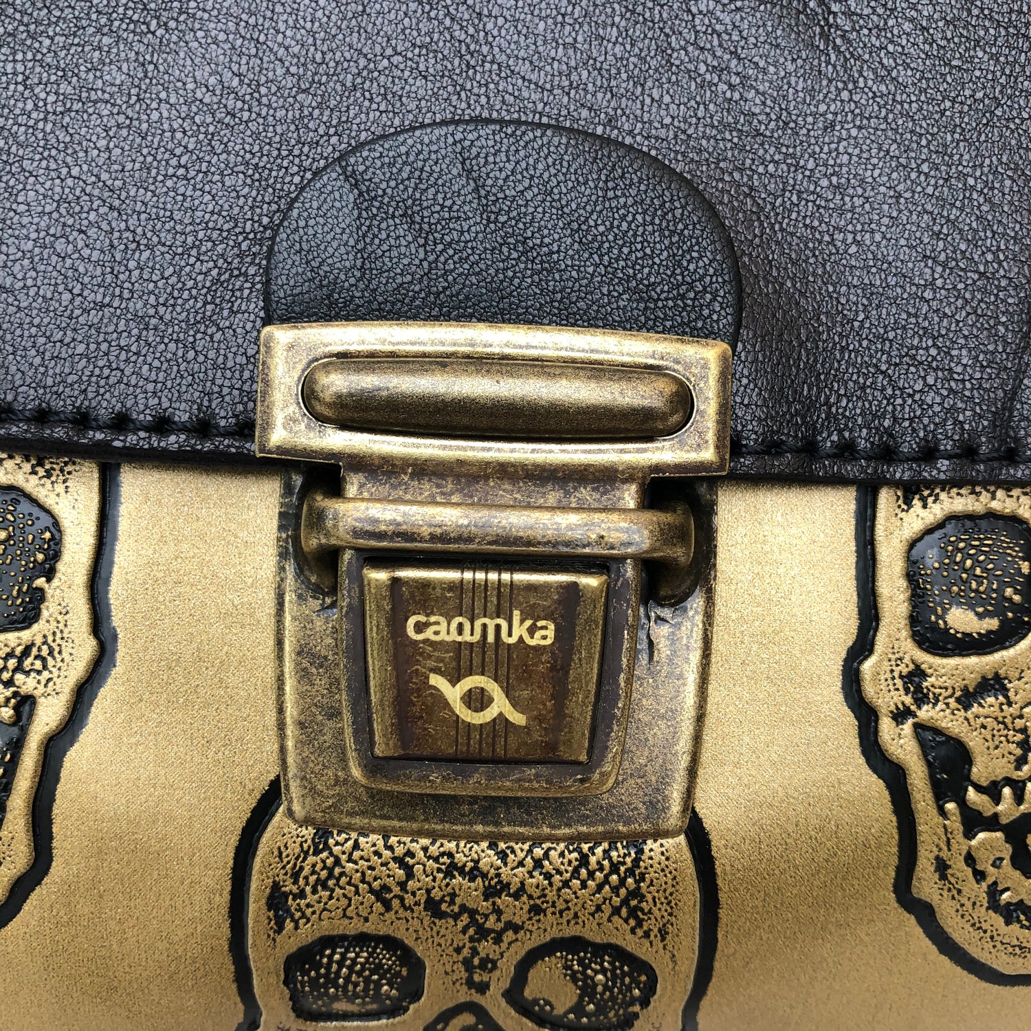 Spezieller "Vintage"-Verschluss in Altgoldfarbe mit Caomka-Gravur.