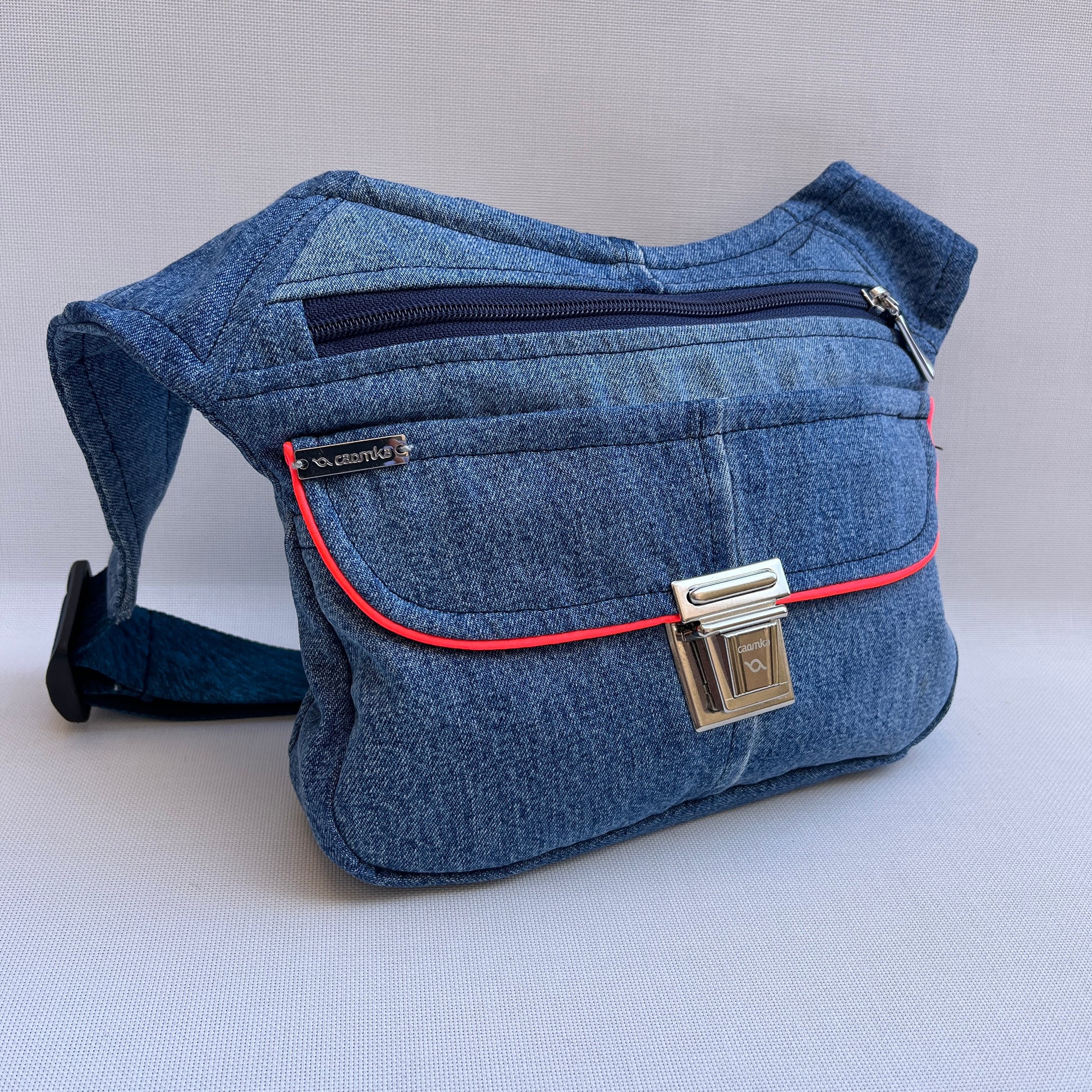 uMultifunktionale Hüfttasche (Fan Bag - Bag - Shoulder Bag) aus widerstandsfähigem und recyceltem Denim-Stoff.