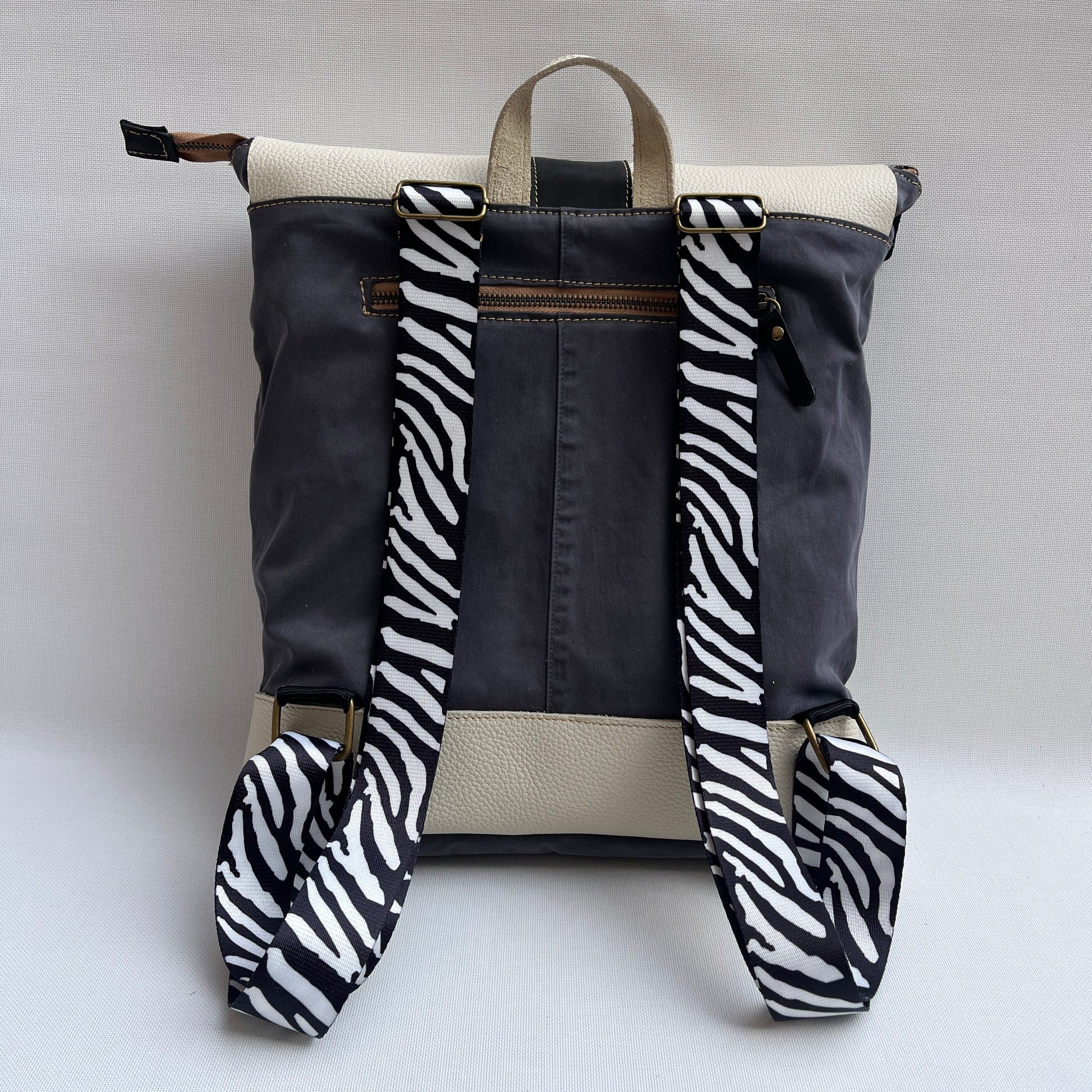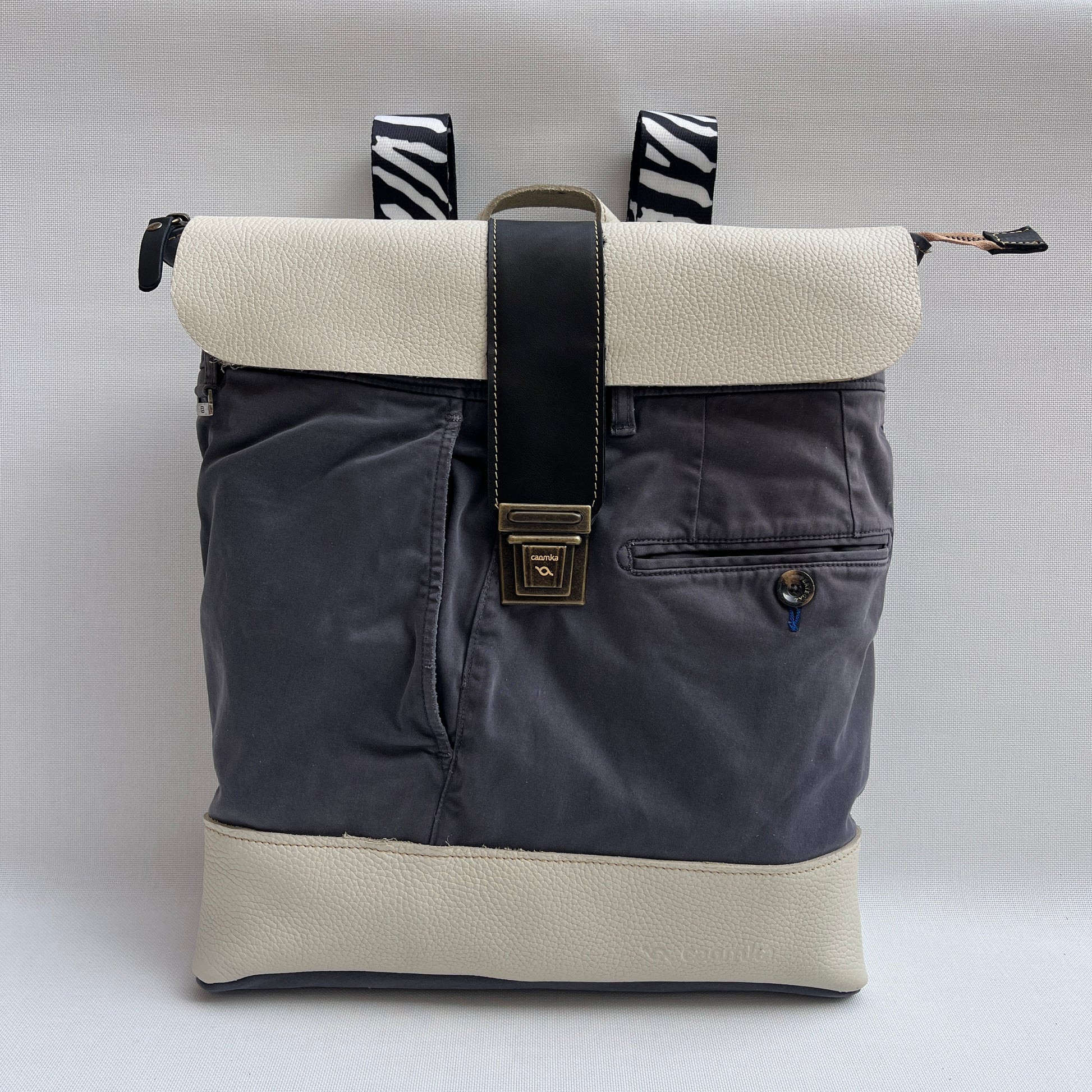 Mochila Caomka ultraligera confeccionada con tejido procedente de vaqueros reutilizados combinados con piel/cuero.