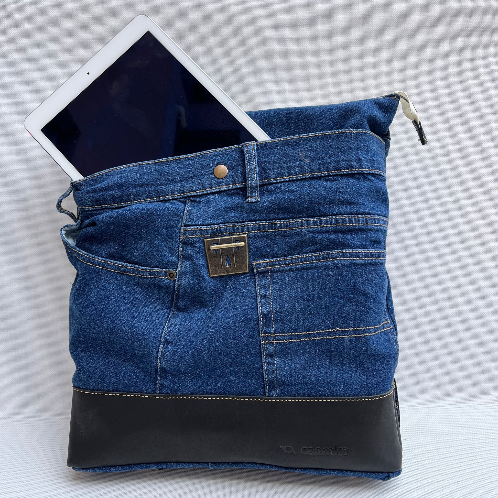 Mochila Caomka ultraligera confeccionada con tejido procedente de vaqueros reutilizados combinados con piel/cuero.