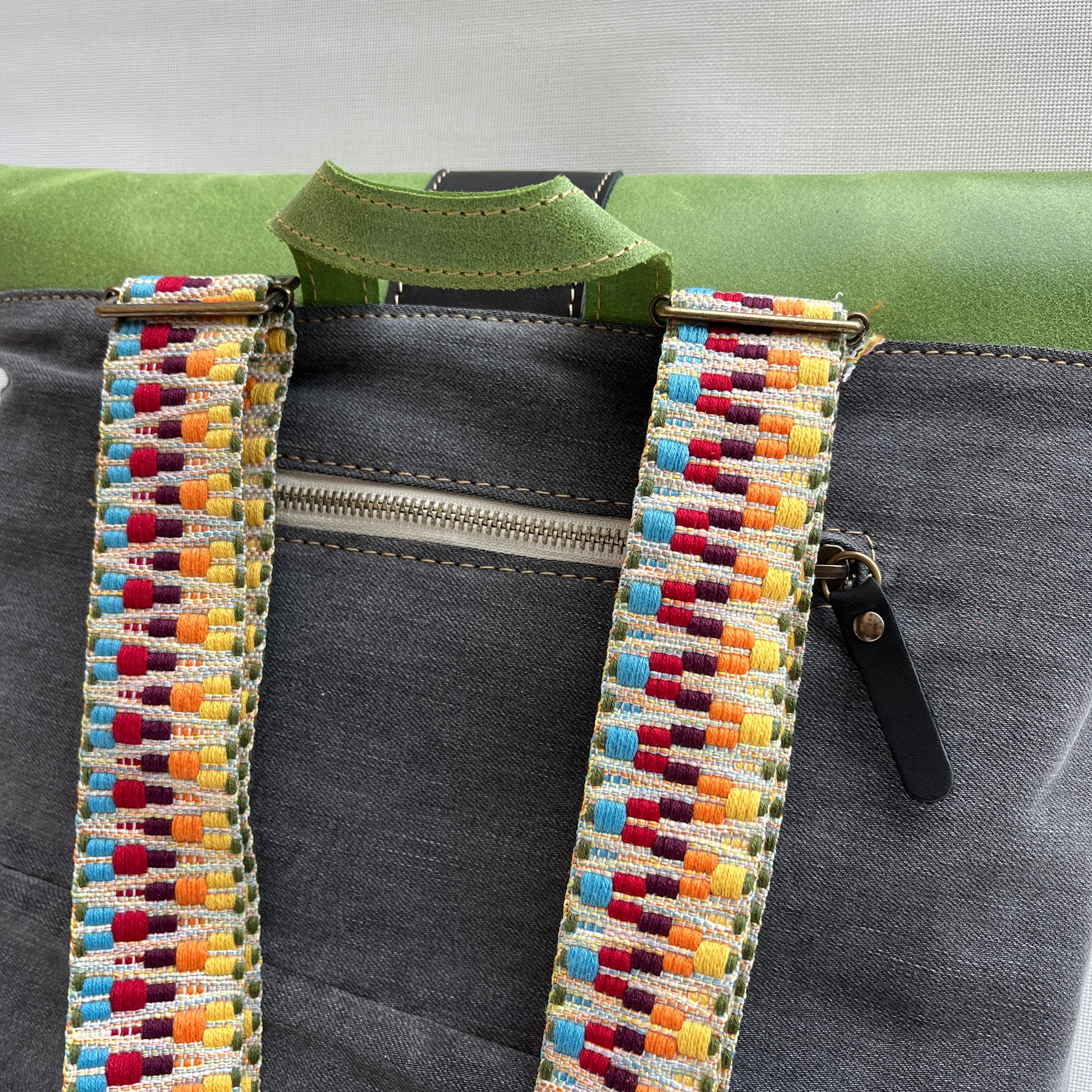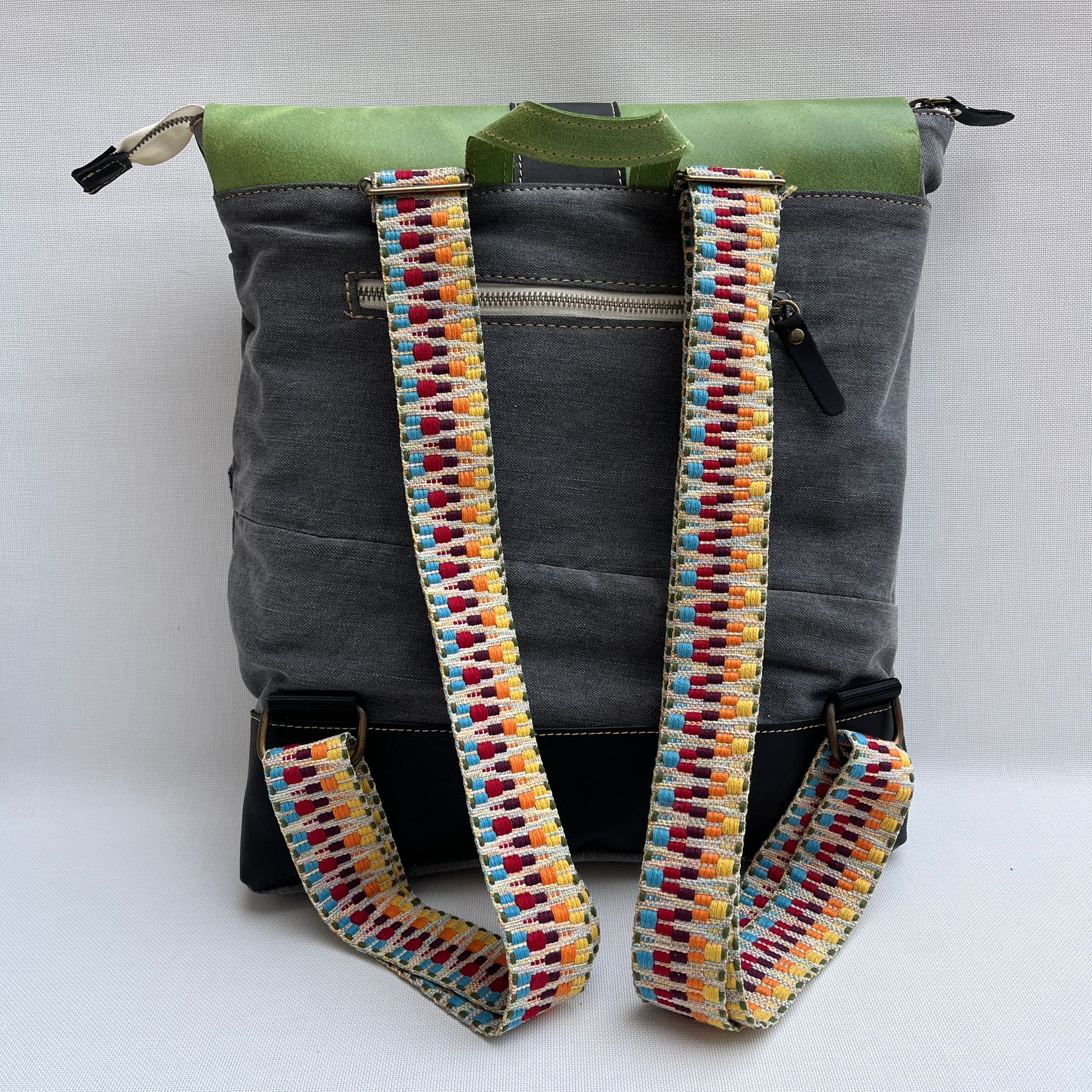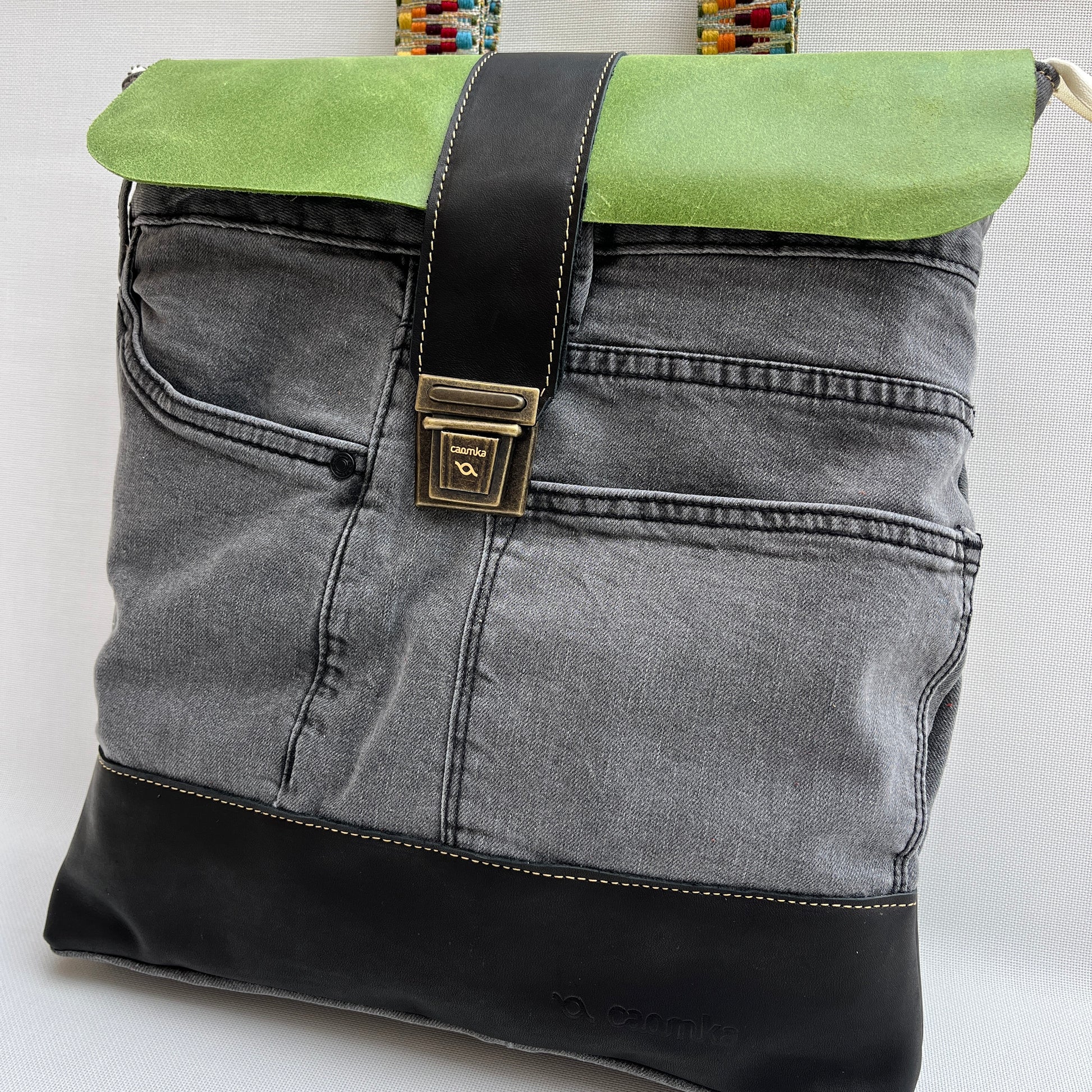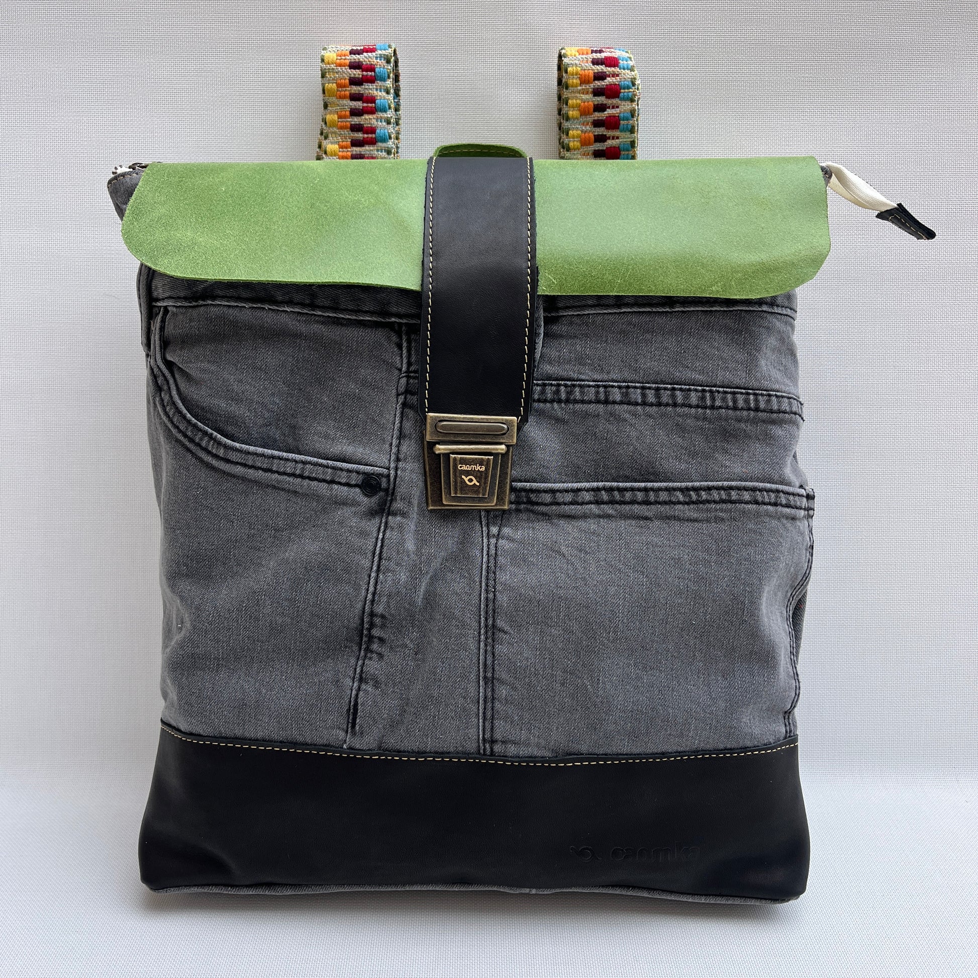 Mochila Caomka ultraligera confeccionada con tejido procedente de vaqueros reutilizados combinados con piel/cuero.