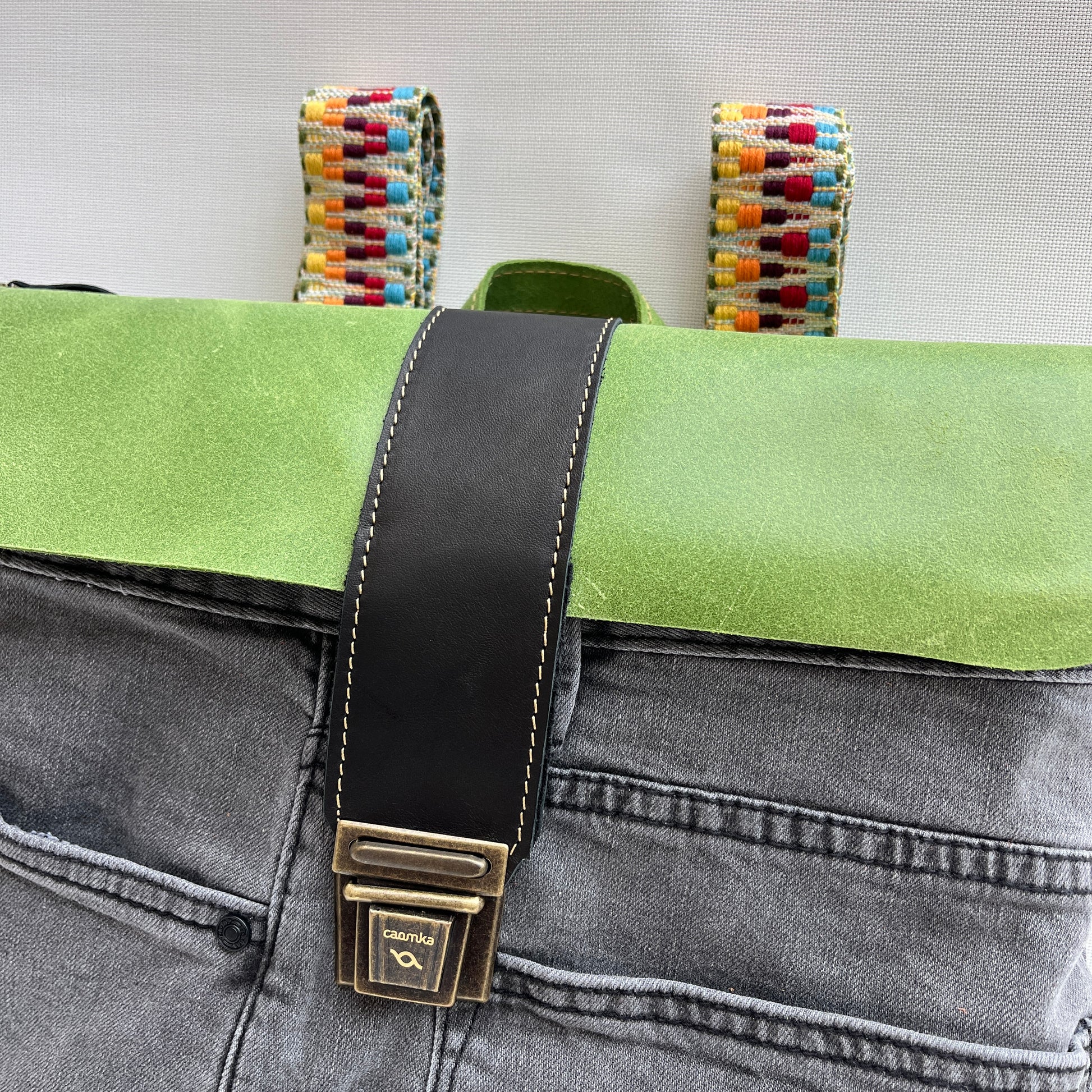 Bolsillo principal delantero en cuero en color contrastado al estilo y personalidad Caomka con cierre vintage "Click Clack" en color oro viejo.