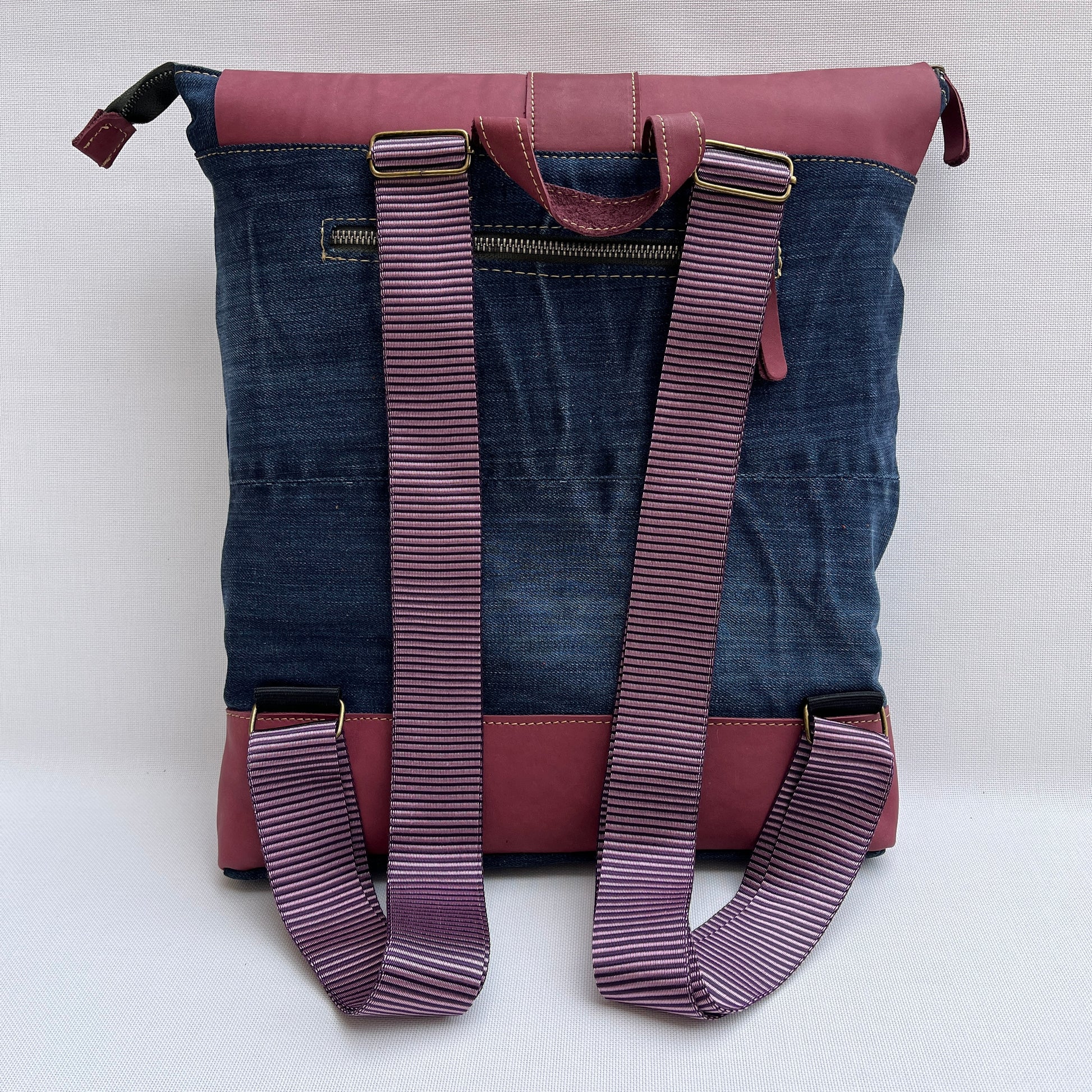 Mochila Caomka ultraligera confeccionada con tejido procedente de vaqueros reutilizados combinados con piel/cuero.
