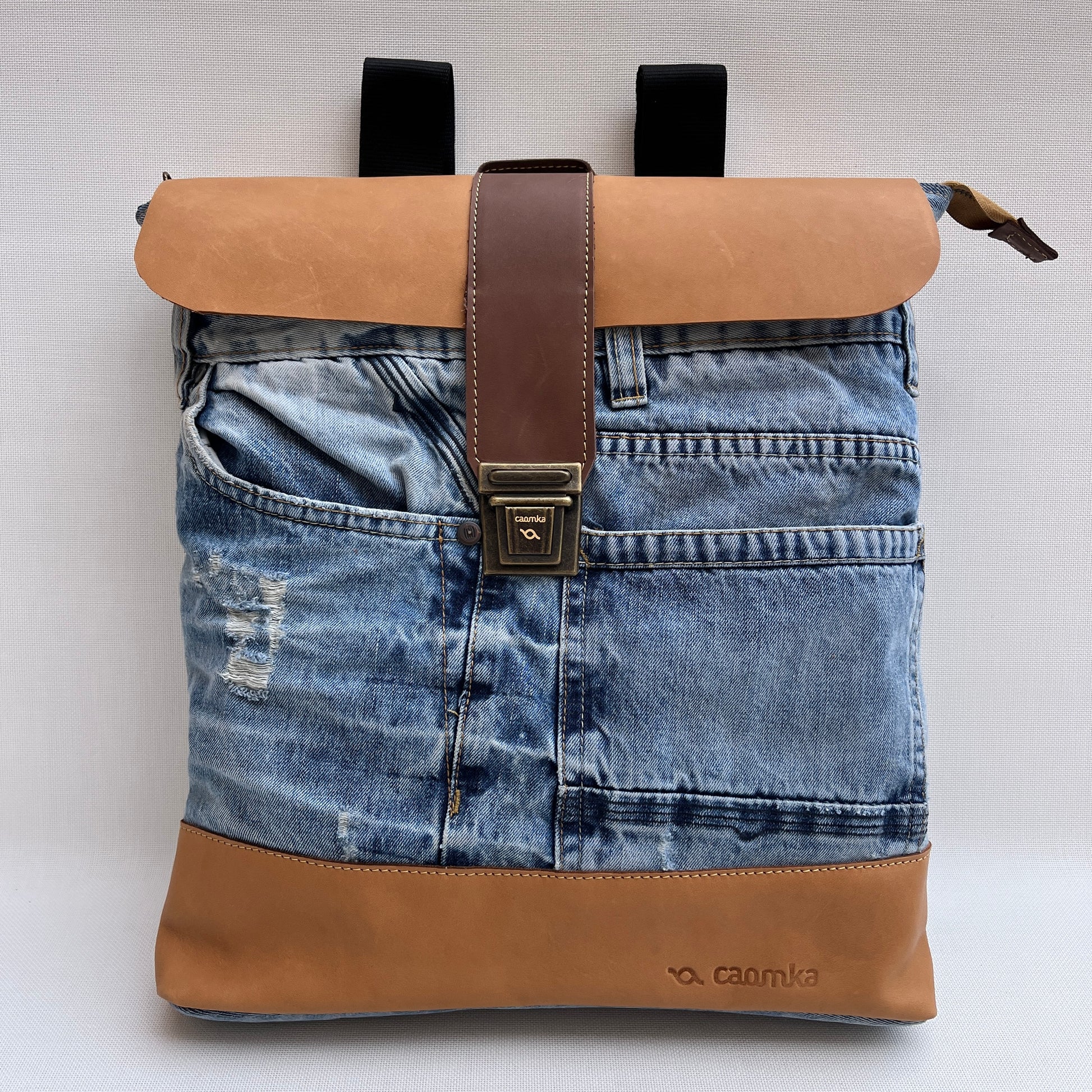 Mochila Caomka ultraligera confeccionada con tejido procedente de vaqueros reutilizados combinados con piel/cuero.