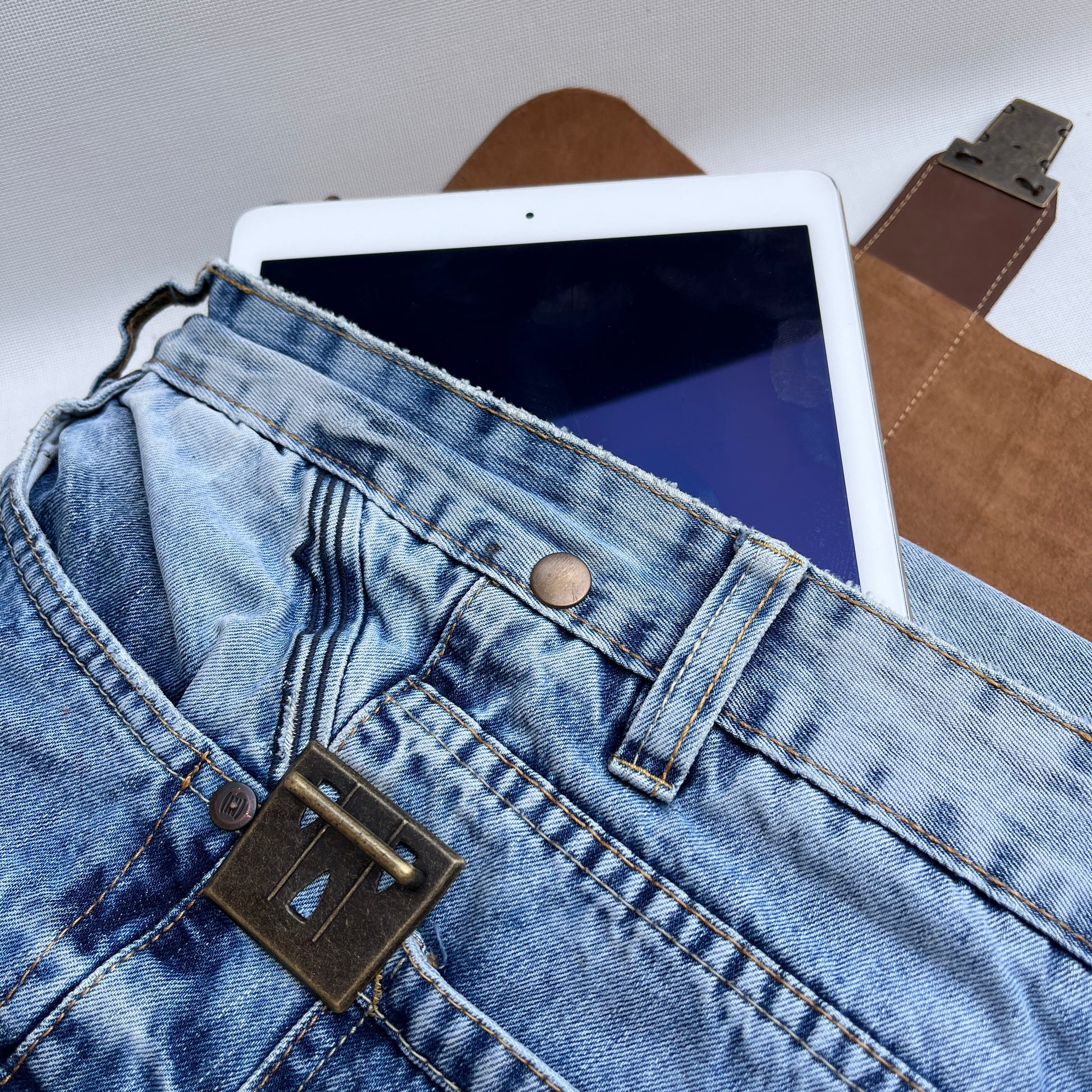 Bolsillo principal delantero en cuero en color contrastado al estilo y personalidad Caomka con cierre vintage "Click Clack" en color oro viejo.