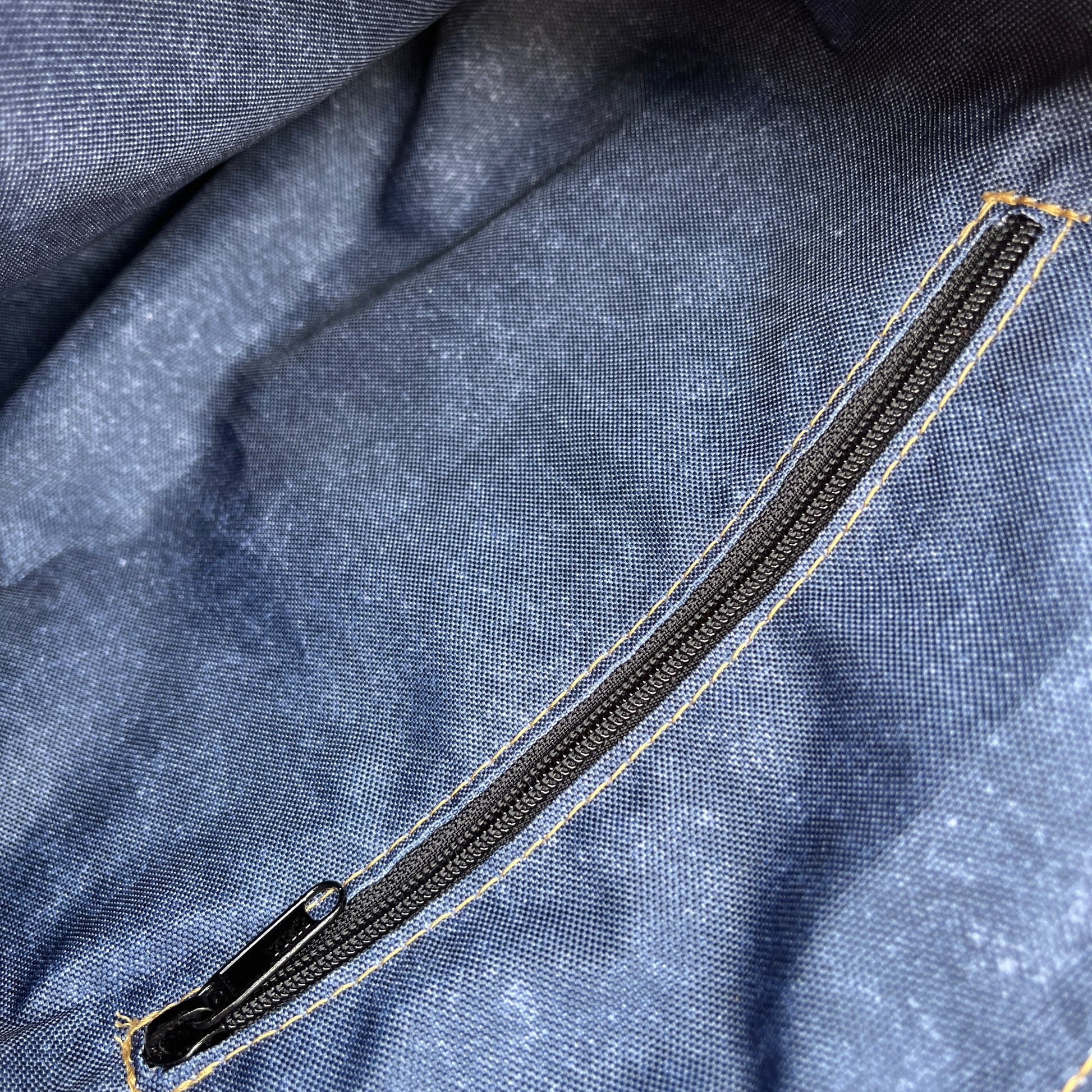 Gran apertura del bolsillo principal con cierre de cremallera en color oro viejo con tirador especial de piel.
