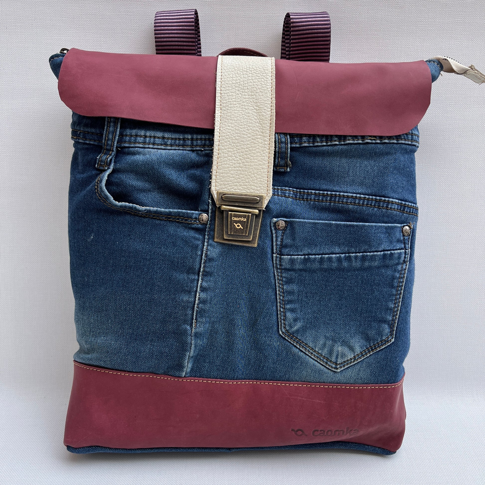 Mochila Caomka ultraligera confeccionada con tejido procedente de vaqueros reutilizados combinados con piel/cuero.