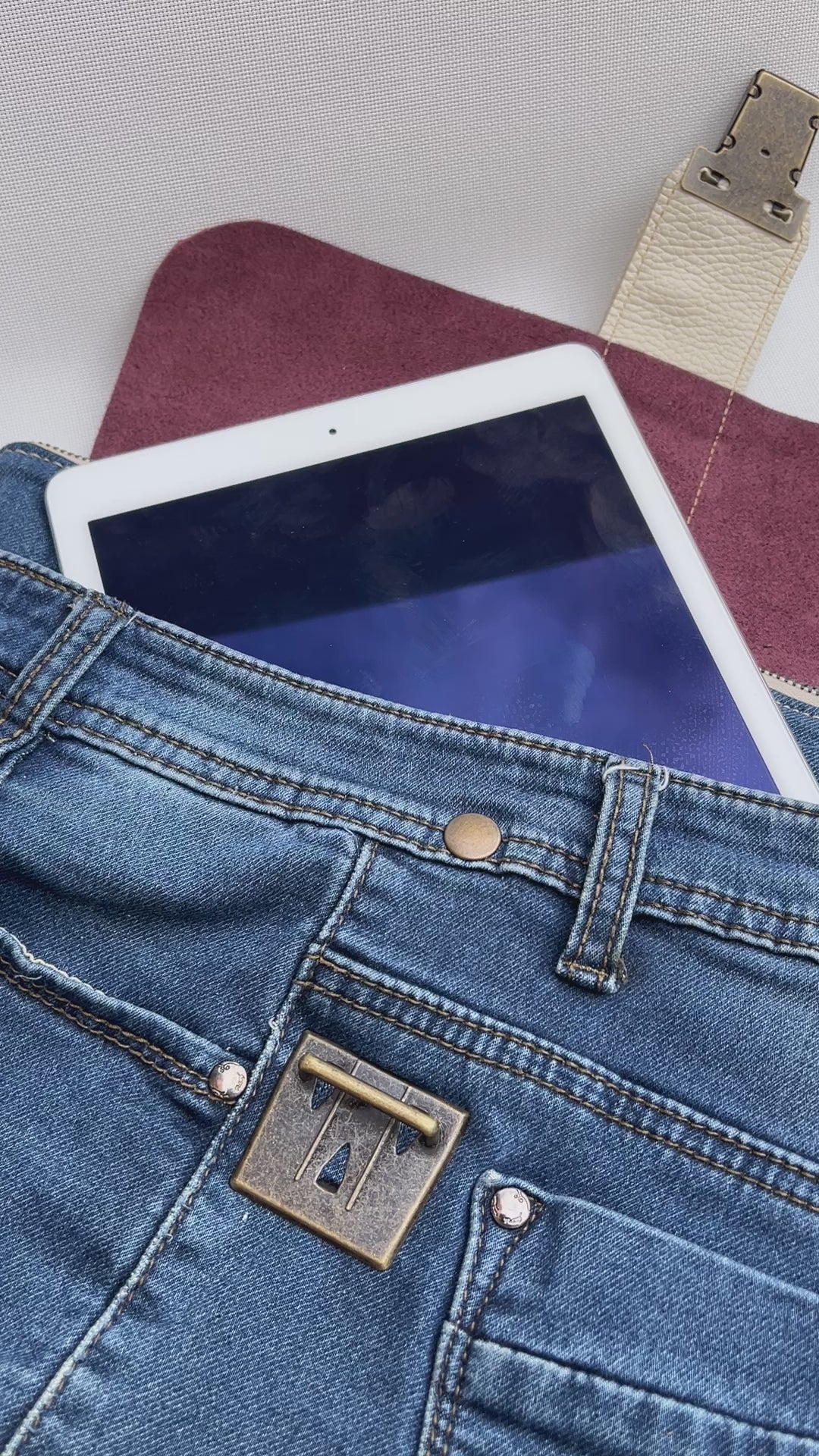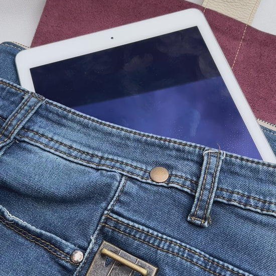 Bolsillo principal delantero en cuero en color contrastado al estilo y personalidad Caomka con cierre vintage "Click Clack" en color oro viejo.
