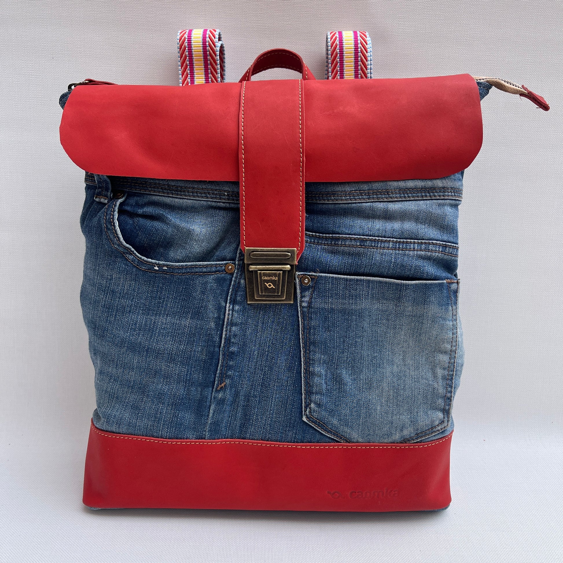 Mochila Caomka ultraligera confeccionada con tejido procedente de vaqueros reutilizados combinados con piel/cuero.
