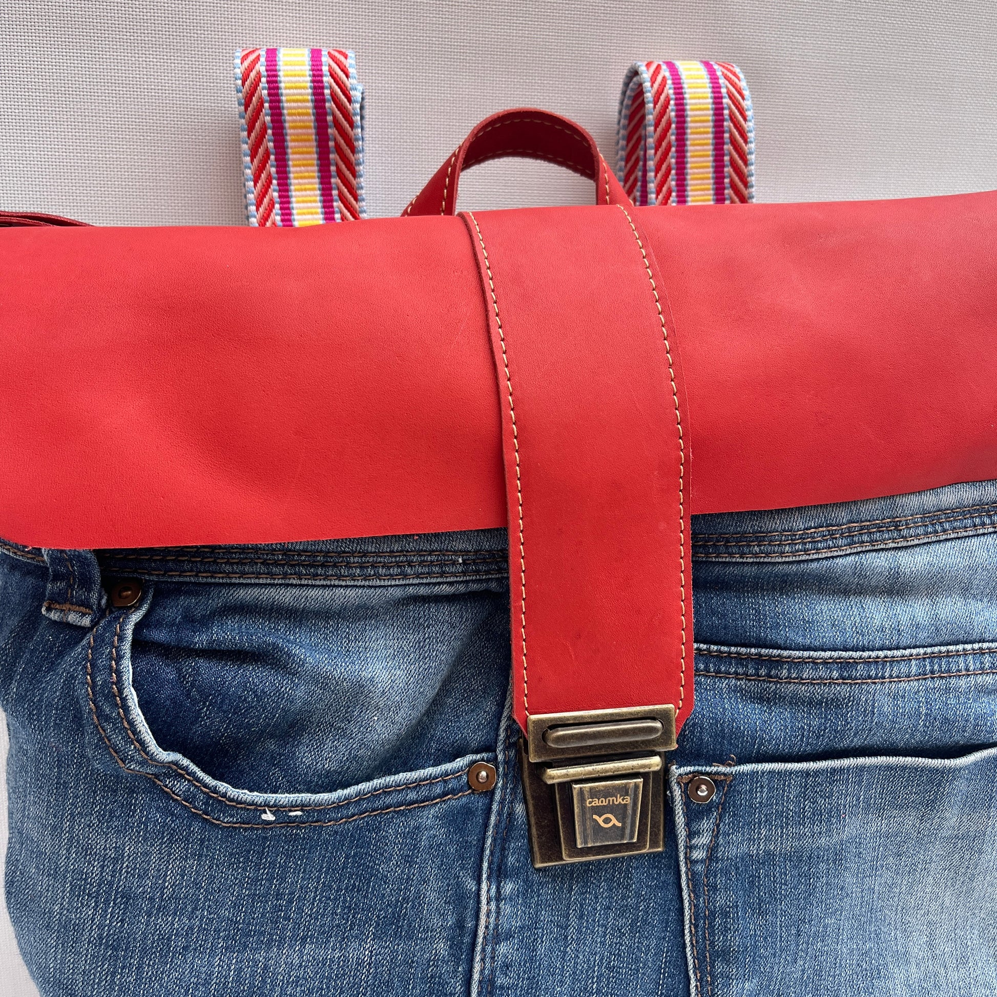 Bolsillo principal delantero en cuero en color contrastado al estilo y personalidad Caomka con cierre vintage "Click Clack" en color oro viejo.