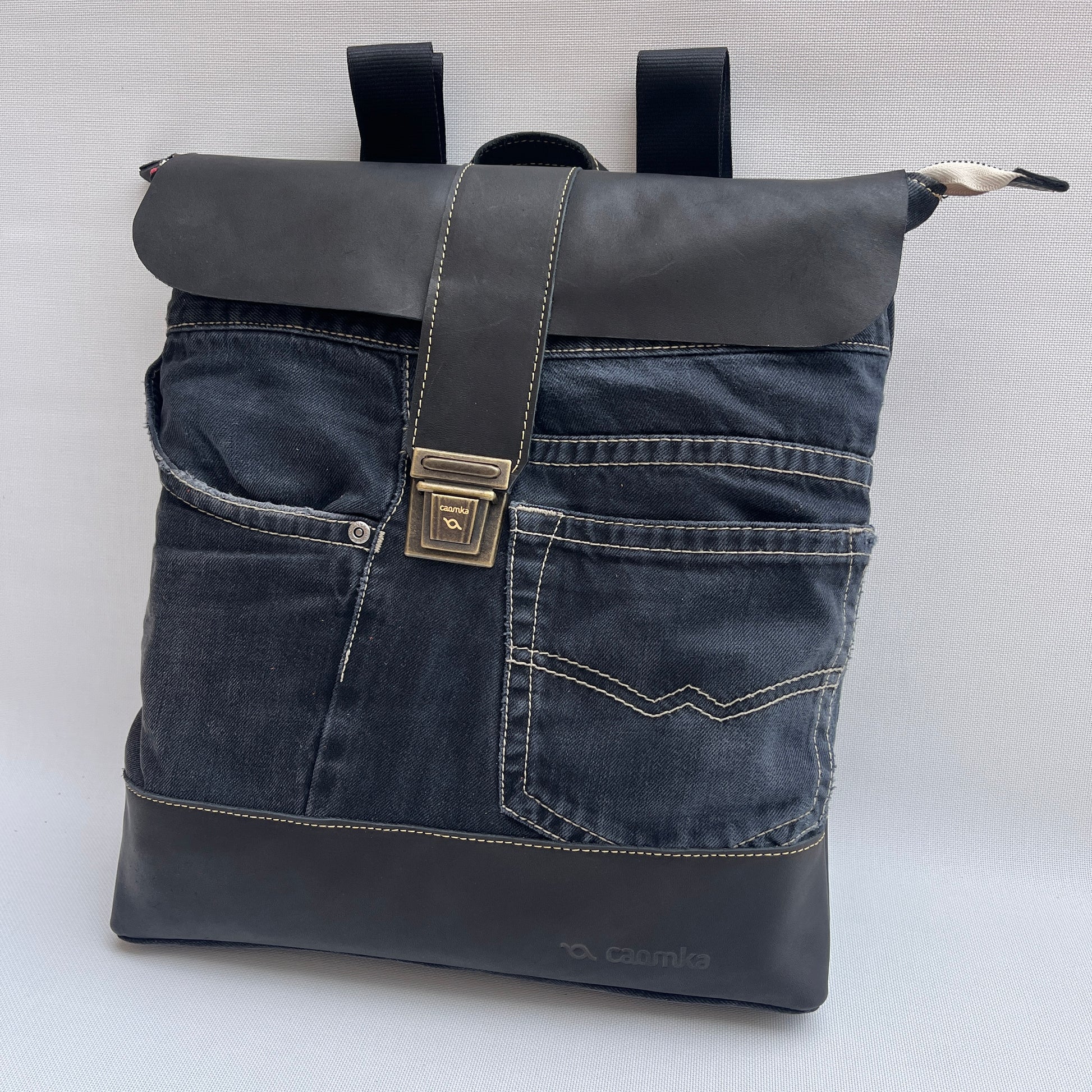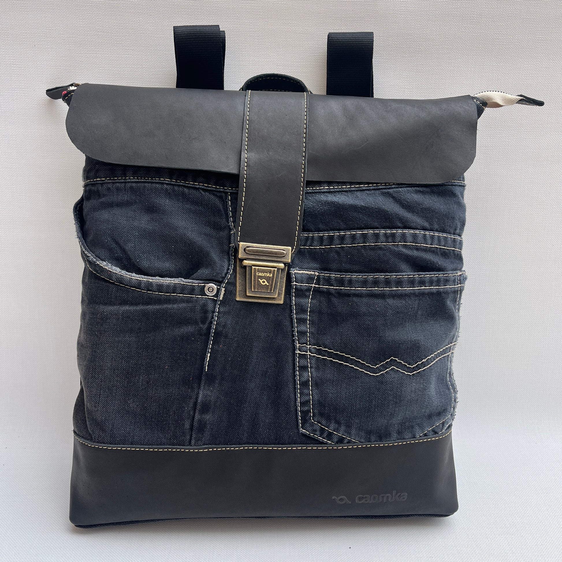 Mochila Caomka ultraligera confeccionada con tejido procedente de vaqueros reutilizados combinados con piel/cuero.