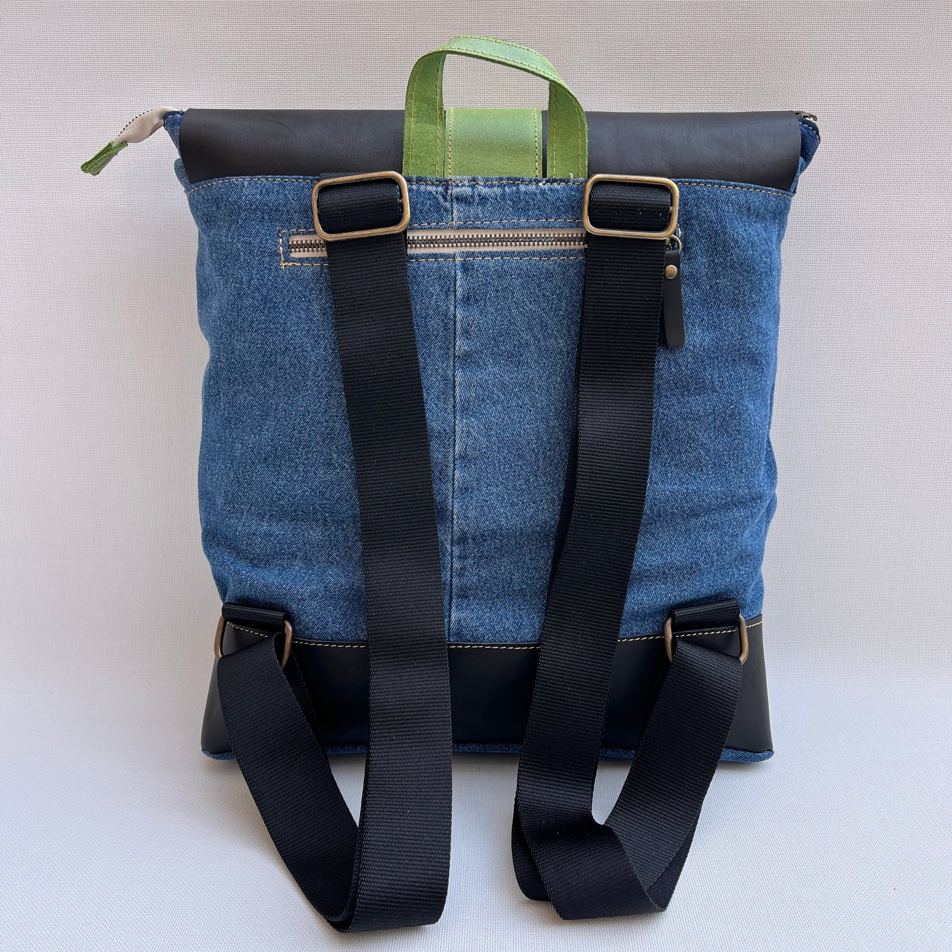 Mochila Caomka ultraligera confeccionada con tejido procedente de vaqueros reutilizados combinados con piel/cuero.