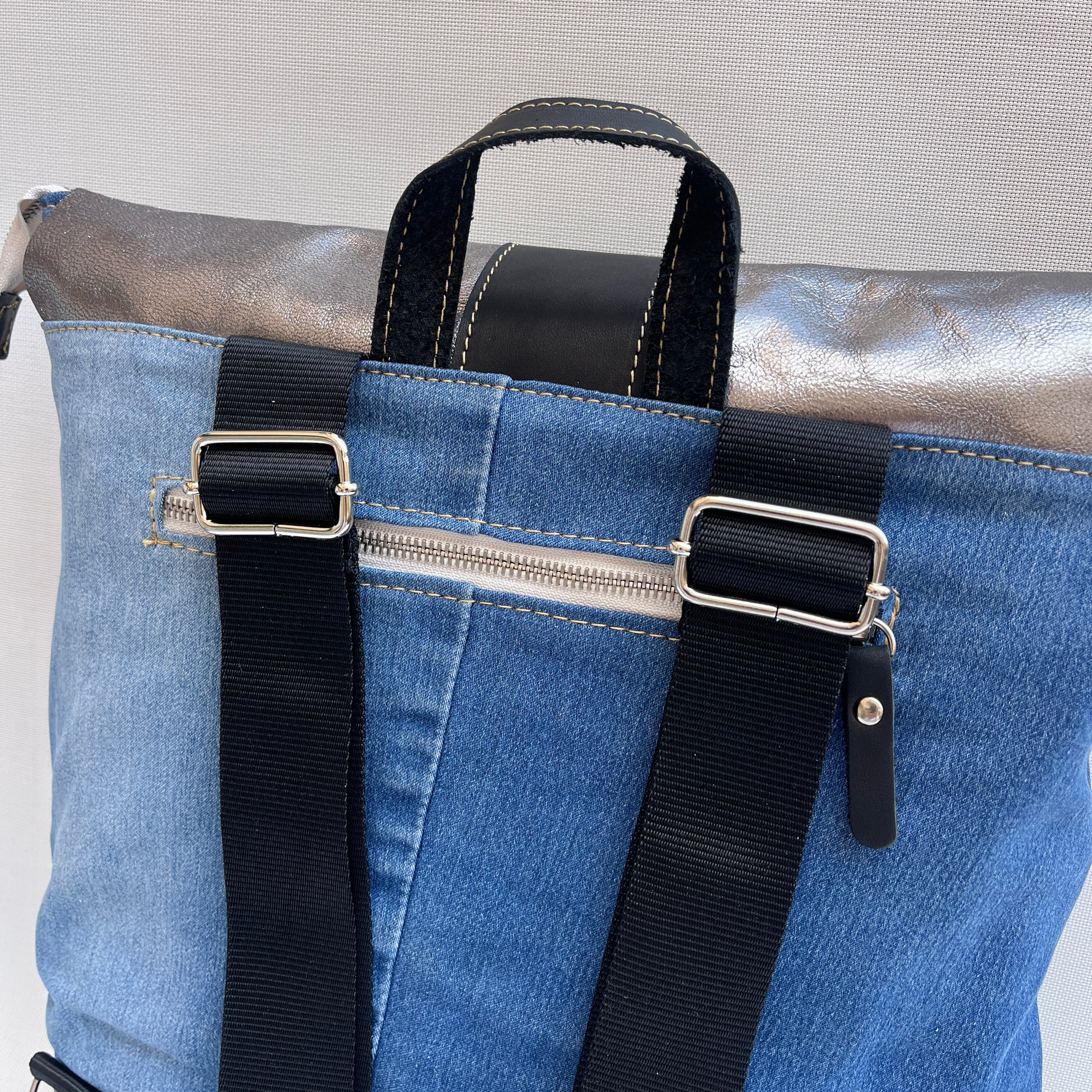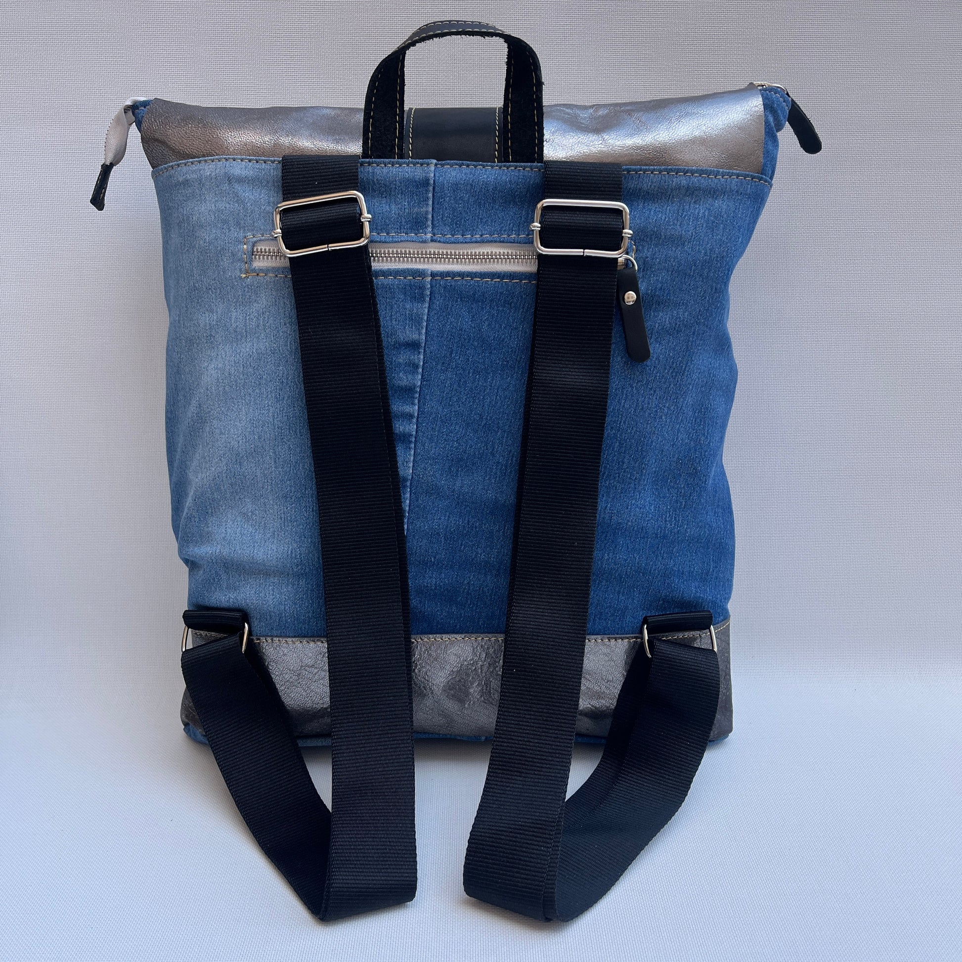 Mochila Caomka ultraligera confeccionada con tejido procedente de vaqueros reutilizados combinados con piel/cuero.
