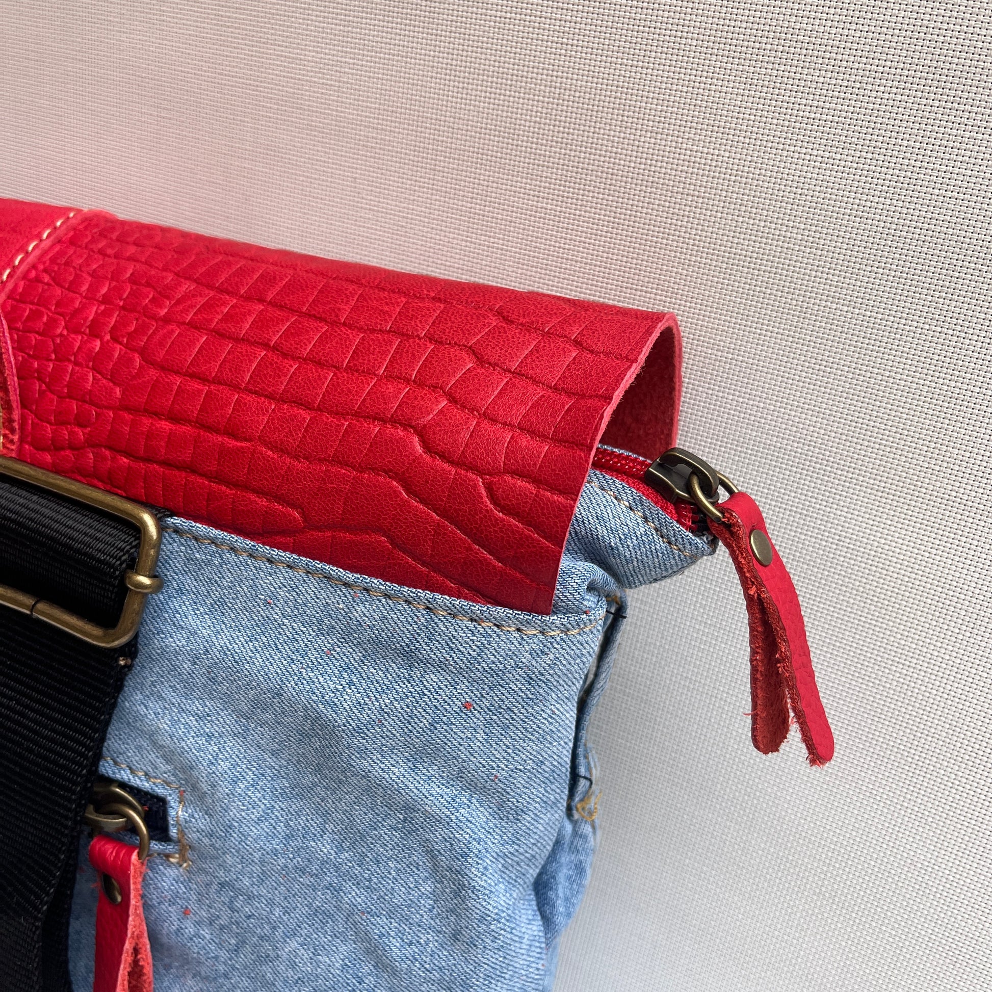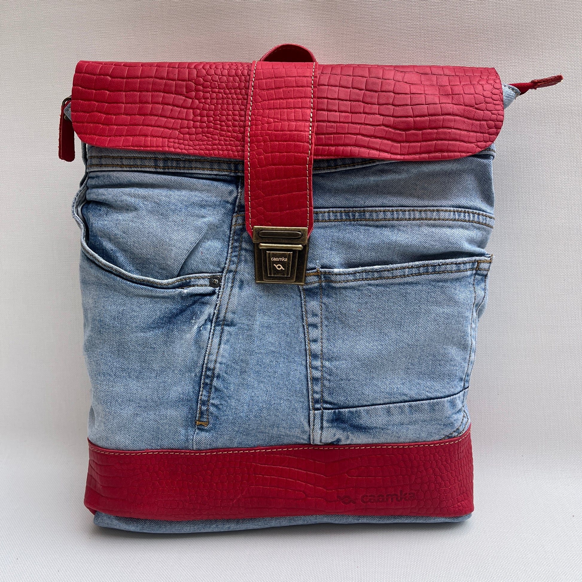 Mochila Caomka ultraligera confeccionada con tejido procedente de vaqueros reutilizados combinados con piel/cuero.