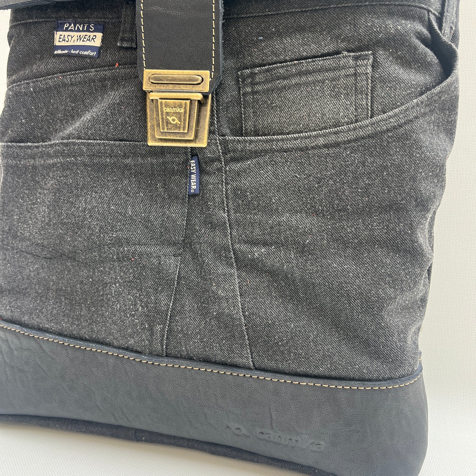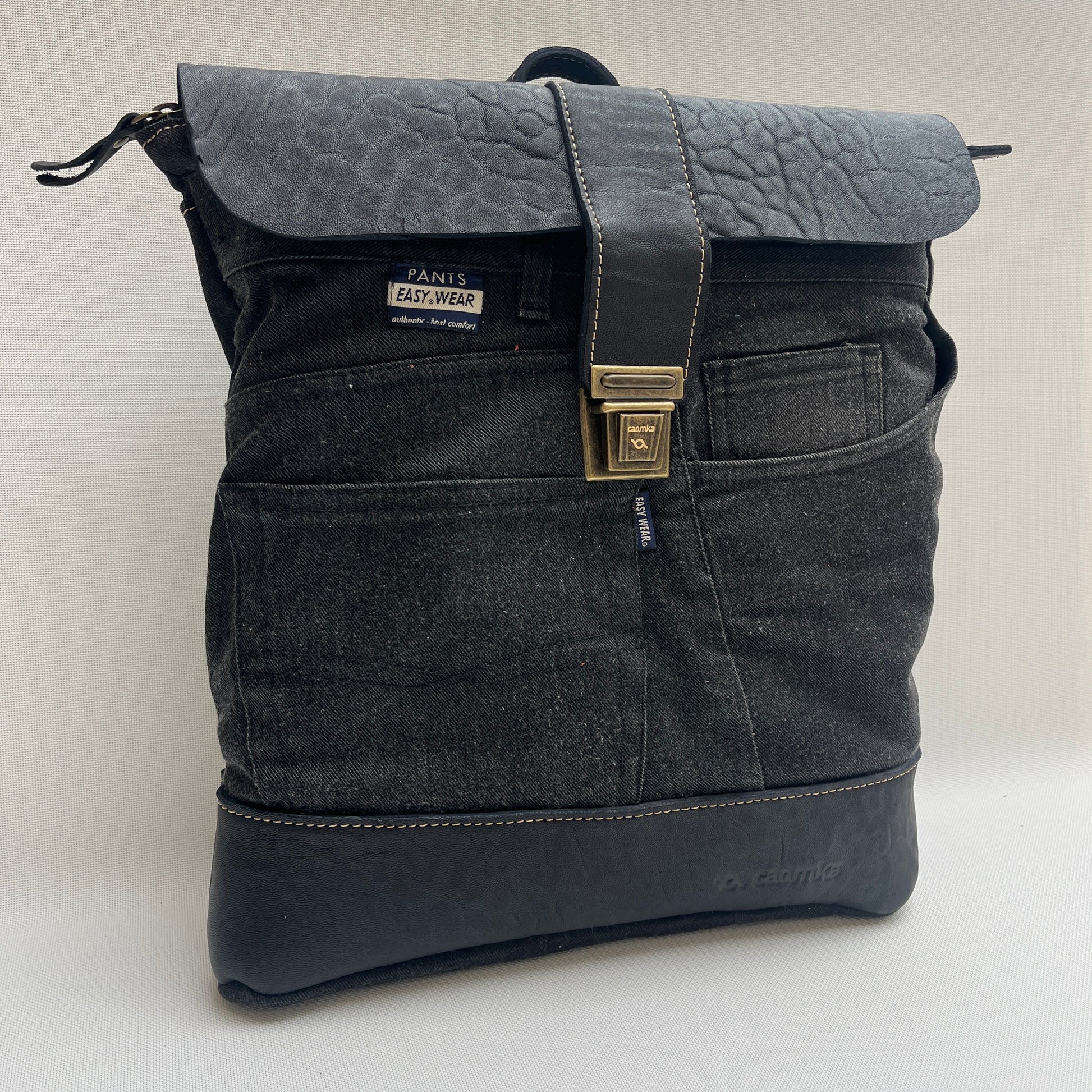Mochila Caomka ultraligera confeccionada con tejido procedente de vaqueros reutilizados combinados con piel/cuero.