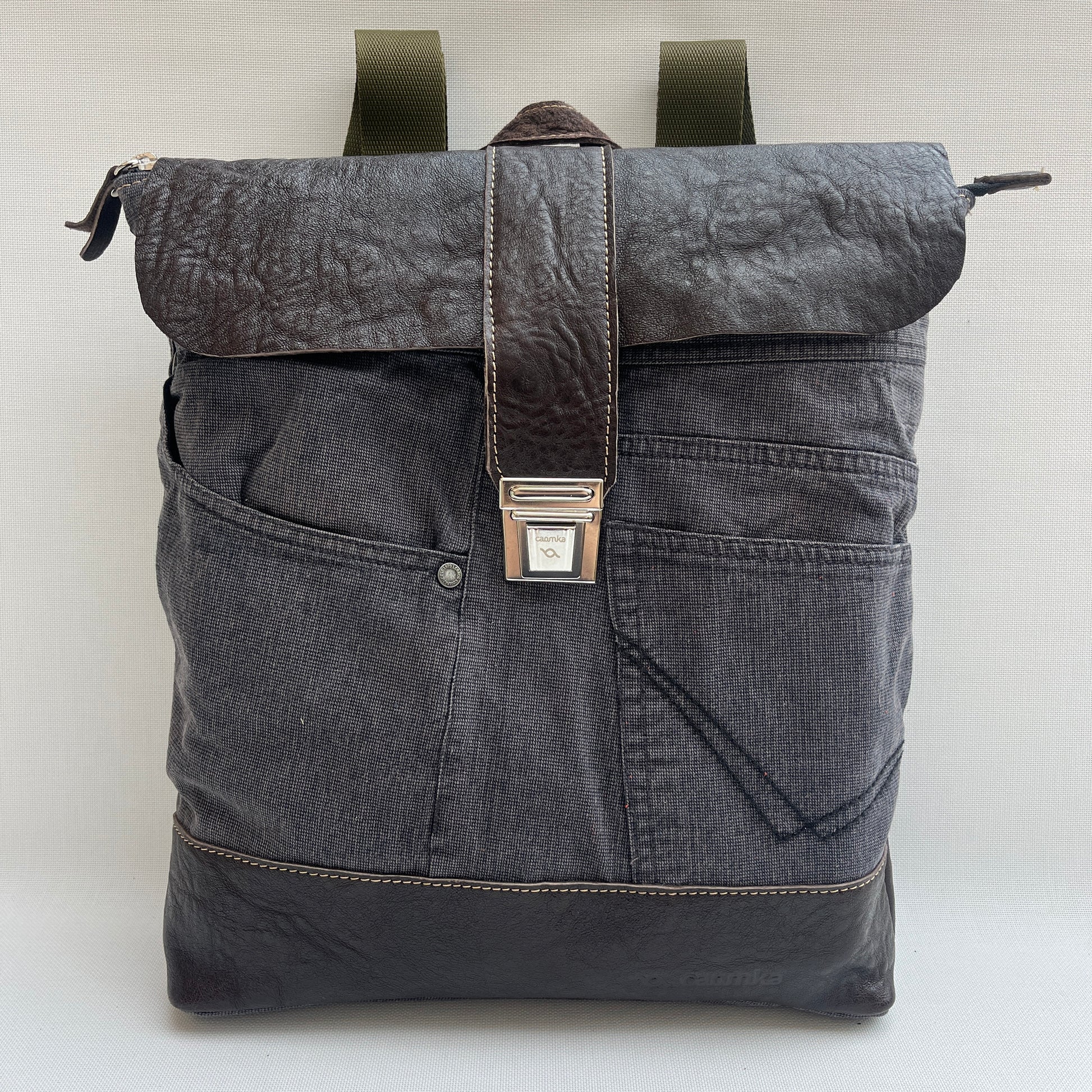 Mochila Caomka ultraligera confeccionada con tejido procedente de vaqueros reutilizados combinados con piel/cuero.