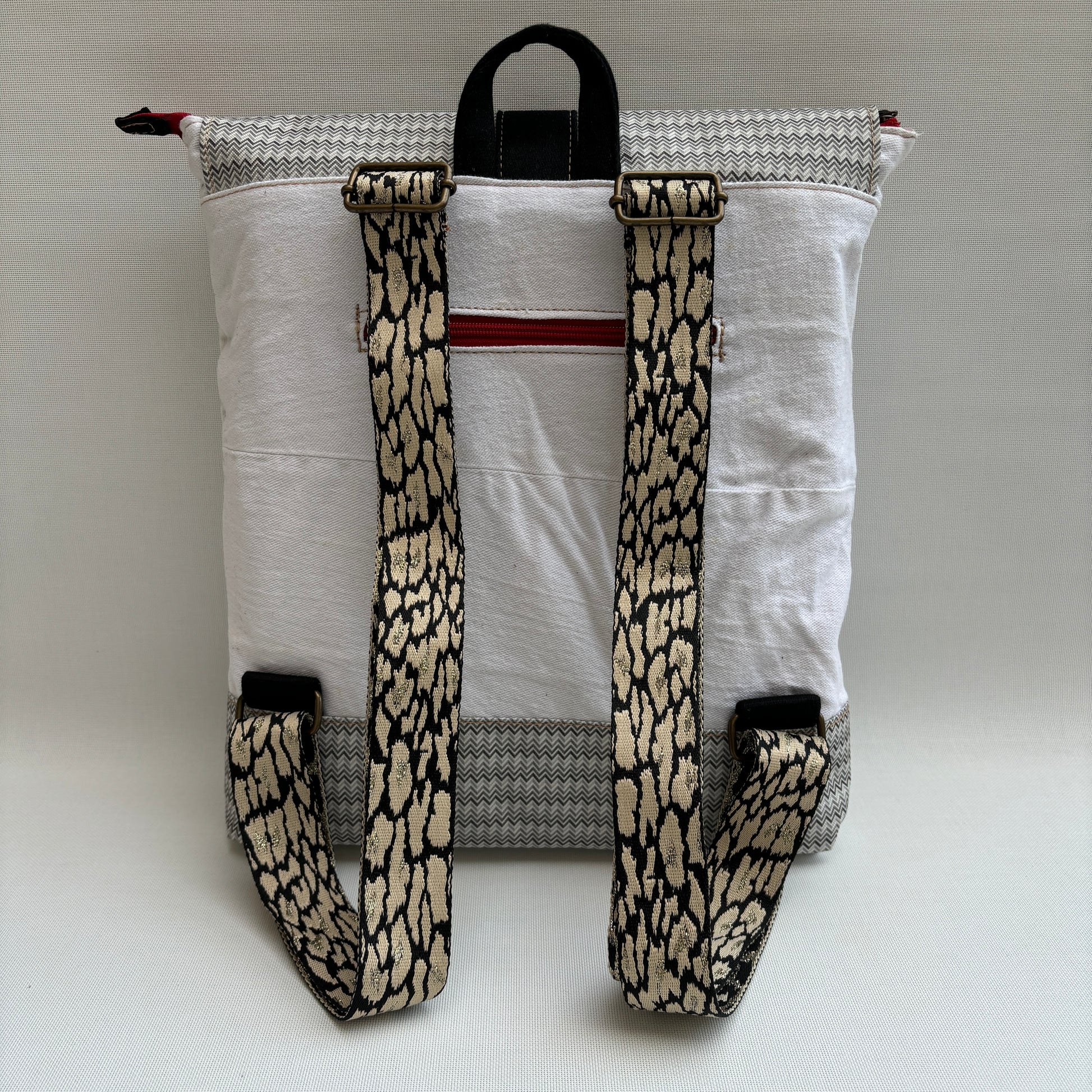 Mochila Caomka ultraligera confeccionada con tejido procedente de vaqueros reutilizados combinados con tejido impermeable Caomka.