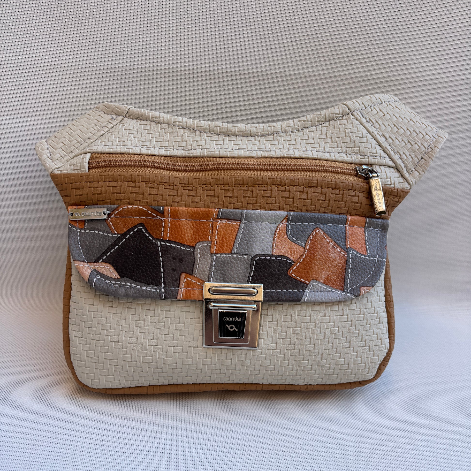 La Elegant Patchwork Top 18467 es una riñonera luminosa y elegante, confeccionada en polipiel texturizada efecto trenzado en tono marfil combinada con detalles en camel cálido.