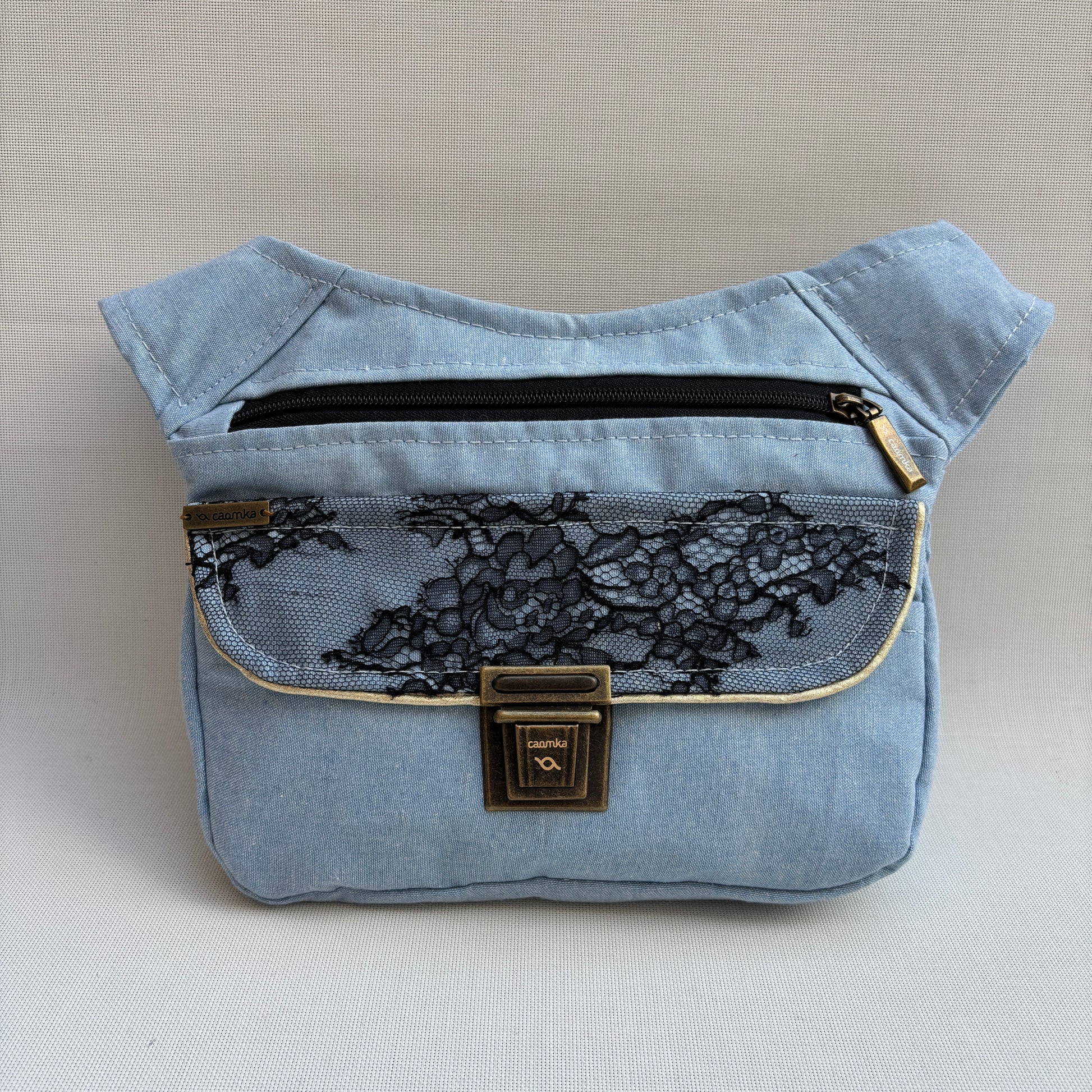 El cuerpo en tejido azul lavado aporta ligereza y frescura, mientras que la solapa revestida con encaje floral negro añade profundidad, textura y un aire elegante.