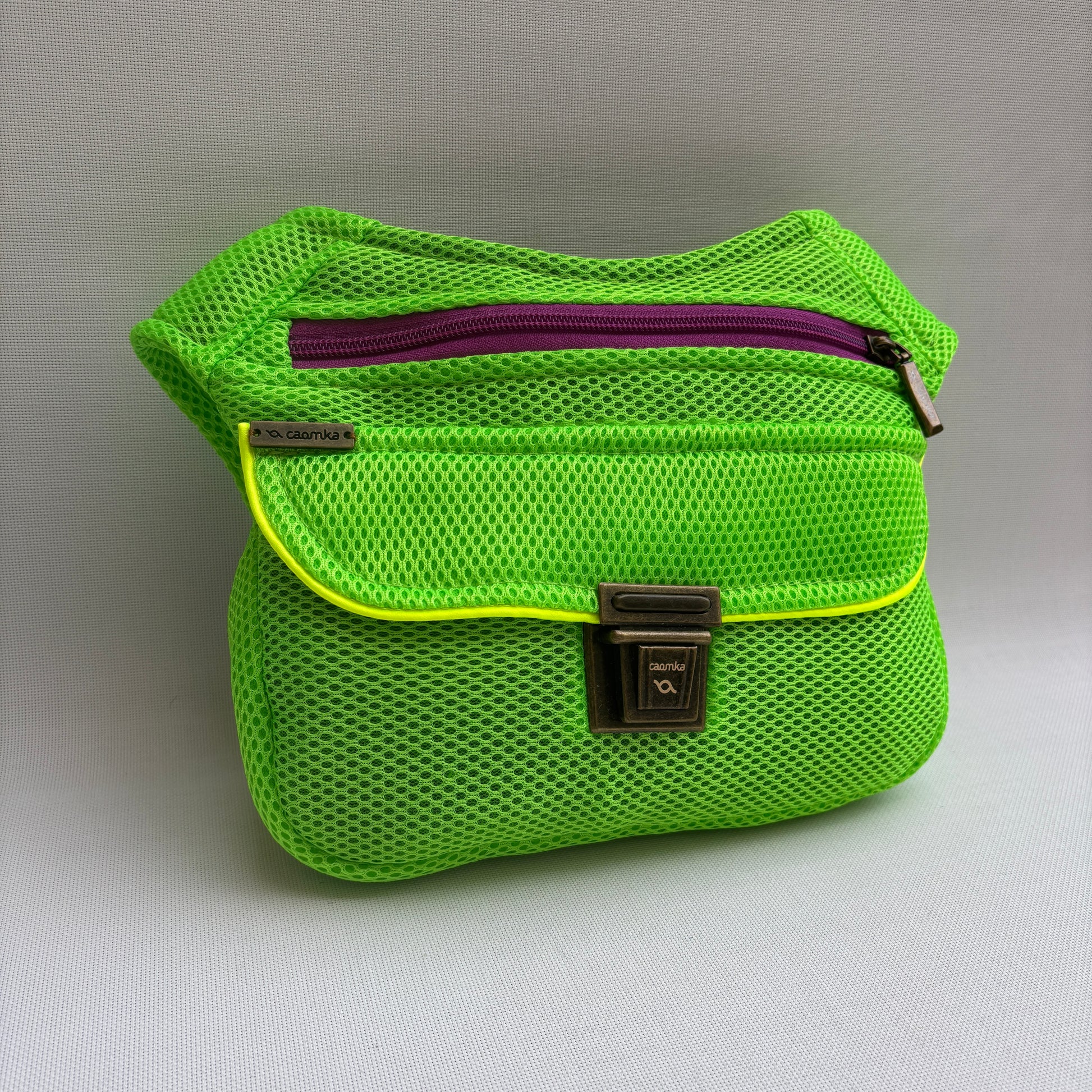 Su tejido verde lima intenso, combinado con el ribete amarillo neón y la cremallera violeta, crea un contraste vibrante y moderno que no pasa desapercibido.