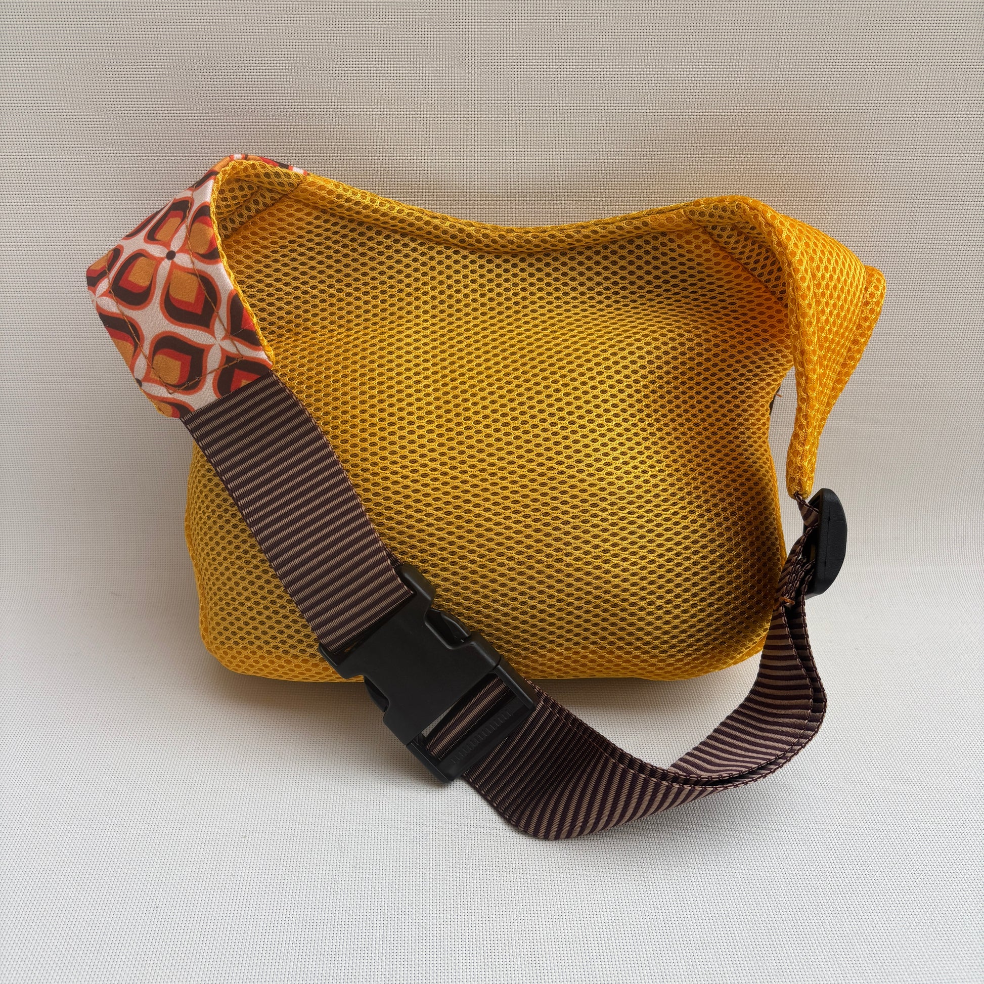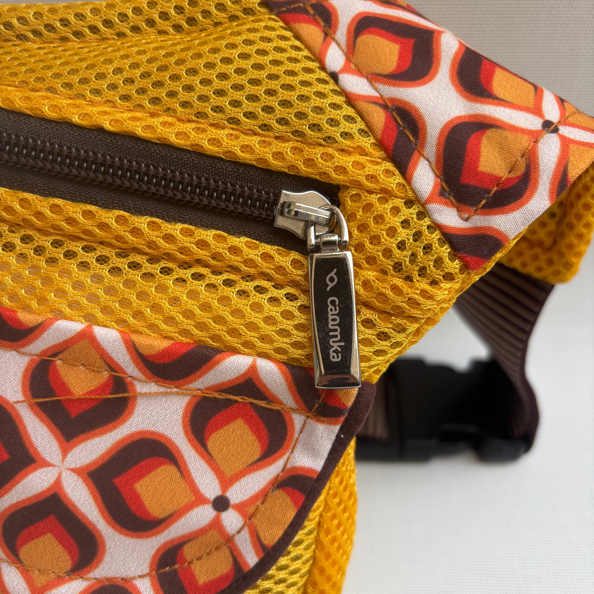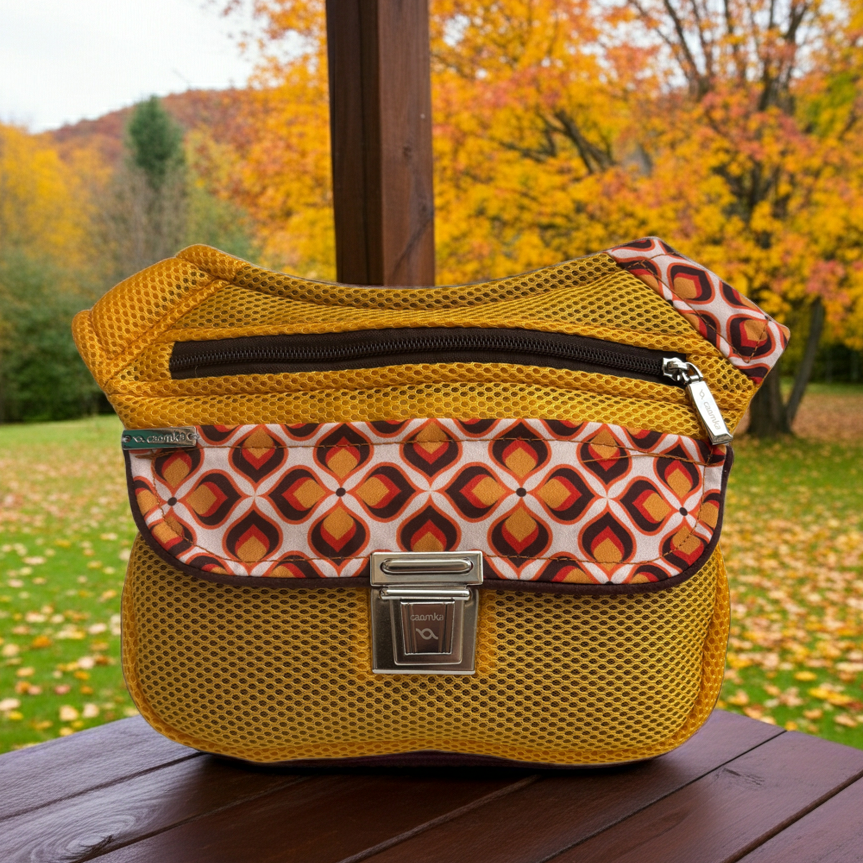 Su cuerpo en tejido técnico amarillo mostaza aporta energía y luminosidad, mientras la solapa con estampado geométrico setentero y los acabados en marrón chocolate evocan elegancia y nostalgia.