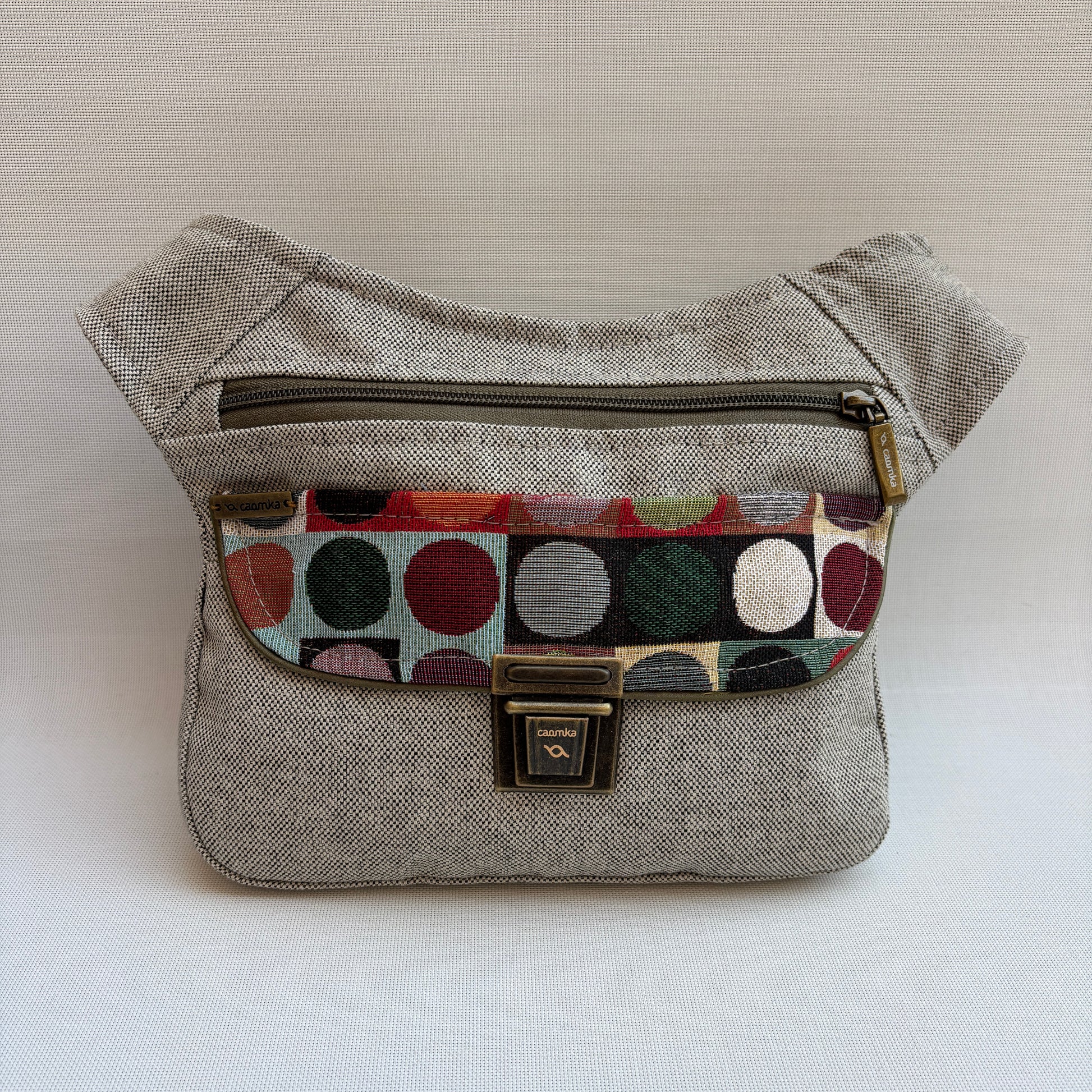 El cuerpo en tejido beige aporta neutralidad, textura y versatilidad, mientras que la solapa en tapicería multicolor con círculos en rojo, verde, negro y tonos tierra introduce ritmo visual y carácter contemporáneo.