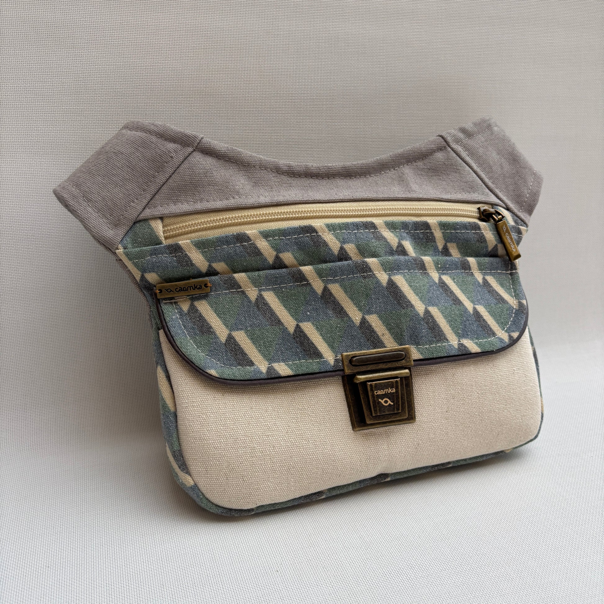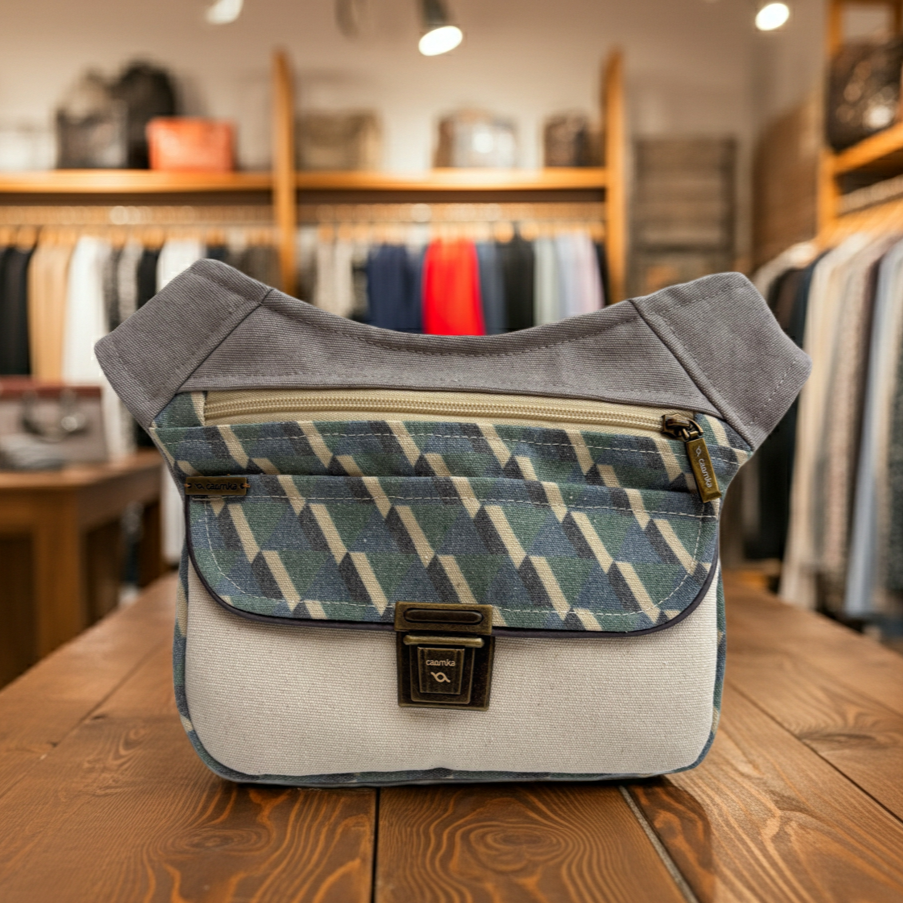La Caomka “Special Geometric Top” está confeccionada artesanalmente en Barcelona con una combinación de tejidos naturales y estampado geométrico en tonos verdes, beige y lino. Su diseño transmite serenidad y carácter, pensado para acompañarte con estilo en tu día a día.