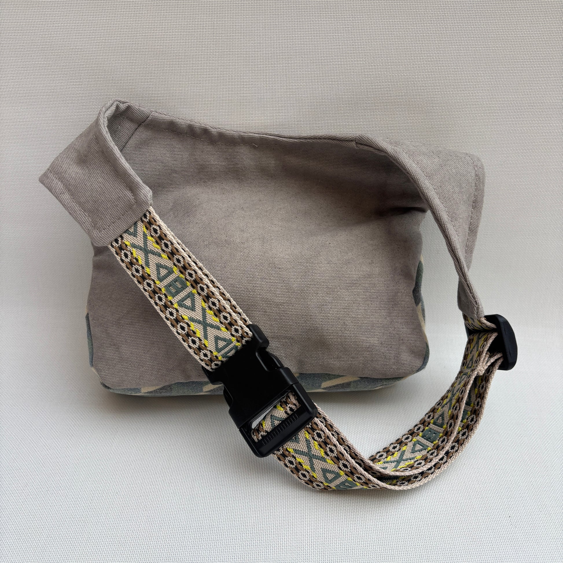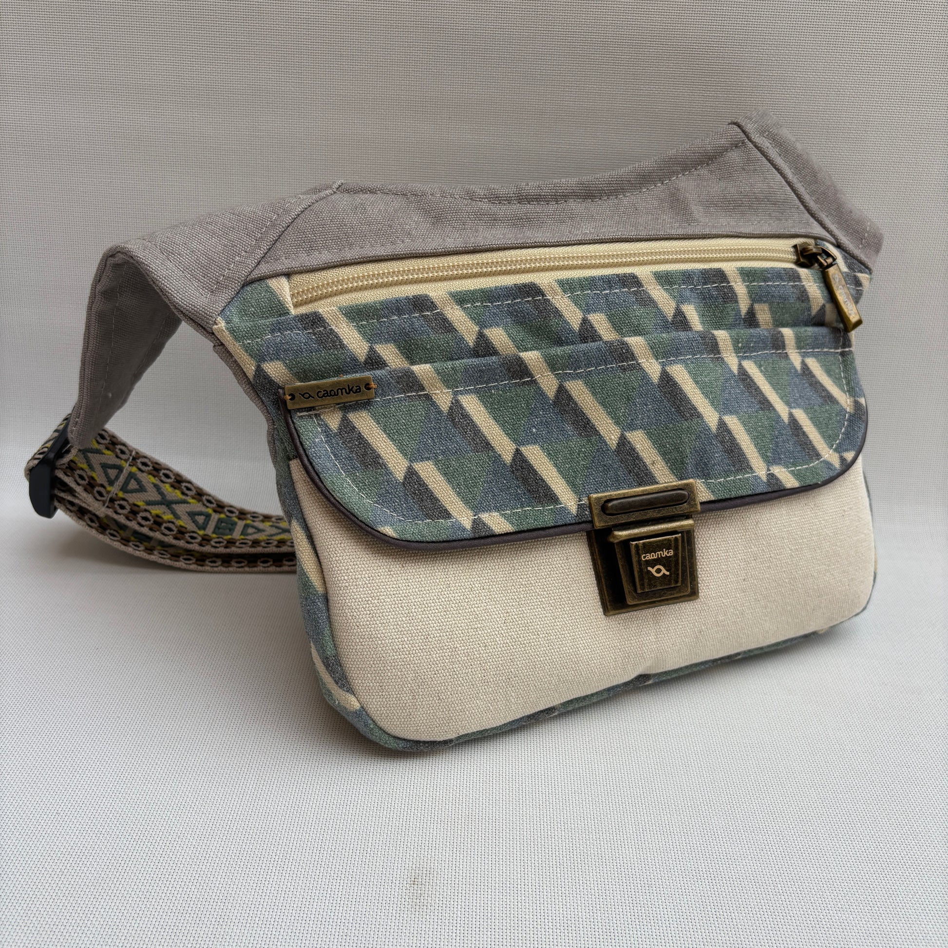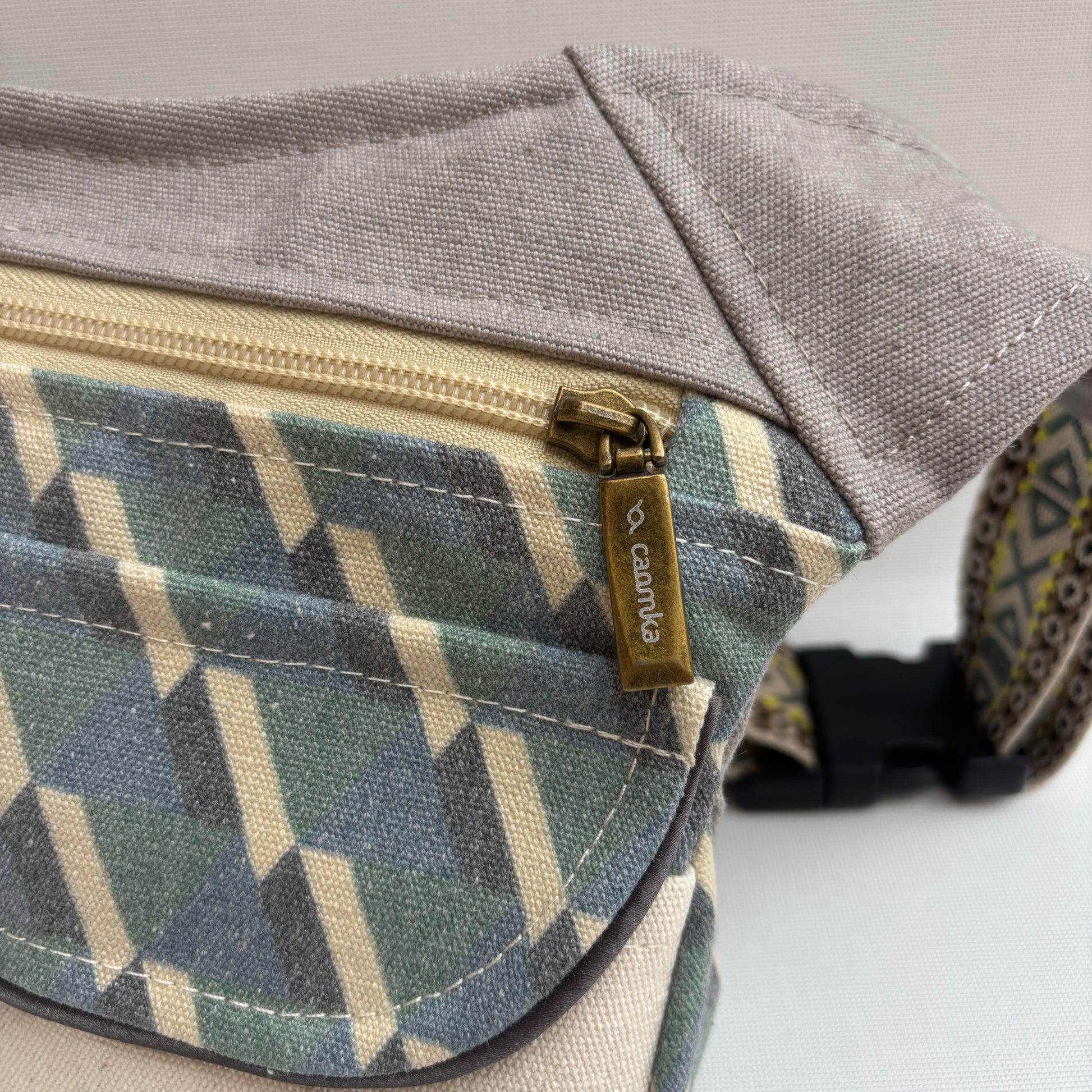 La cremallera YKK en color crema y el cierre Click-Clack en oro viejo añaden un toque cálido y elegante. Su cinta regulable con bordado étnico te permite llevarla cómodamente como riñonera, bolso de cadera o bandolera, siempre adaptándose a ti.