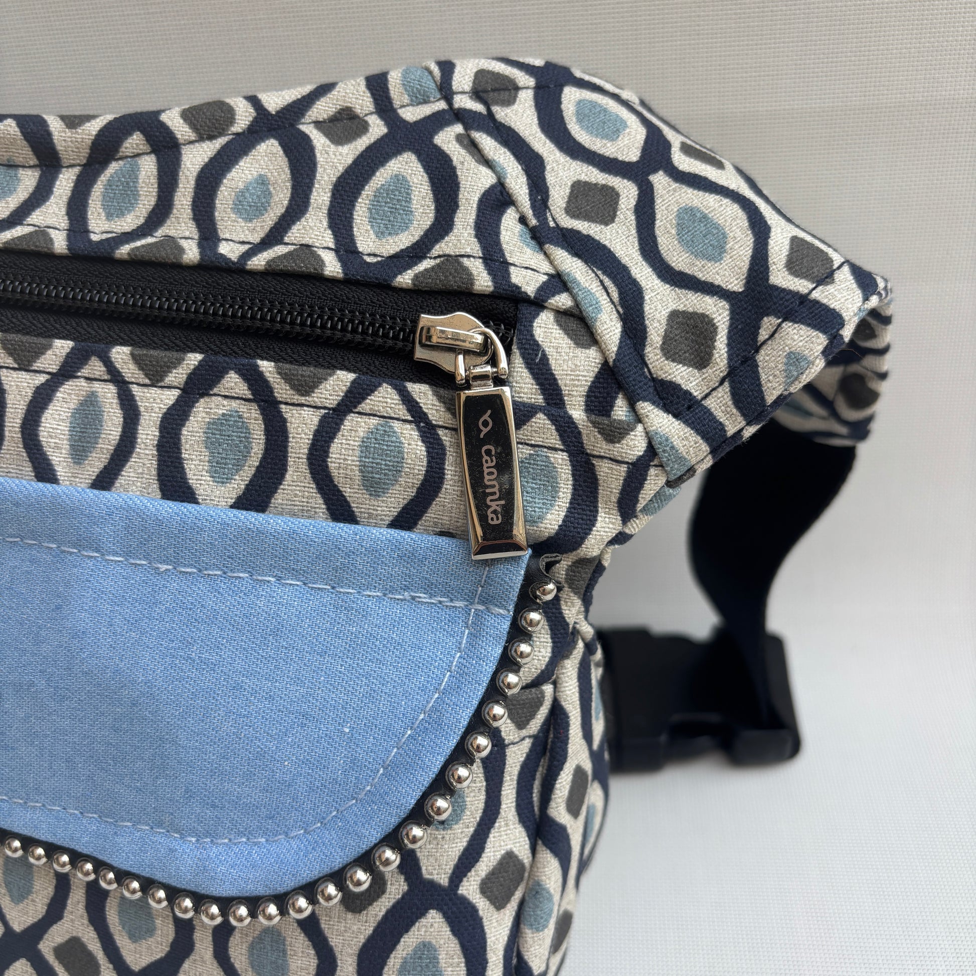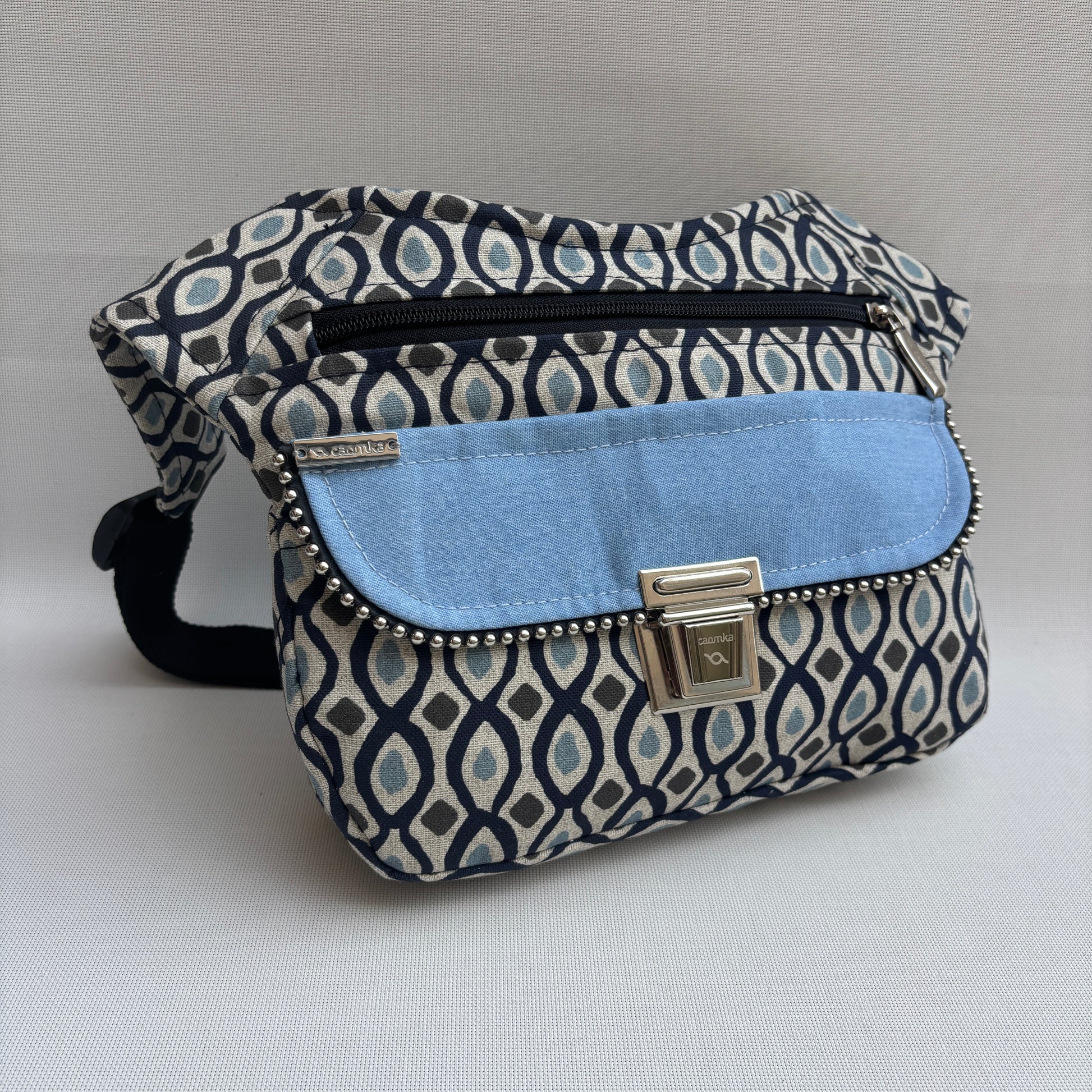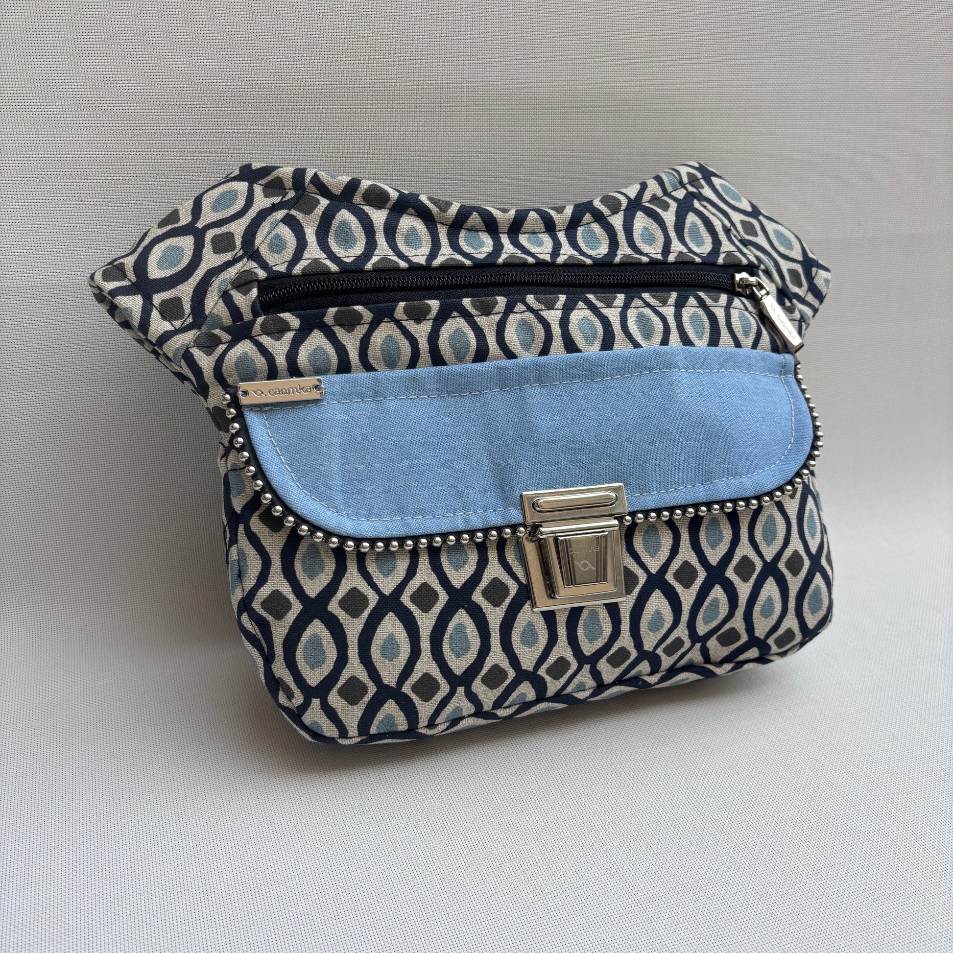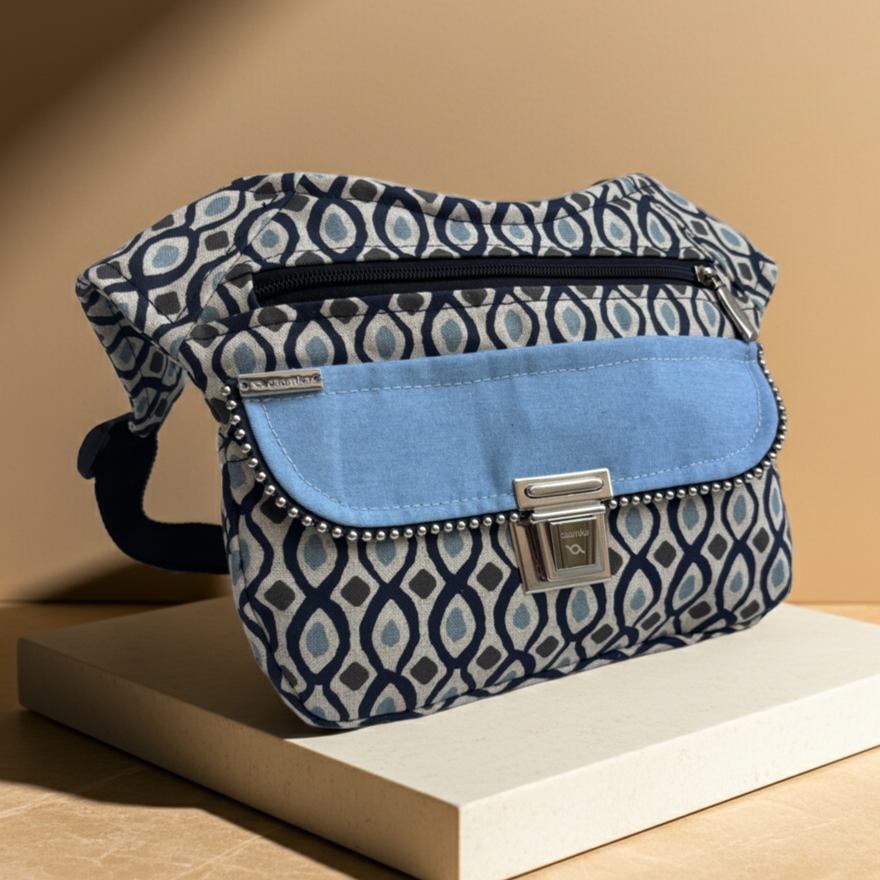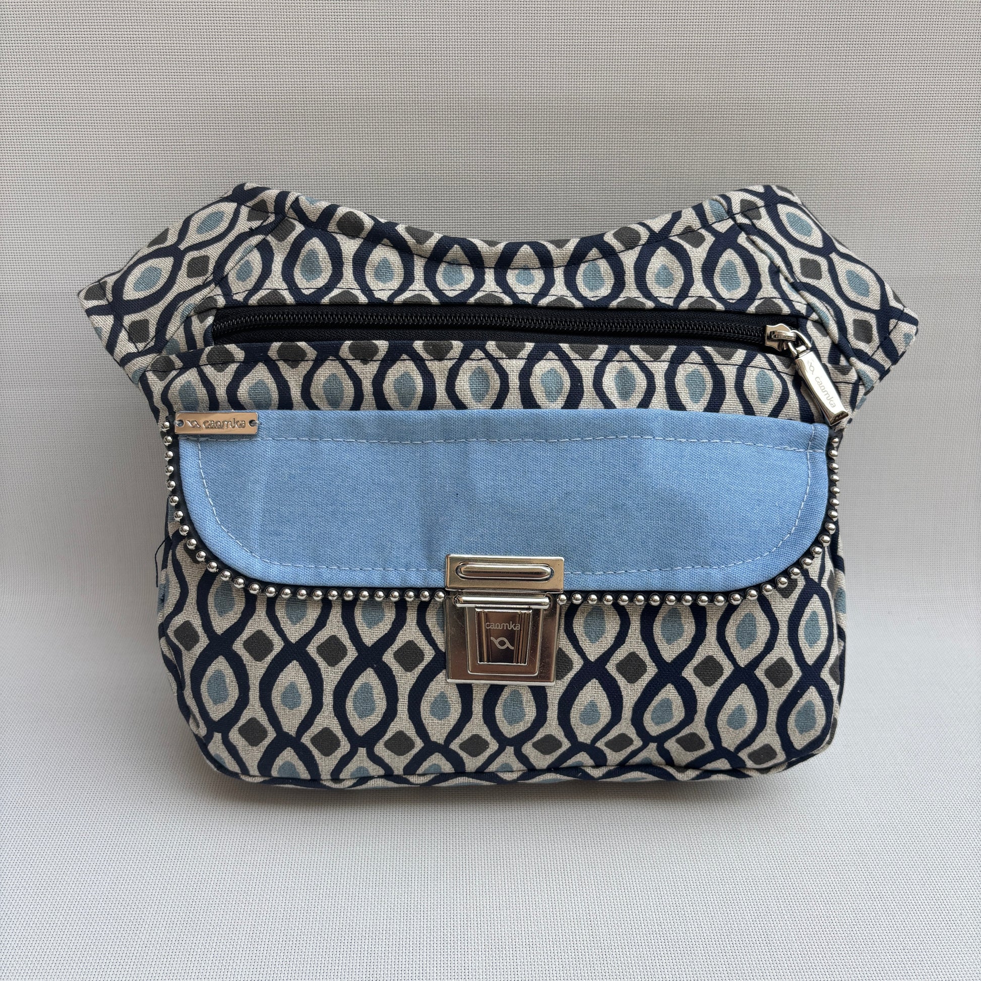 La Caomka “Square Vintage” está confeccionada a mano en Barcelona con una preciosa tela geométrica en tonos azul y lino que combina elegancia y frescura. Su solapa azul claro con detalle metálico plateado aporta ese toque luminoso que la hace inconfundible.