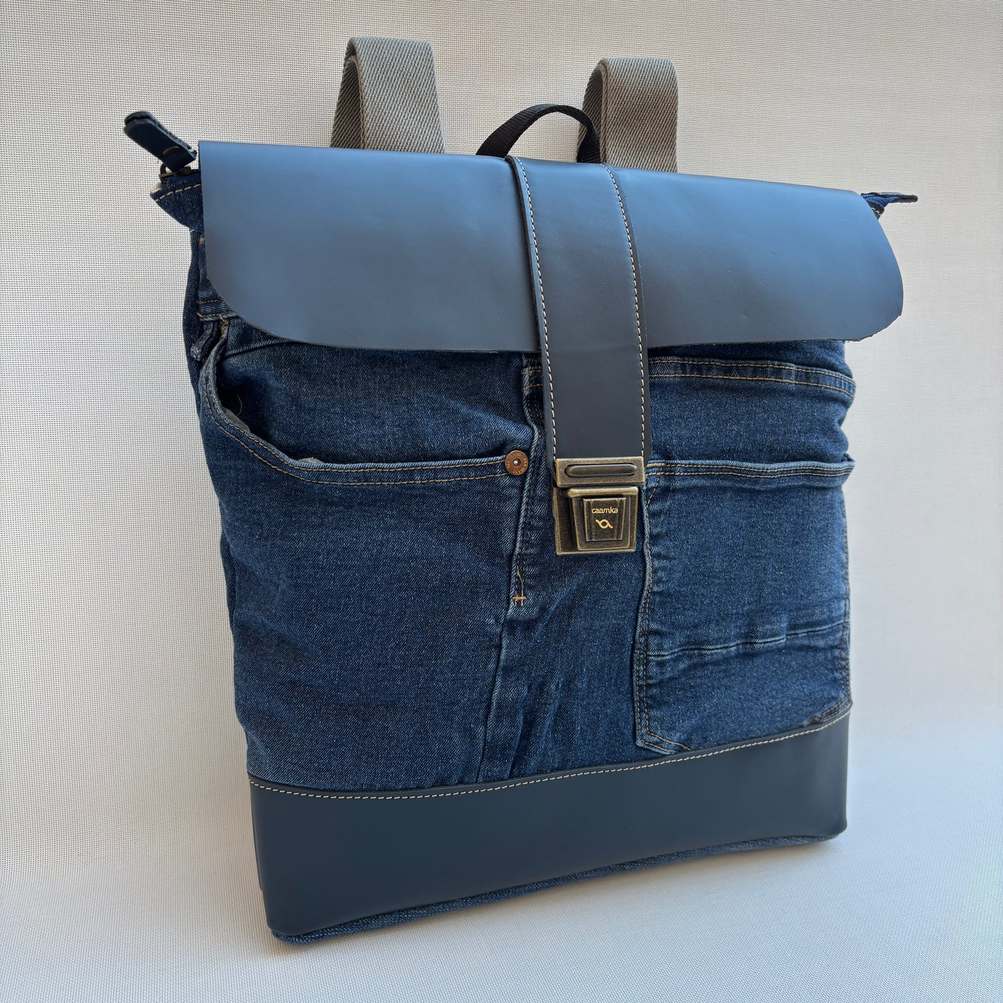 Mochila Caomka ultraligera confeccionada con tejido procedente de vaqueros reutilizados combinados con piel/cuero.