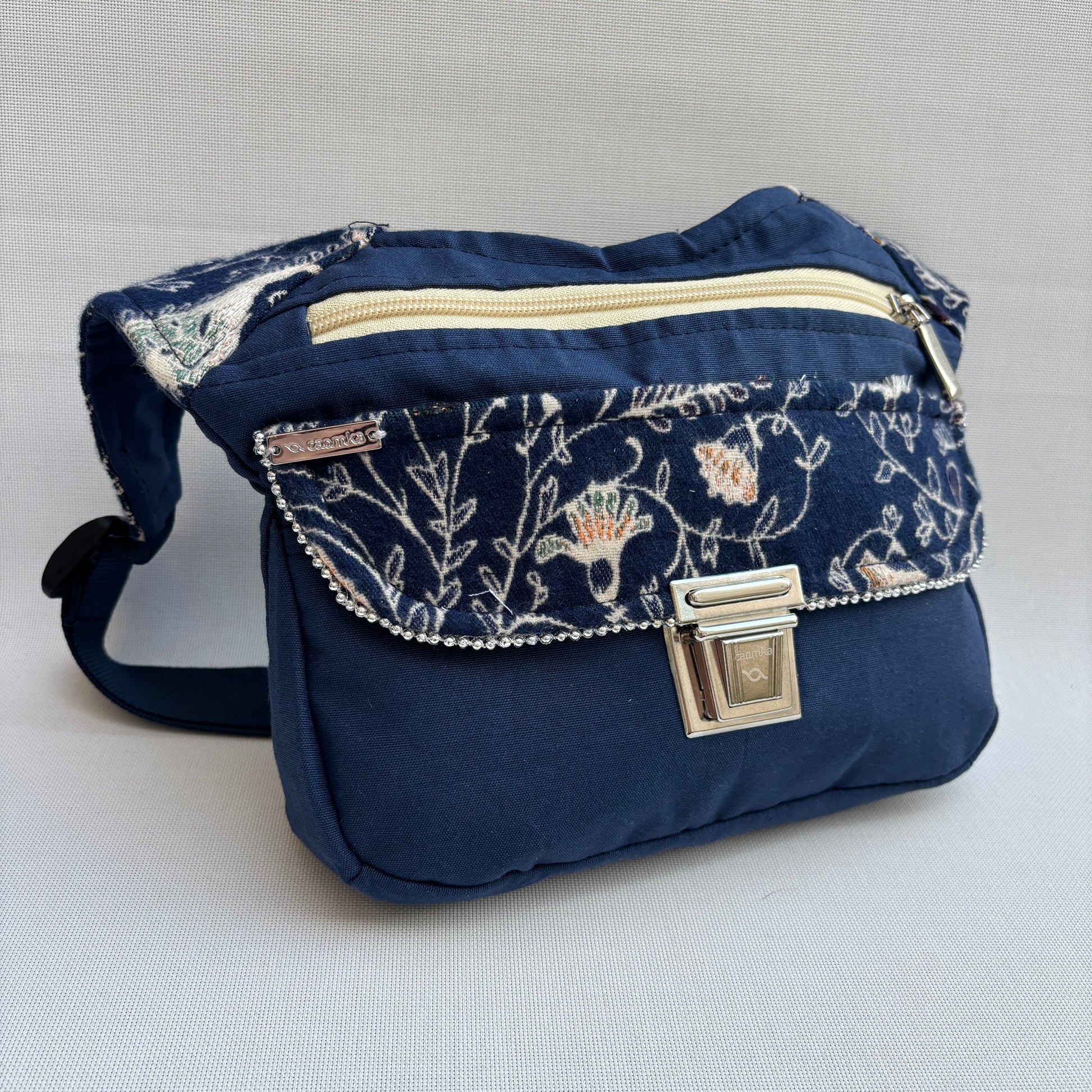 La Special Blue & Paisley 18404 es una riñonera de carácter tranquilo y sofisticado que combina una base azul marino profunda con una solapa en tejido paisley de inspiración botánica.