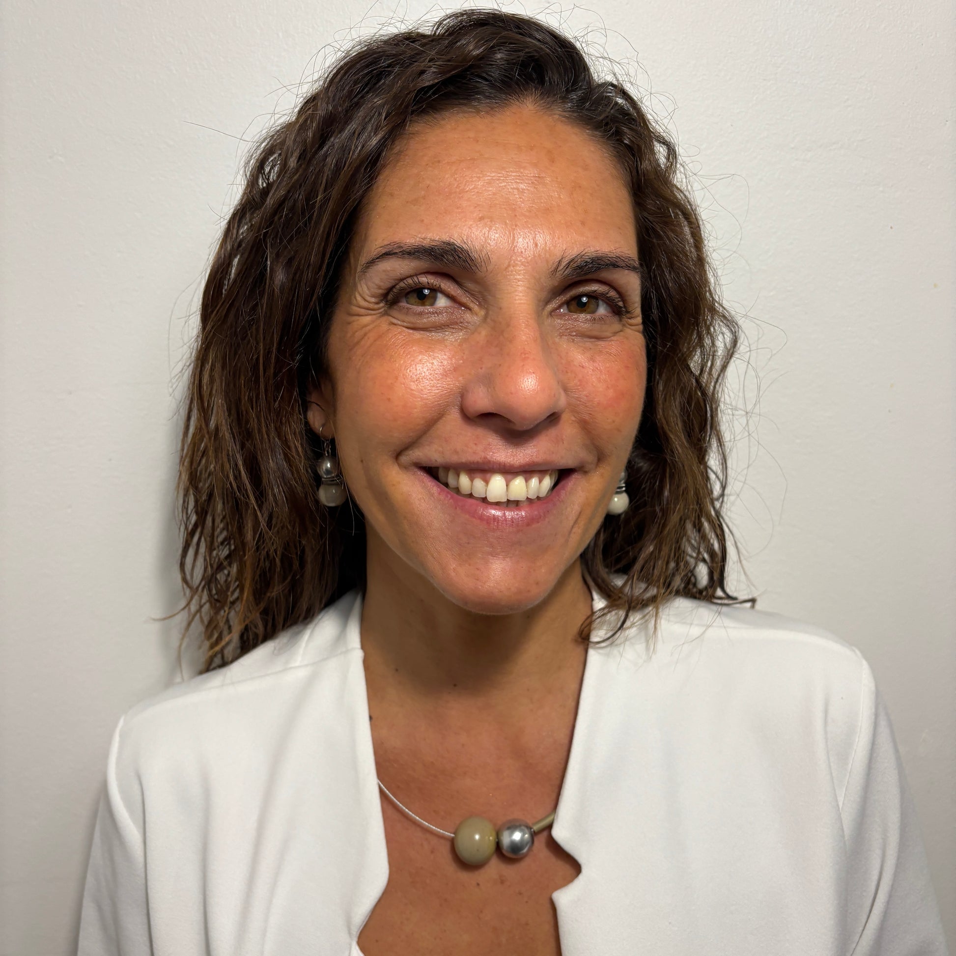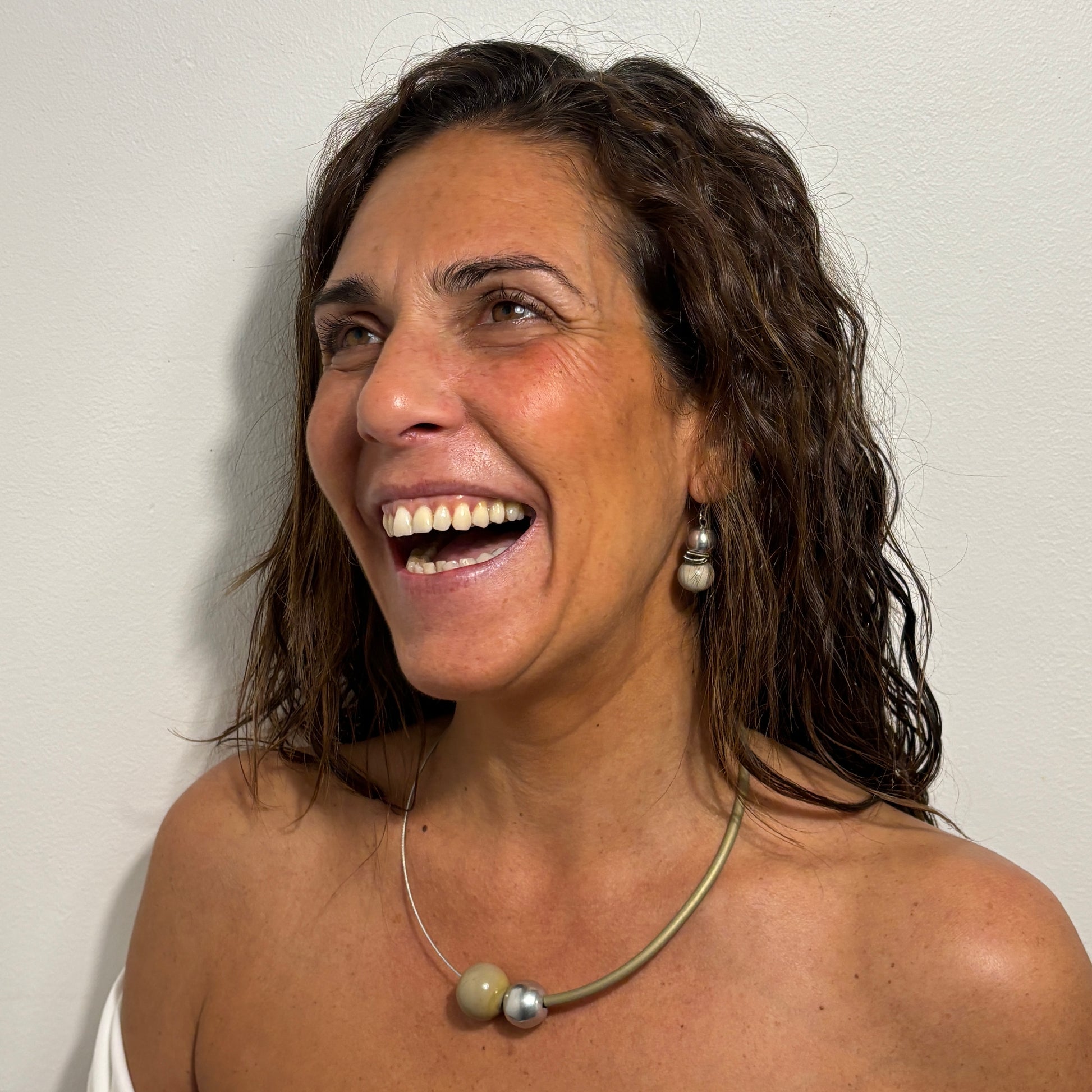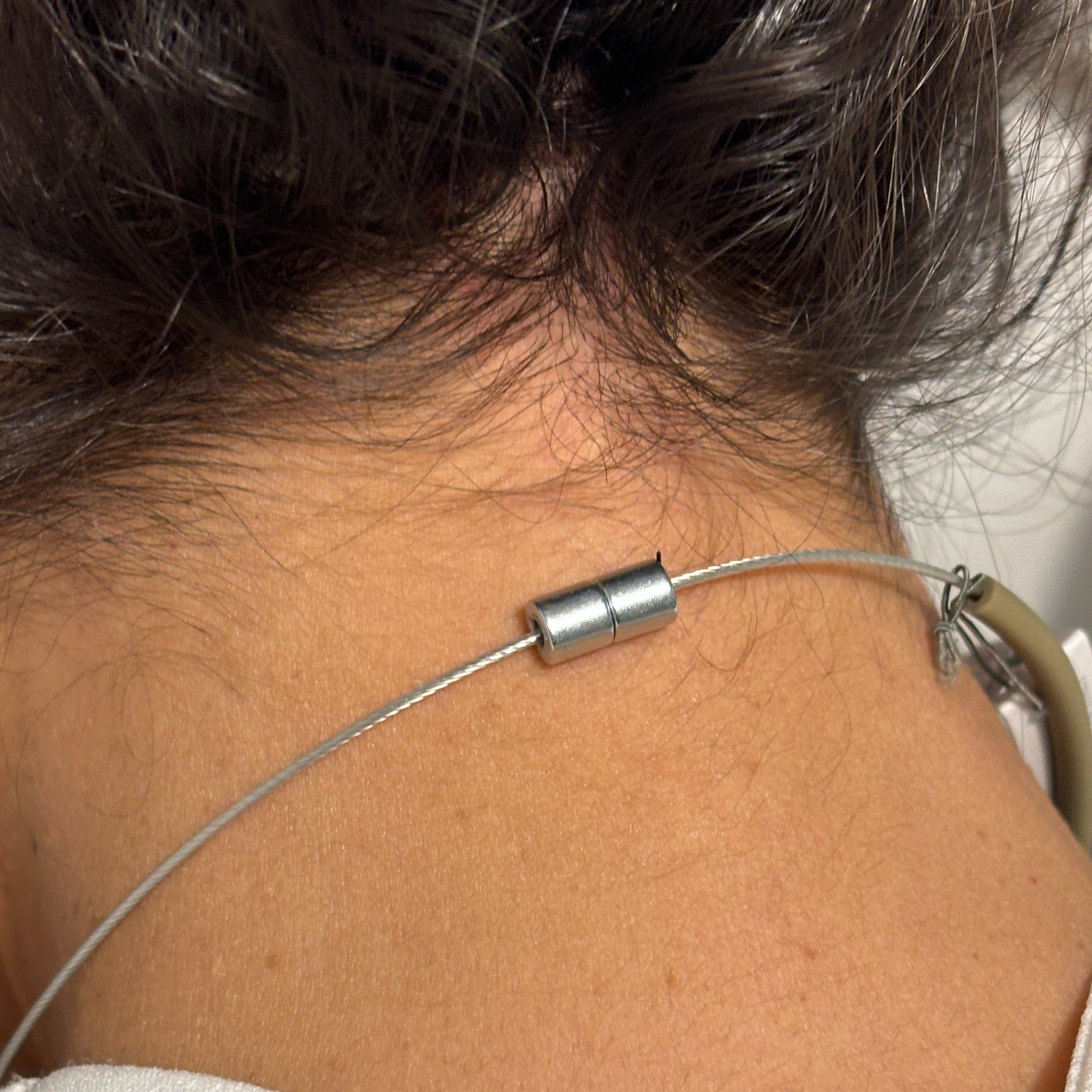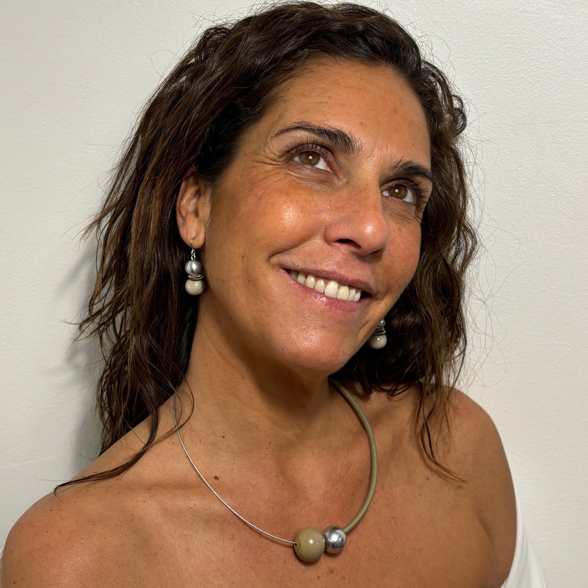 El collar juega con la asimetría sutil y la mezcla de materiales: la perla de Murano trabajada a soplete, en un tono beige arena con matices marfil, aporta calidez y textura, mientras la perla de aluminio introduce luz y contraste. El tubo de PVC en tono verde oliva suave, casi empolvado, envuelve el cuello con una presencia moderna, natural y ligera.