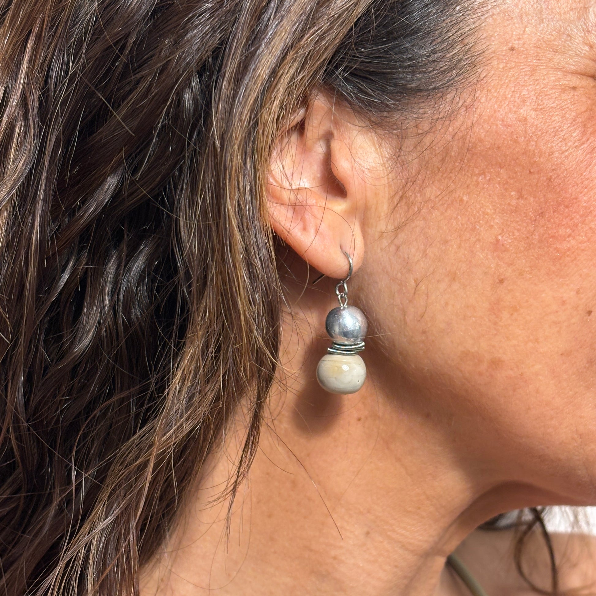Los pendientes acompañan el conjunto con equilibrio y delicadeza, combinando volumen contenido, brillo satinado y una armonía cromática que refuerza su carácter atemporal, a medio camino entre lo orgánico y lo contemporáneo.