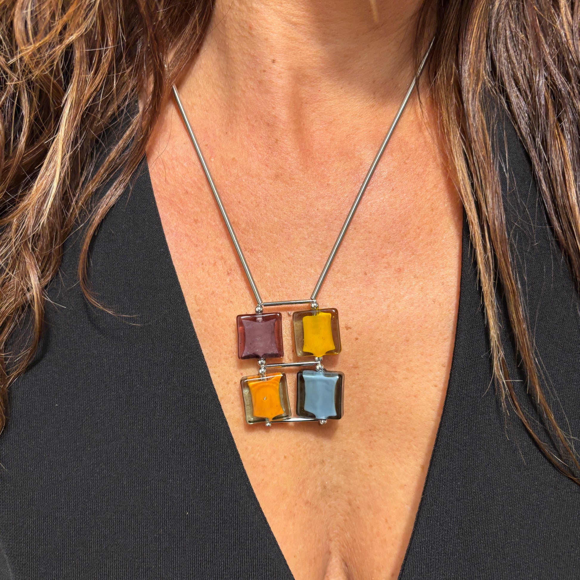 El collar mantiene una estructura limpia y ligera, donde el protagonismo recae en el vidrio trabajado artesanalmente, montado sobre una base de acero que aporta equilibrio y modernidad.