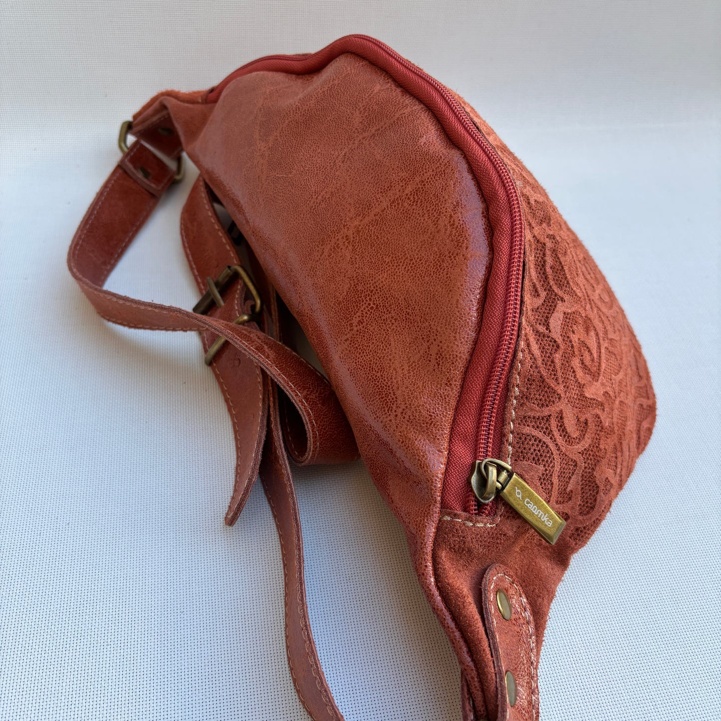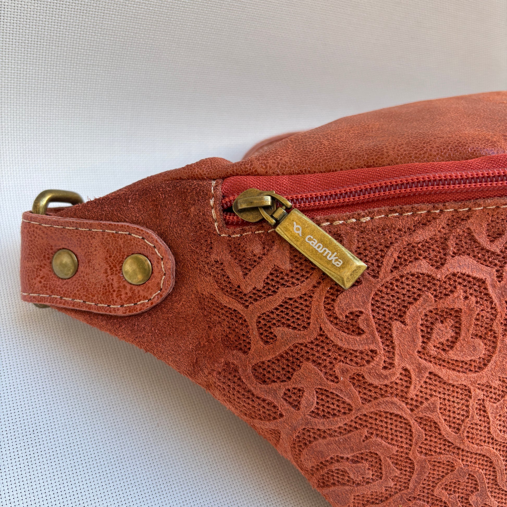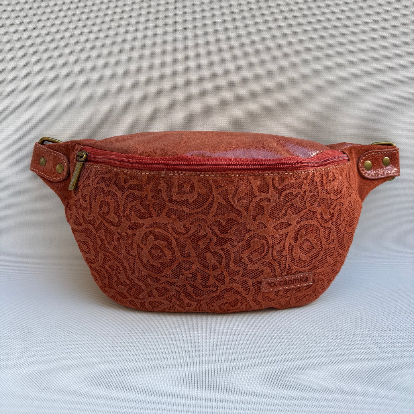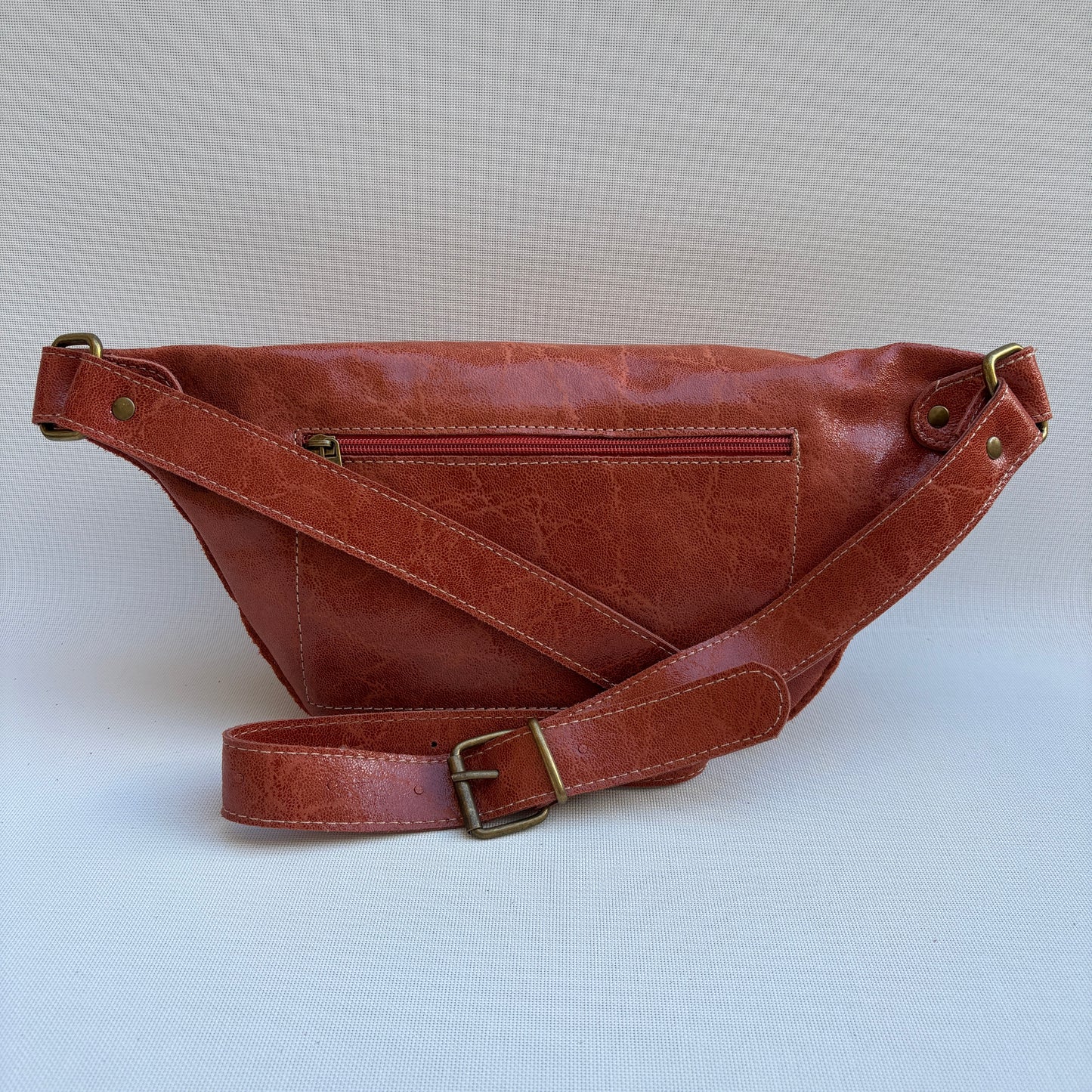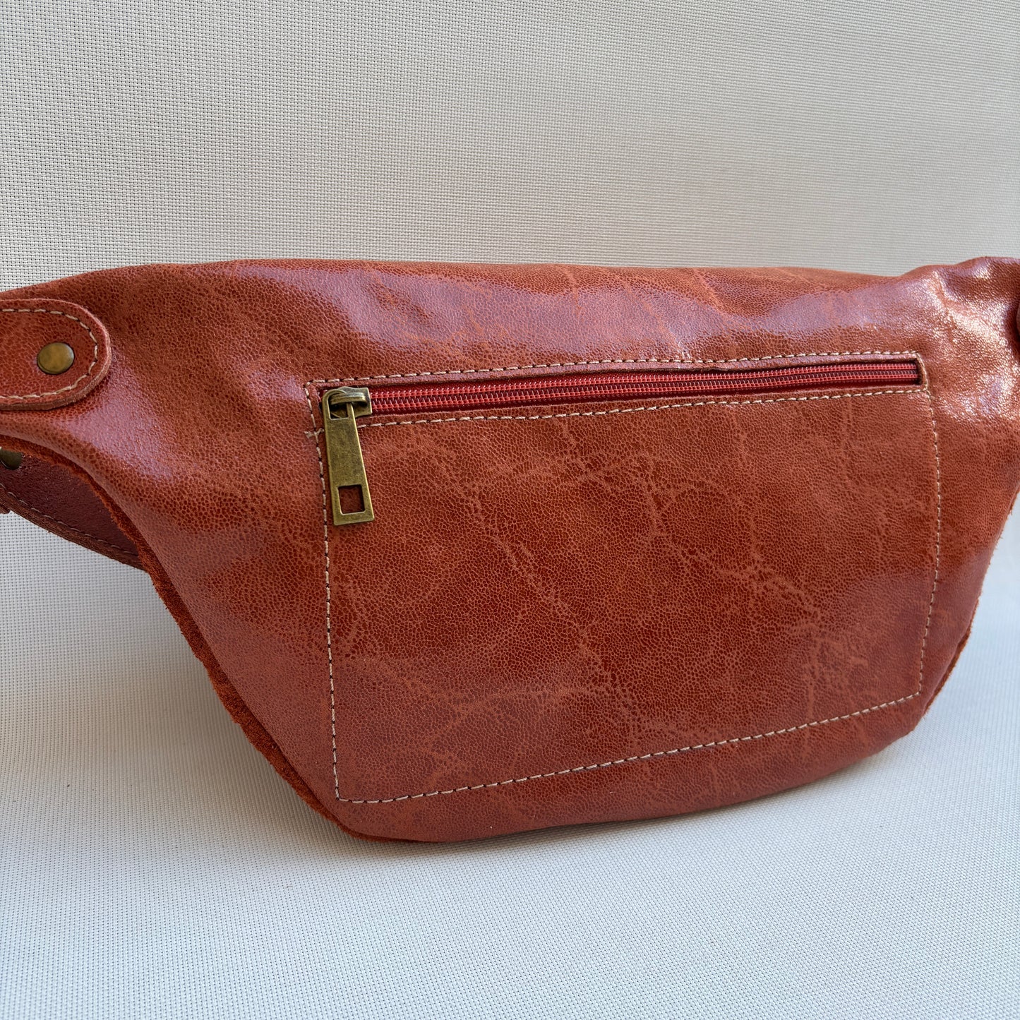 Riñonera confeccionada en piel con un barniz especial para facilitar su cuidado y protección.