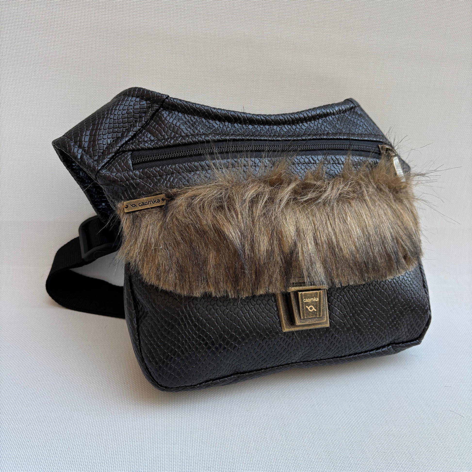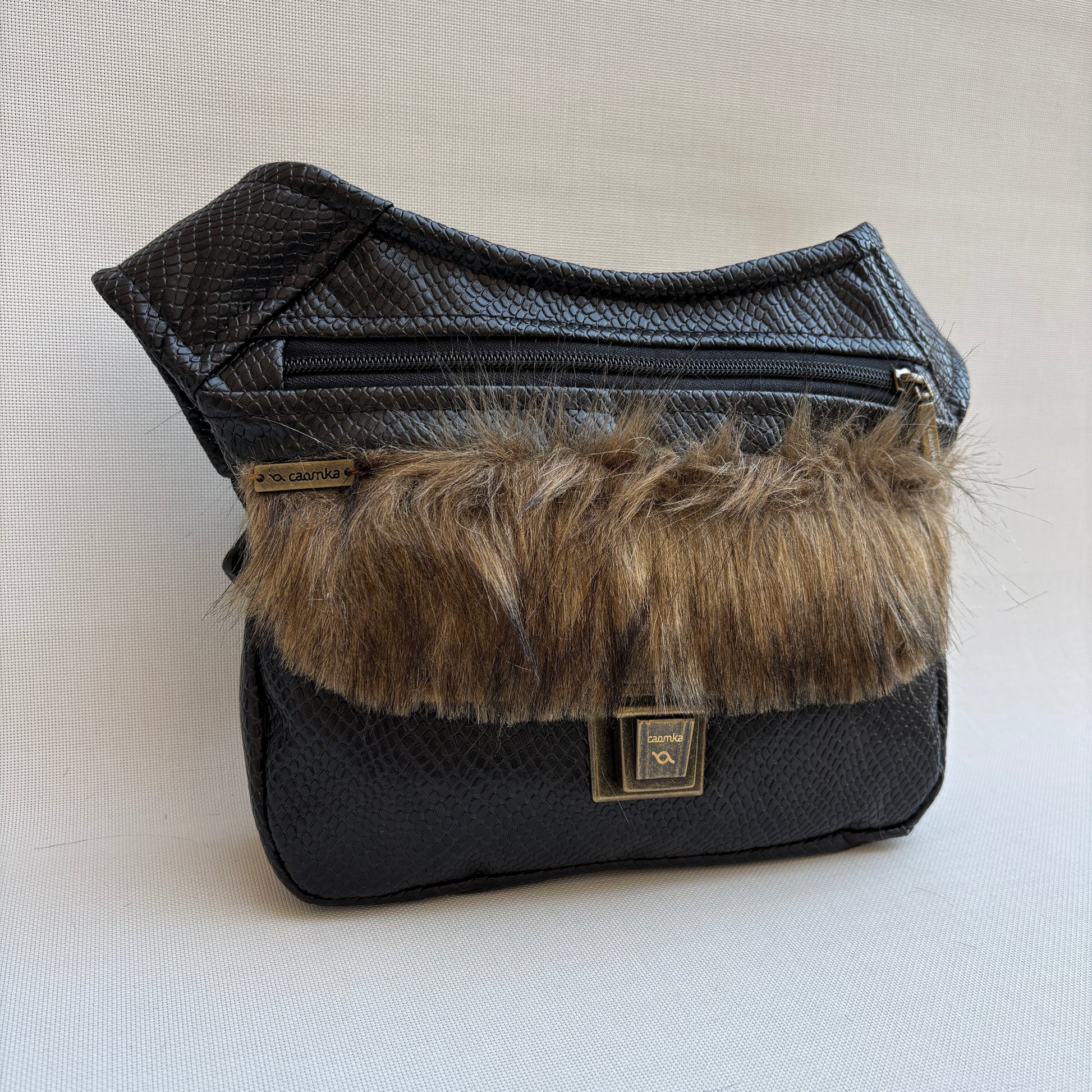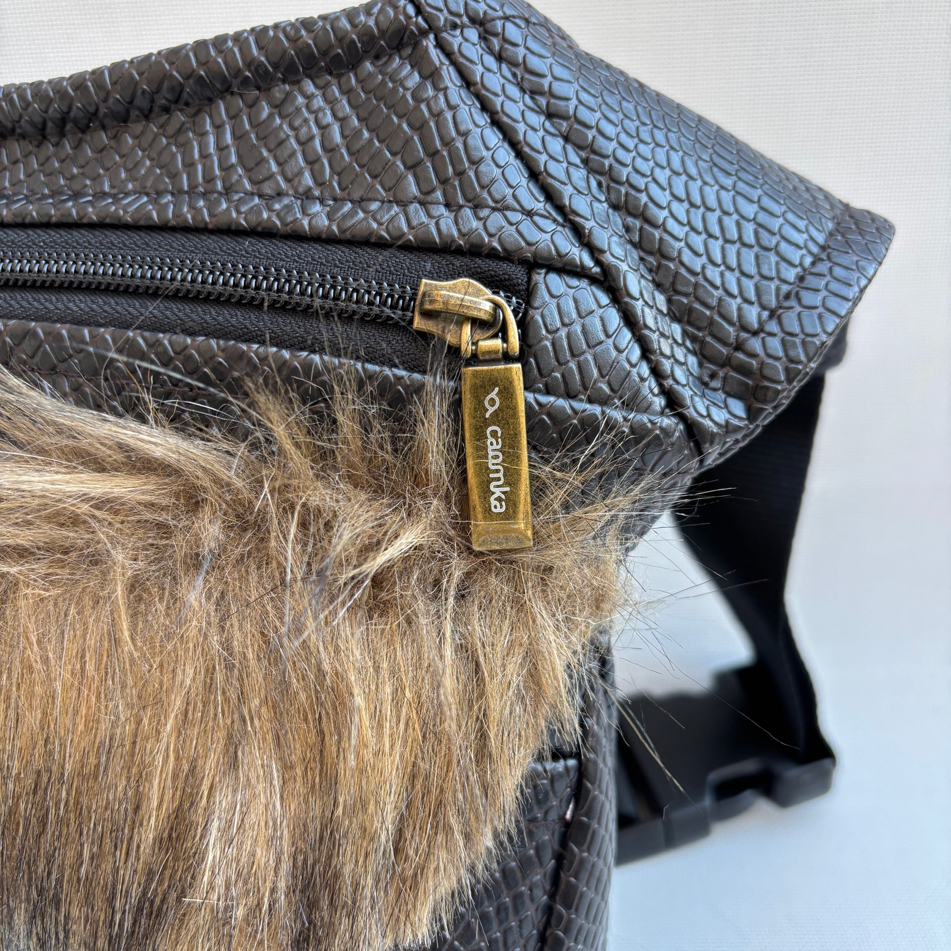 Color: Marrón oscuro con textura efecto reptil y solapa frontal en pelo sintético en tonos naturales