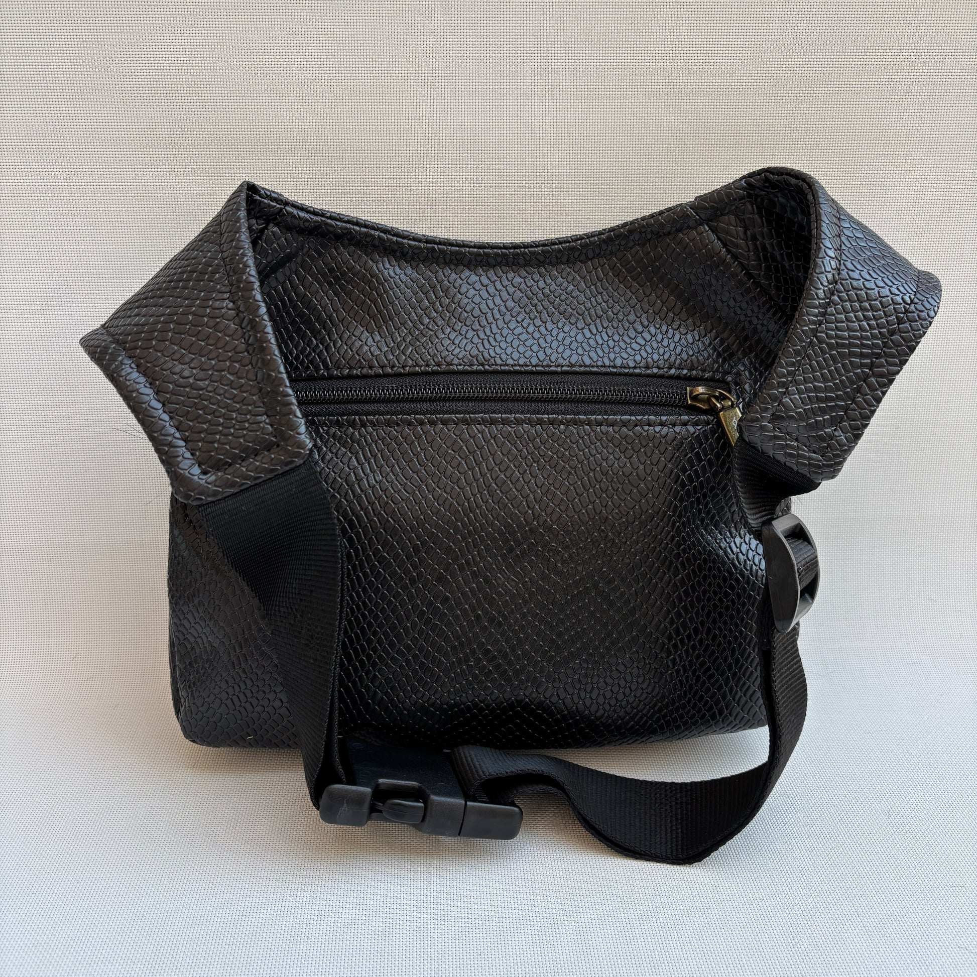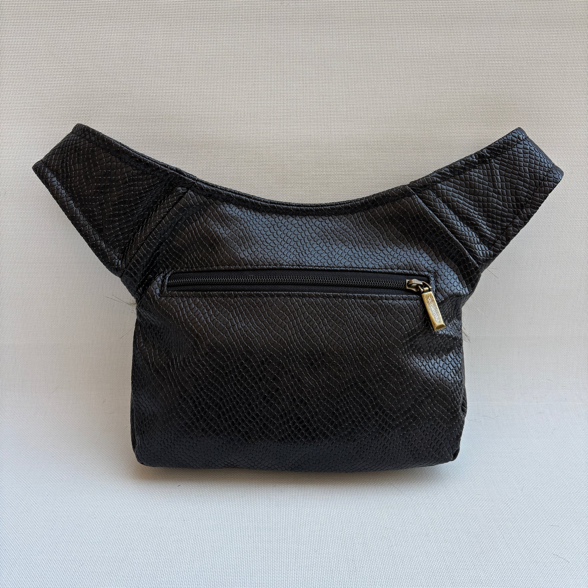 Cuerpo confeccionado en polipiel marrón con textura efecto reptil