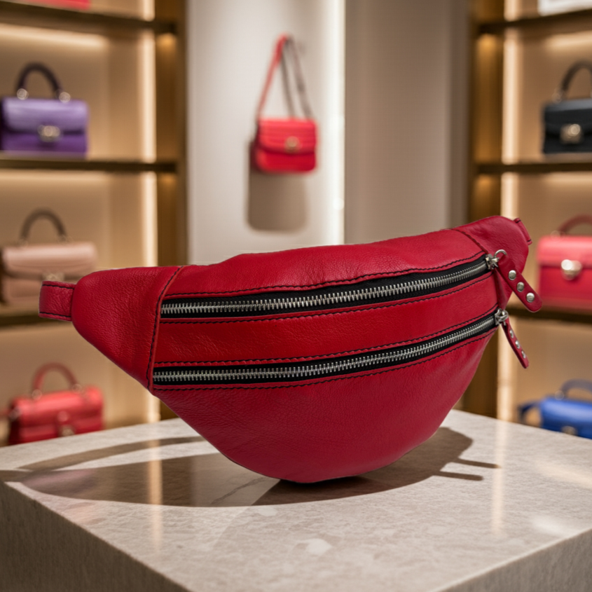 Back pocket with opening (19 cm.) + Silver zipper and leather handle with matching studs.