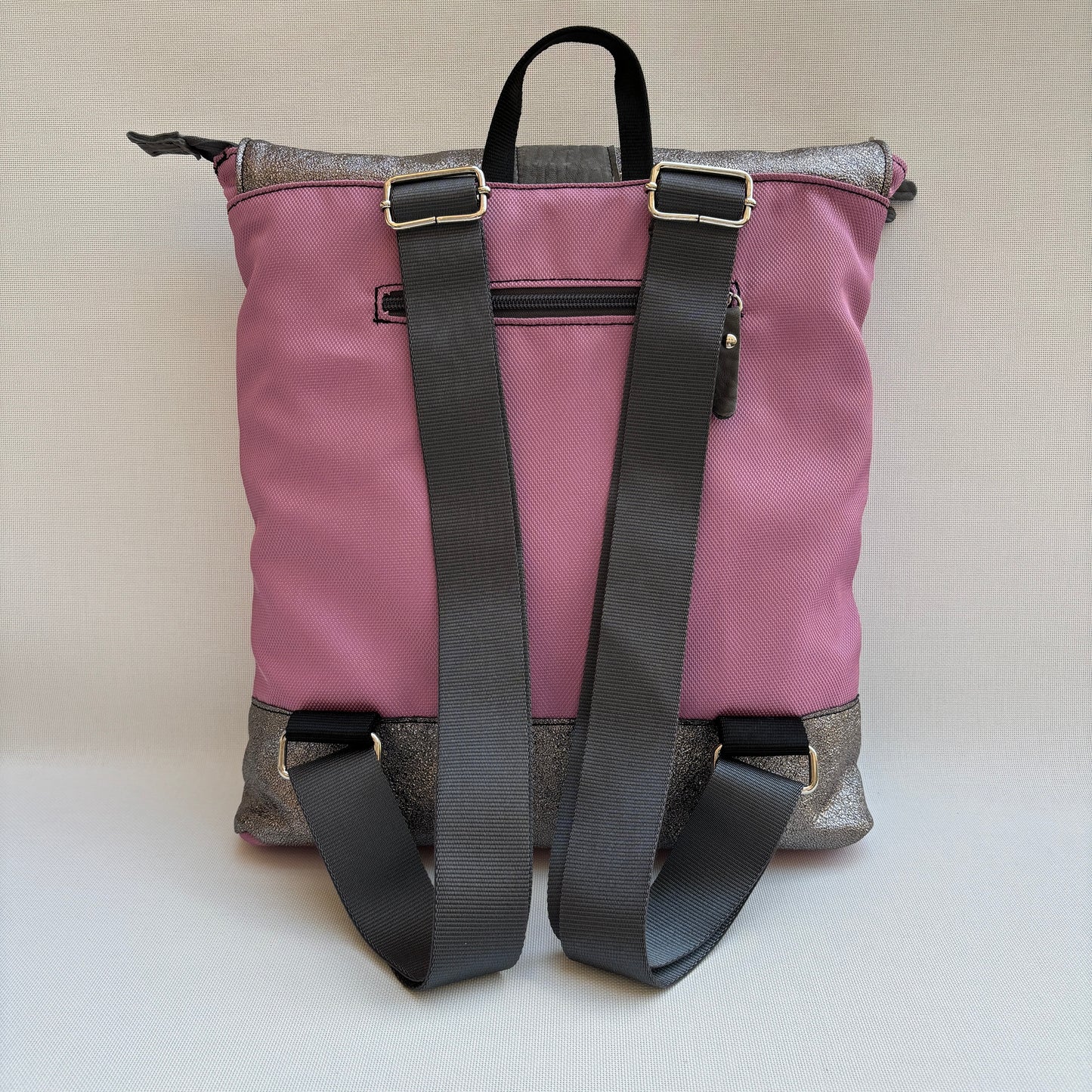 Bolsillo trasero con cremallera de nylon a juego con tirador especial de piel contrastado.