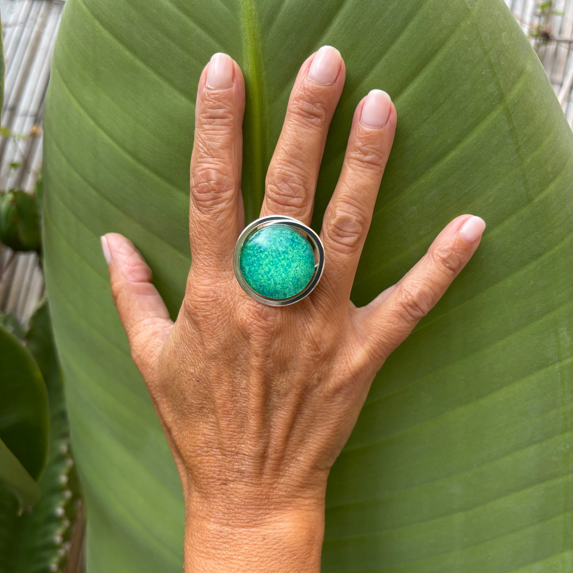 Anillo Plata "Sol Esmeralda" – Vidrio fundido y latón bañado en plata.
