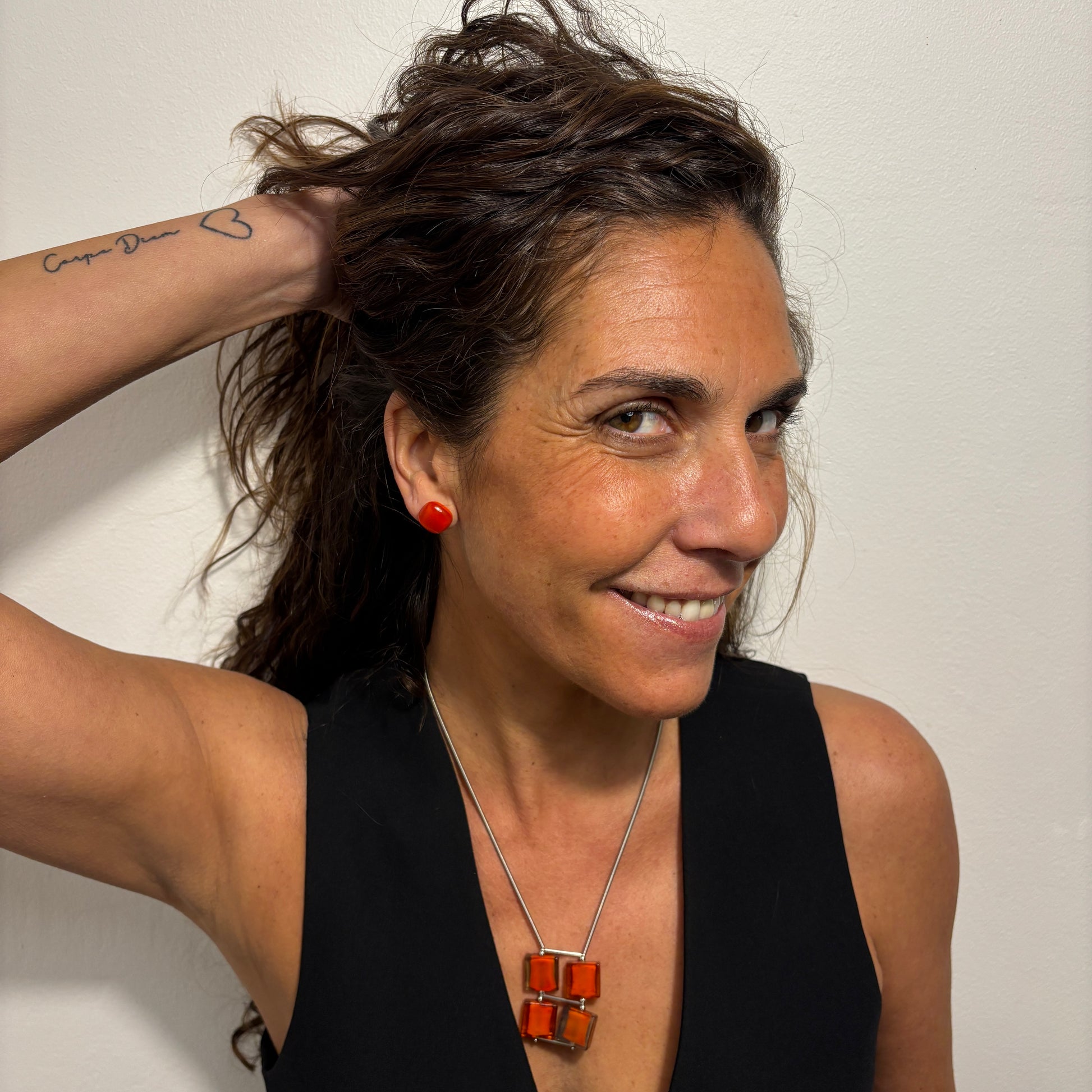 El collar construye su carácter a partir de cuatro piezas de vidrio trabajadas a soplete, dispuestas en una composición geométrica equilibrada y dinámica. Los tonos ámbar, naranja profundo y matices miel crean una sensación de fuego sereno, con transparencias que cambian según el movimiento y la incidencia de la luz.
