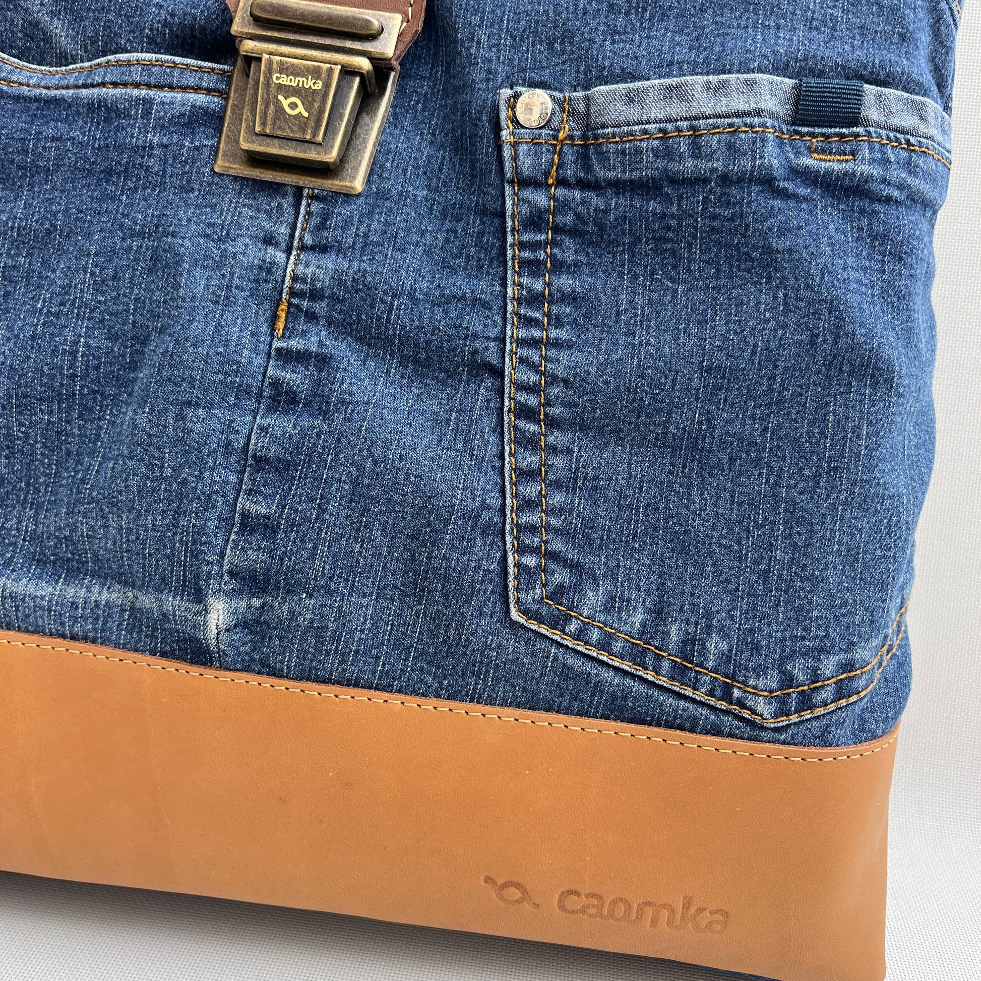 Mochila Caomka ultraligera confeccionada con tejido procedente de vaqueros reutilizados combinados con piel/cuero.
