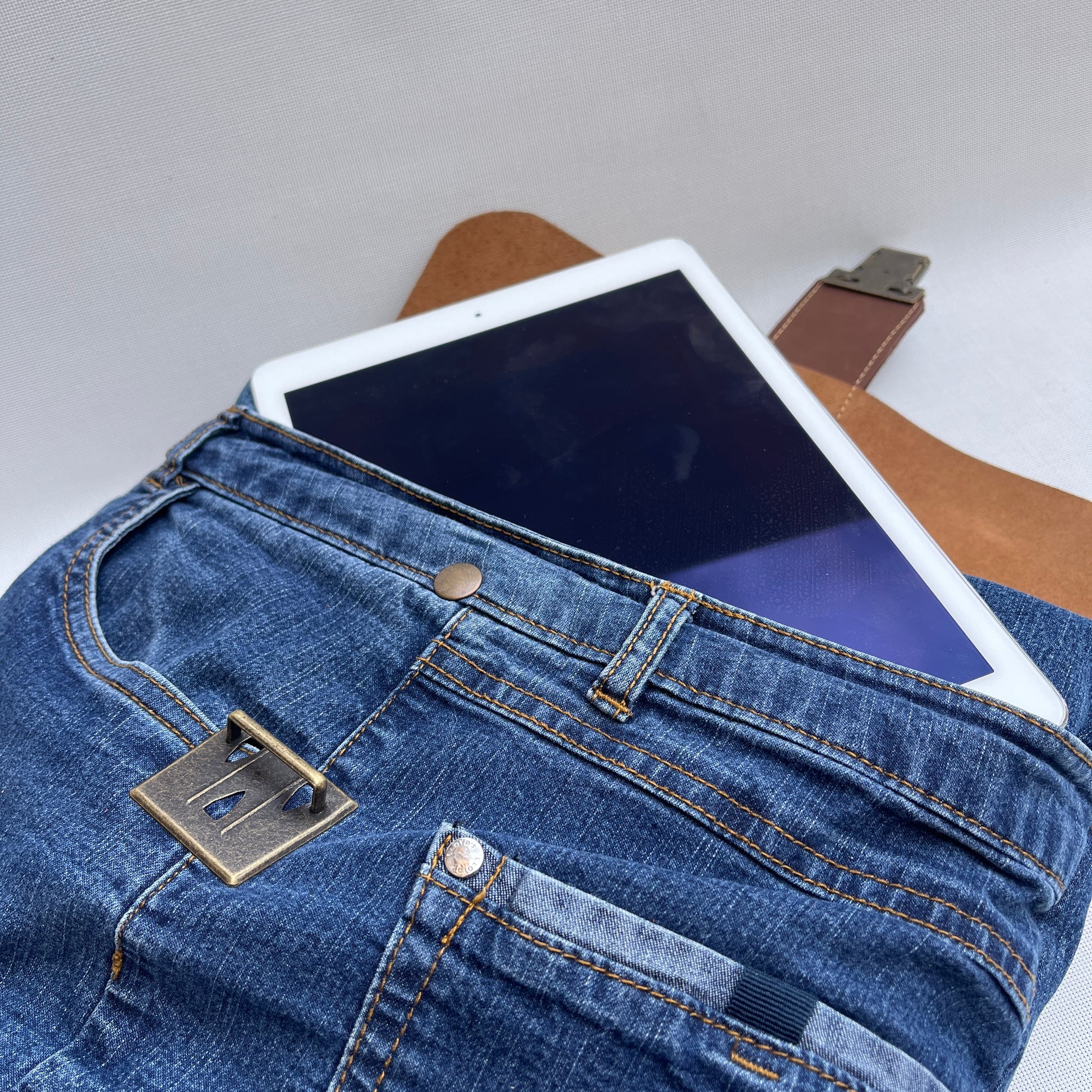 Bolsillo principal delantero en cuero en color contrastado al estilo y personalidad Caomka con cierre vintage "Click Clack" en color oro viejo.