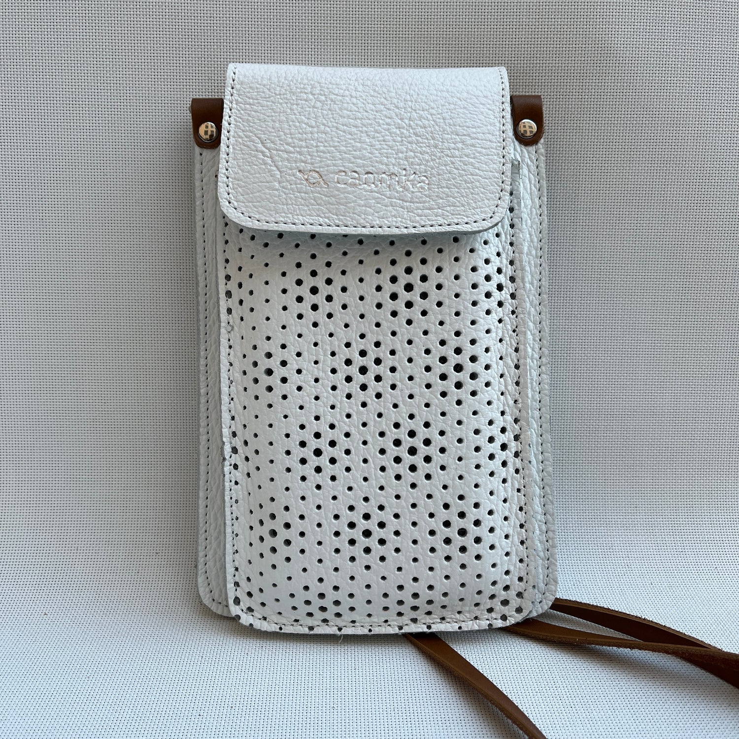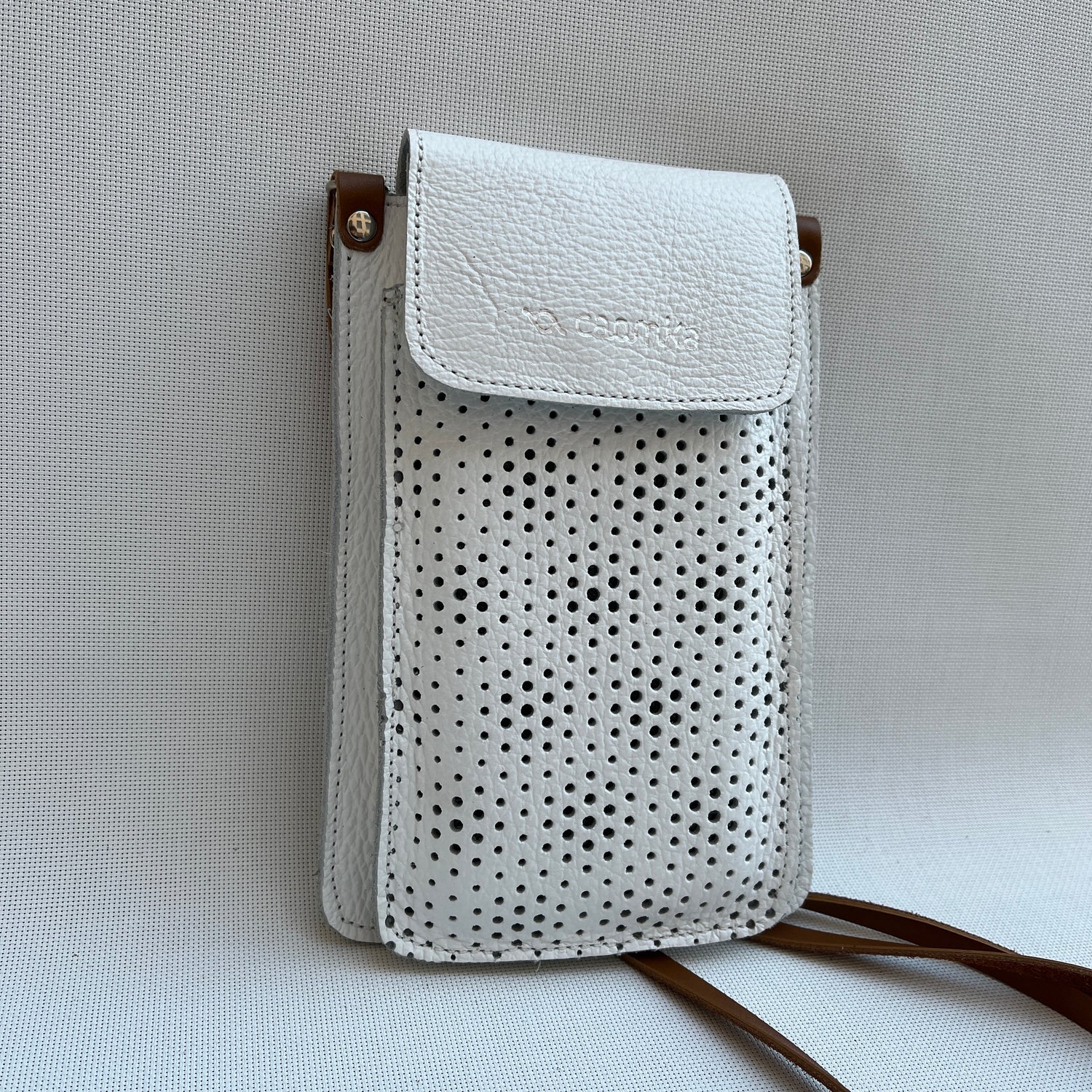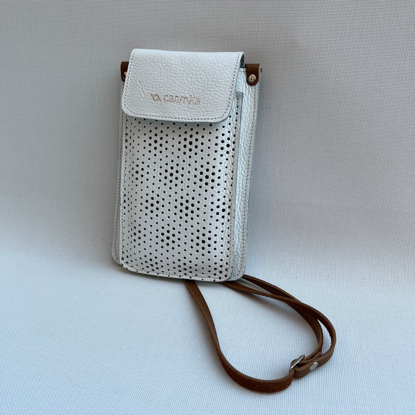 Bolsito ideal para llevar el móvil en piel natural perforada.