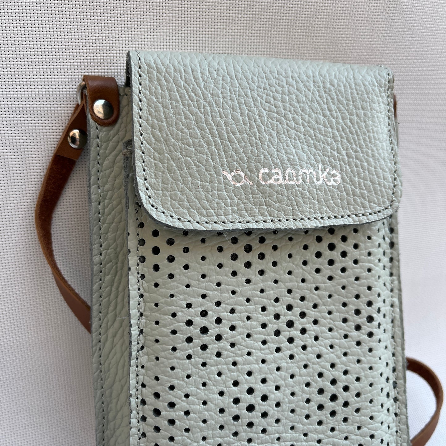Bolsito ideal para llevar el móvil en piel natural perforada.
