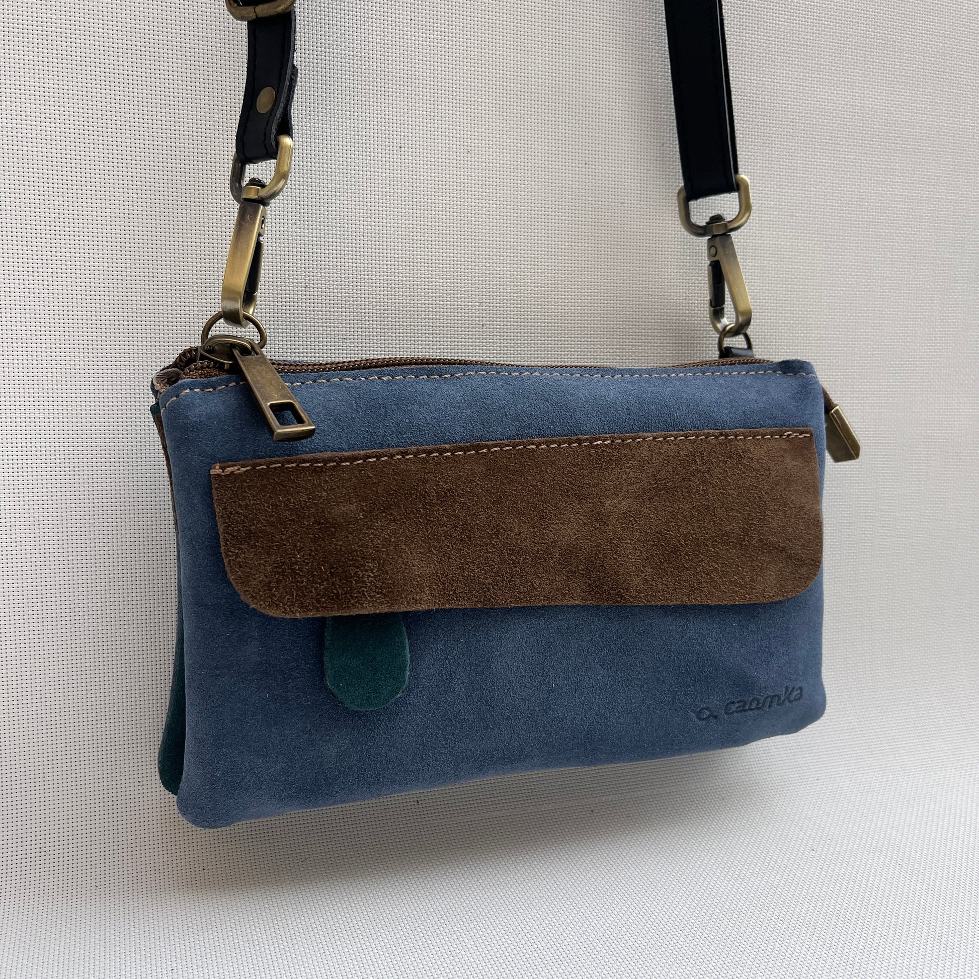Bolso de mano, riñonera, bolsito para llevar cruzado o en el hombro. MULTIFUNCIÓN (Riñonera - Bolso - Bandolera - Bolso de mano) confeccionado en piel de serraje en una original combinación de colores.