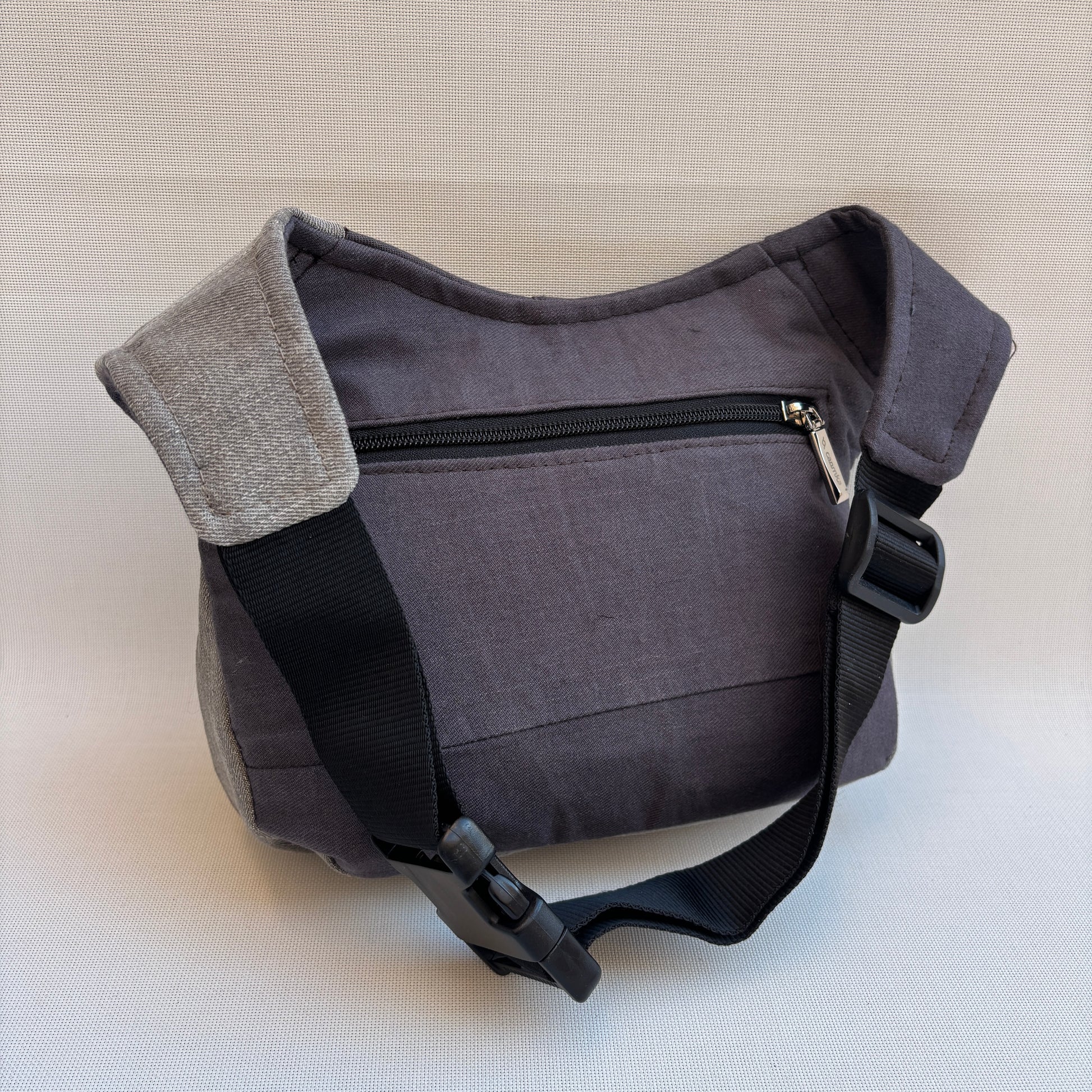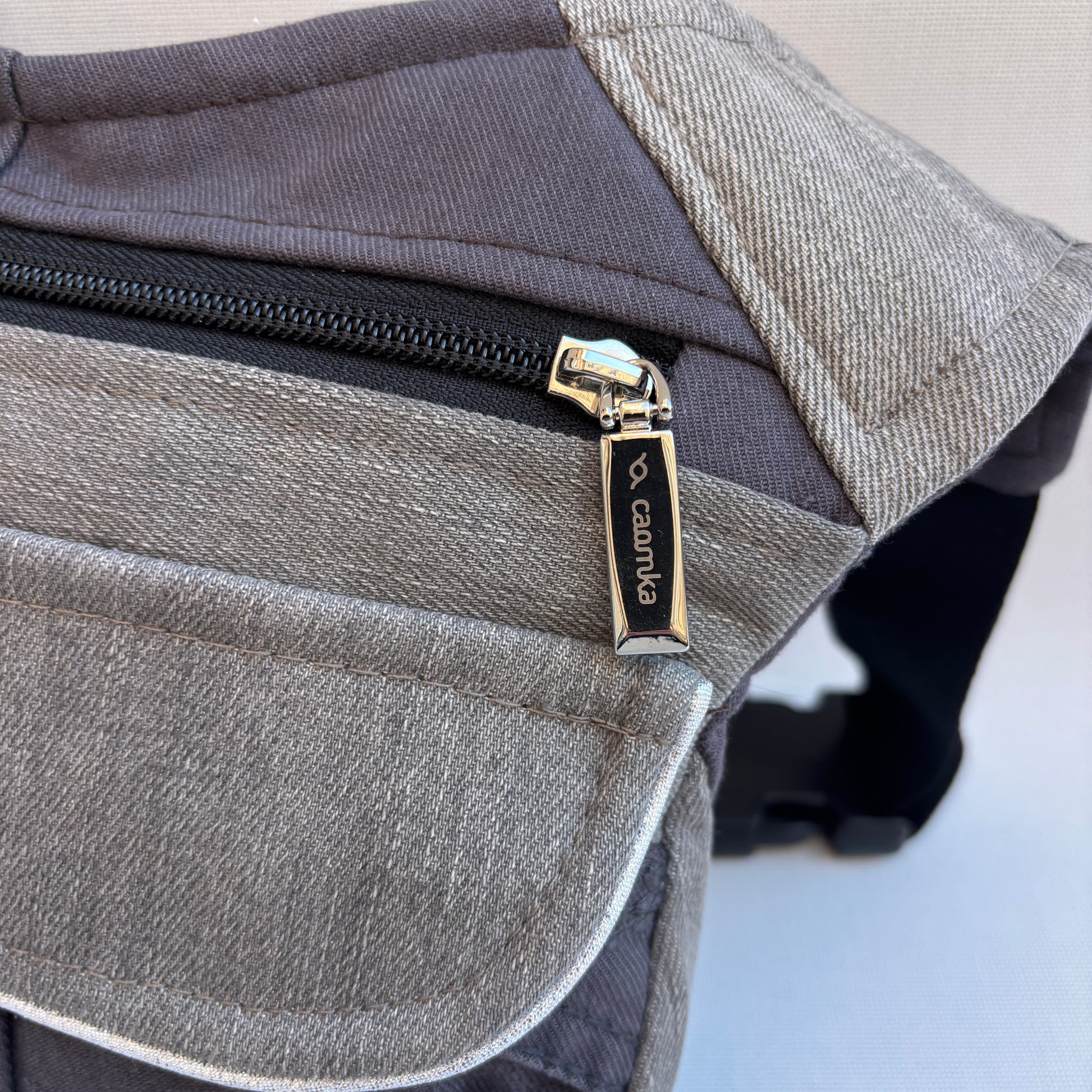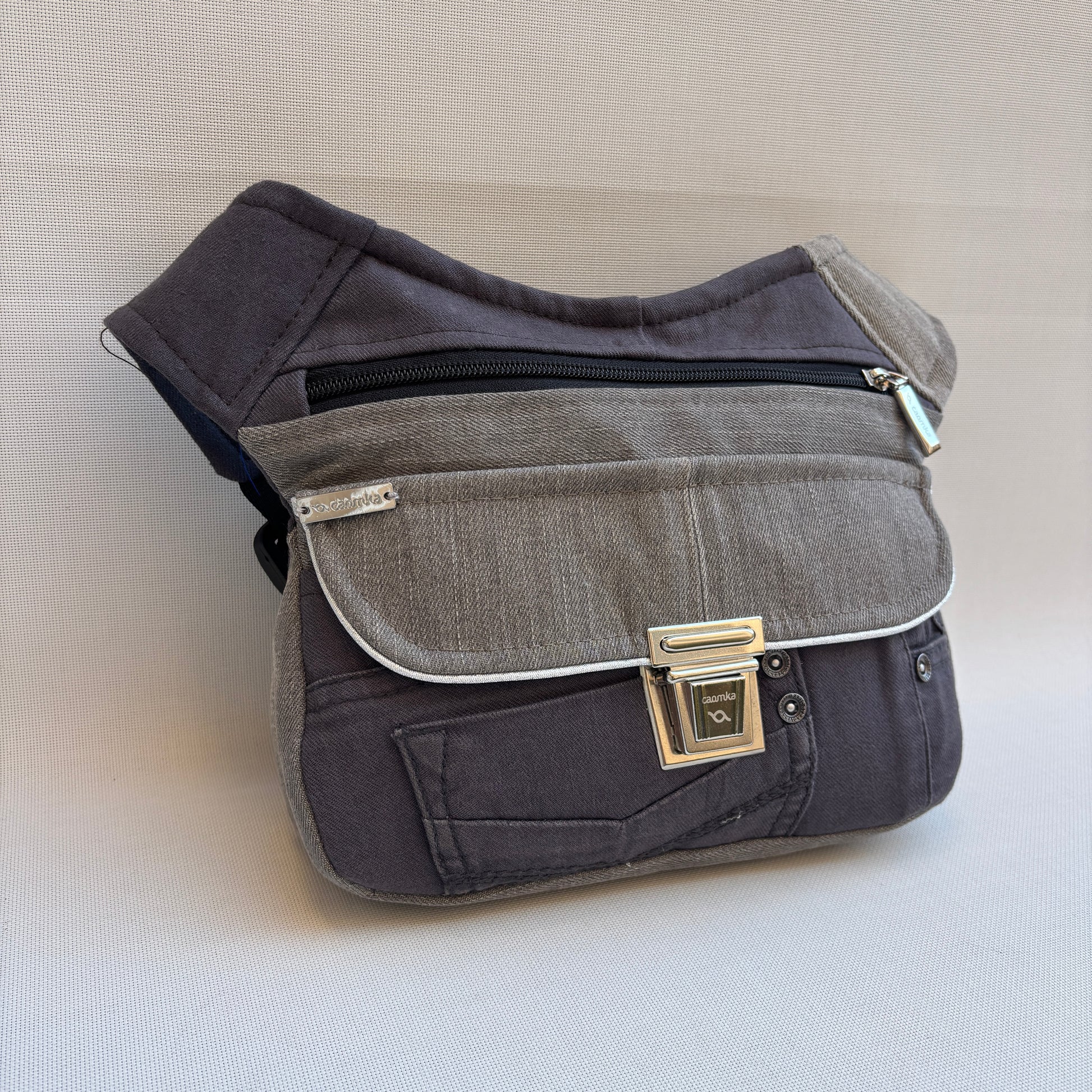 Cuerpo principal en denim reciclado gris antracita, resistente y duradero.