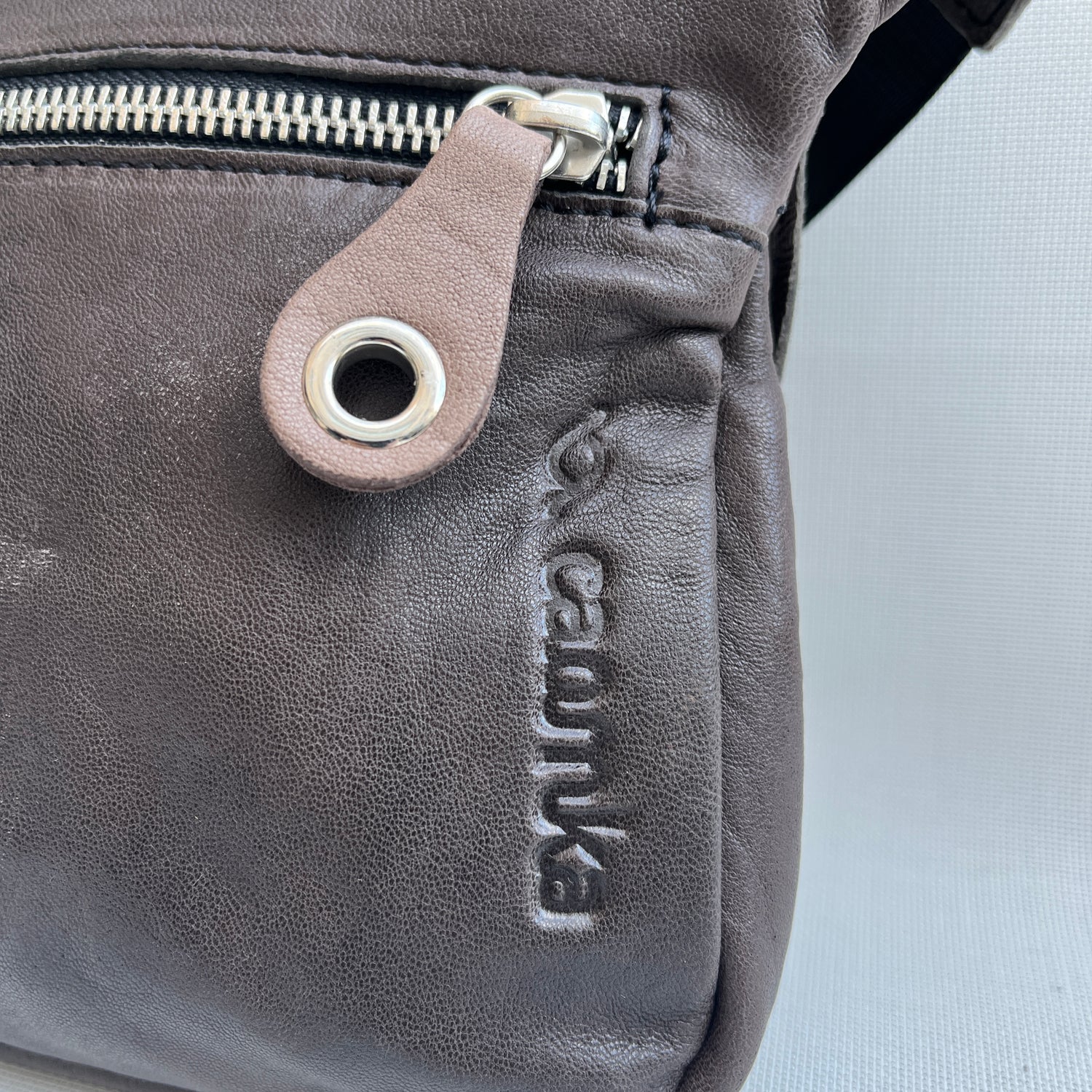Bolsillo trasero extra con cremallera en Plata y tirador especial de piel.